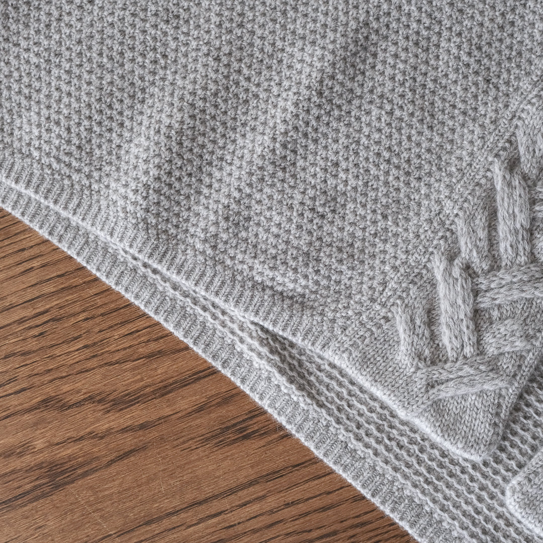 カラーはバルキーグレー。2色のロウカシミヤ(染色をしていないカシミヤ)とヤクの黒をわたの状態で混ぜ、それを紡績した糸で編み立てることで、自然の色だけで奥行きのあるミックスカラーを表現することがきました。