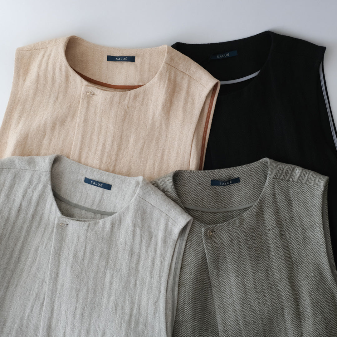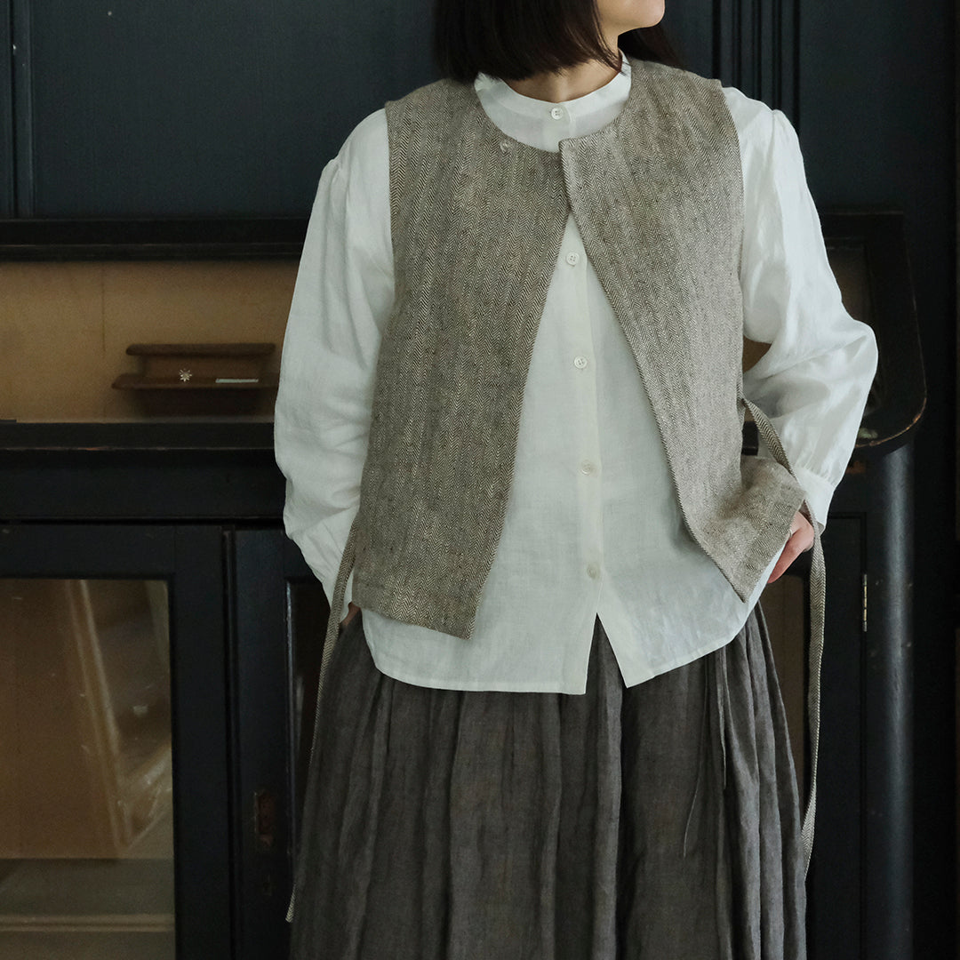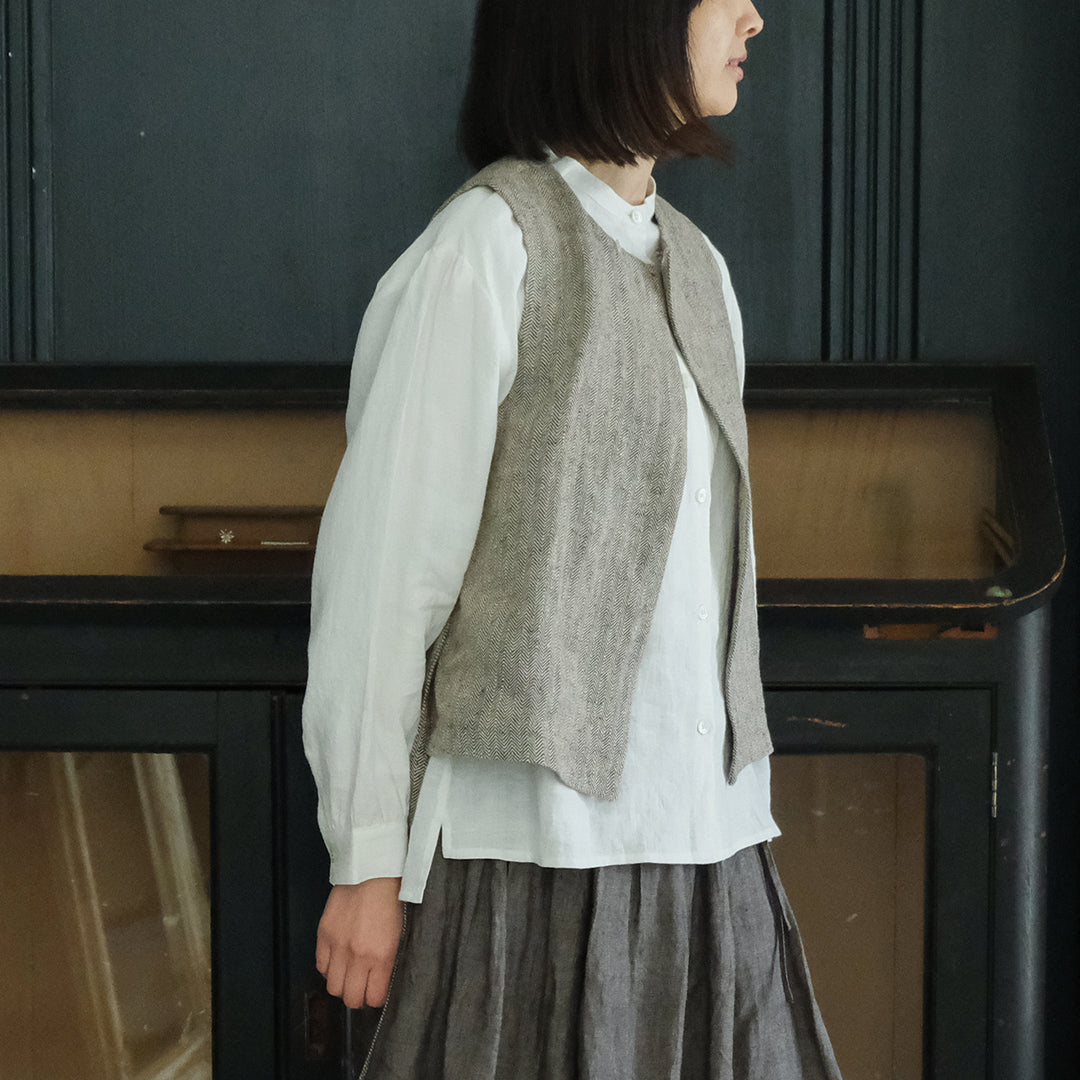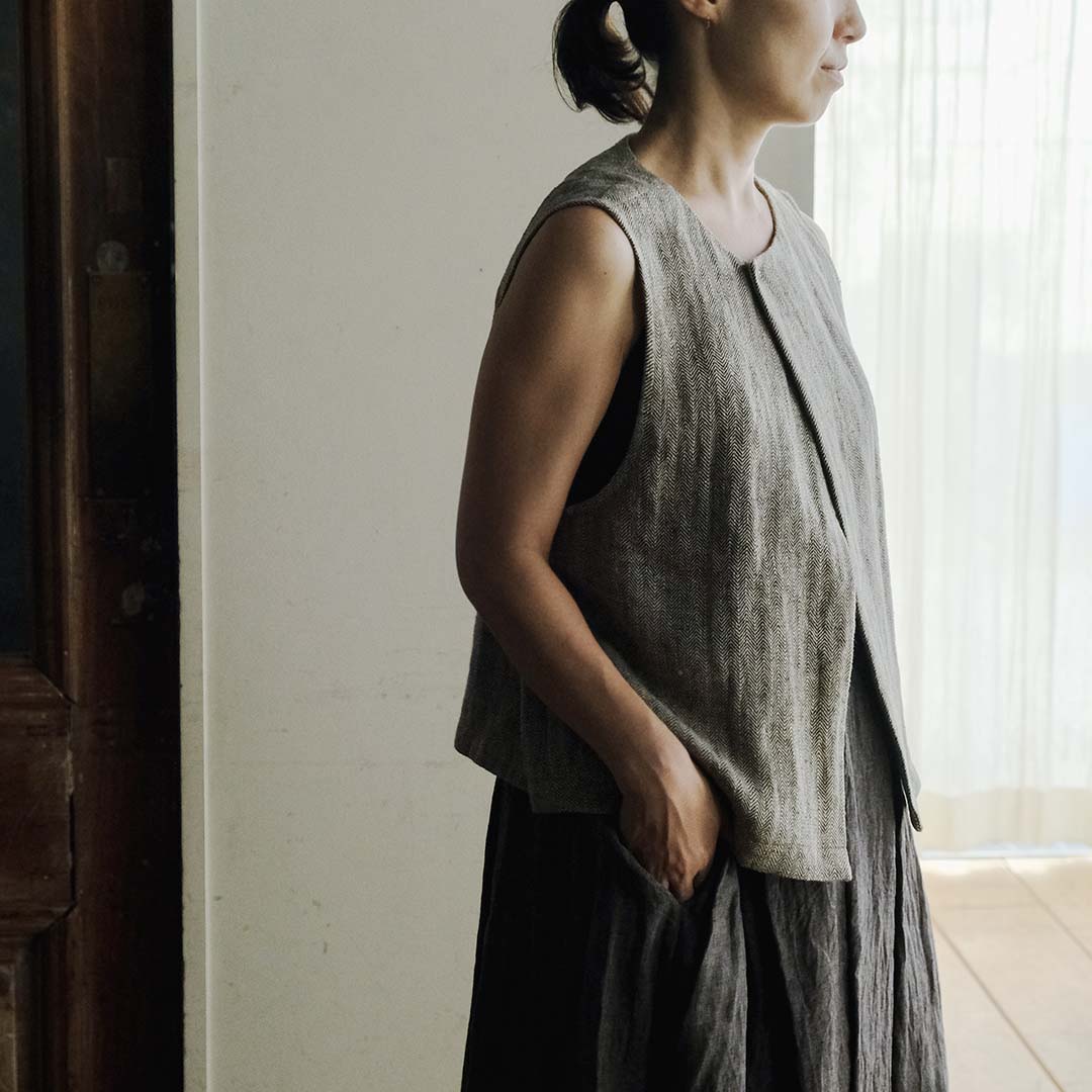 シャツやワンピースの上に合わせて、ジャケットとボトムスでスリーピースでも……。装う楽しさを教えてくれるリネンヘリンボーンでつくった万能アイテム、ジレをご紹介します。