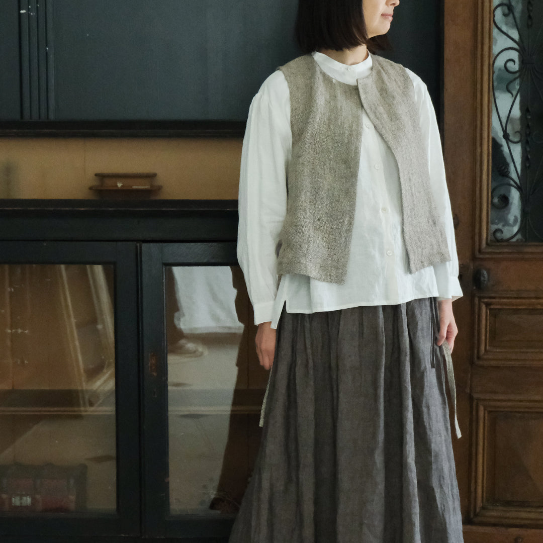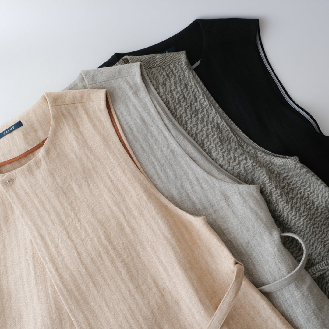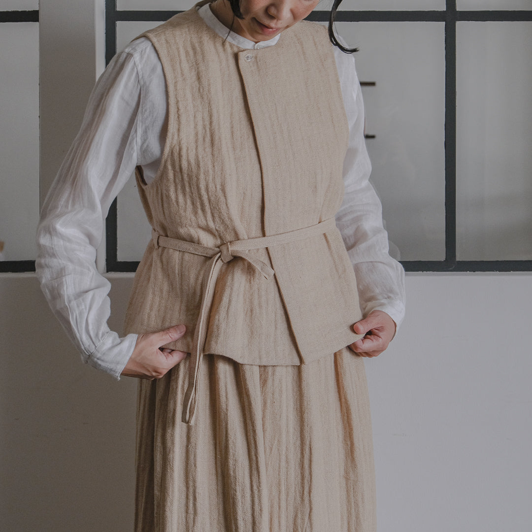 シャツやワンピースの上に合わせて、ジャケットとボトムスでスリーピースでも……。装う楽しさを教えてくれるリネンヘリンボーンでつくった万能アイテム、ジレをご紹介します。
