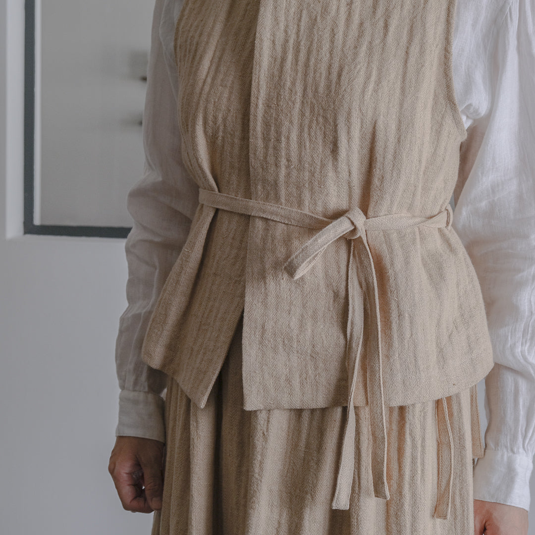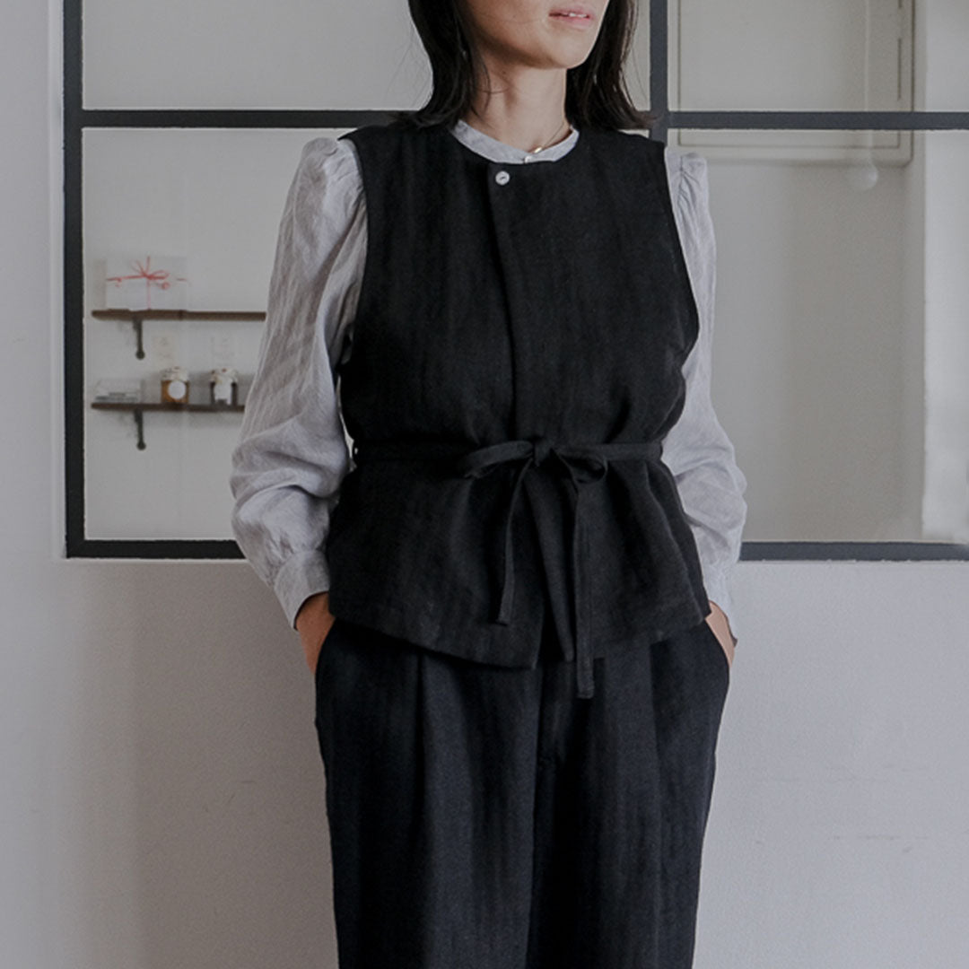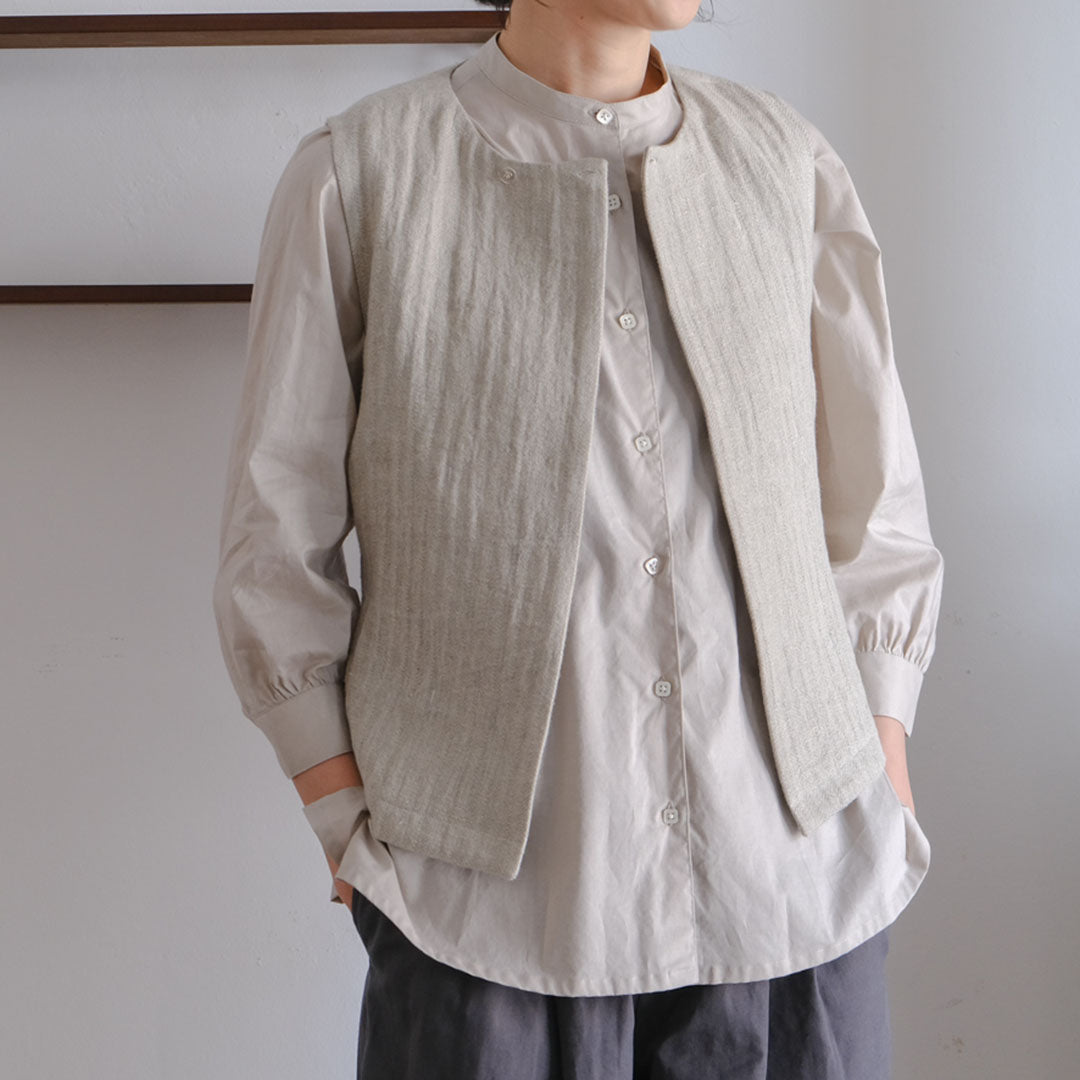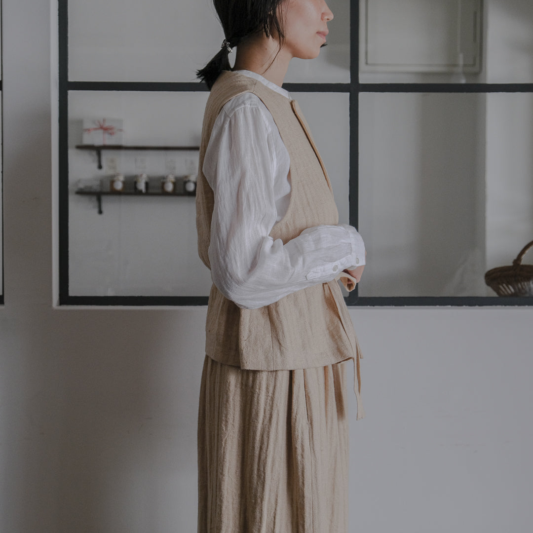 シャツやワンピースの上に合わせて、ジャケットとボトムスでスリーピースでも……。装う楽しさを教えてくれるリネンヘリンボーンでつくった万能アイテム、ジレをご紹介します。
