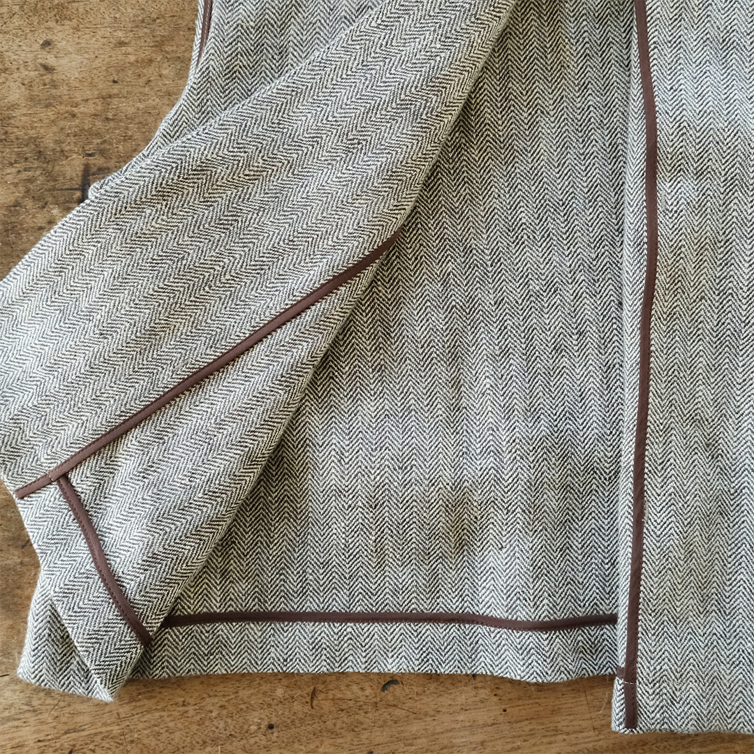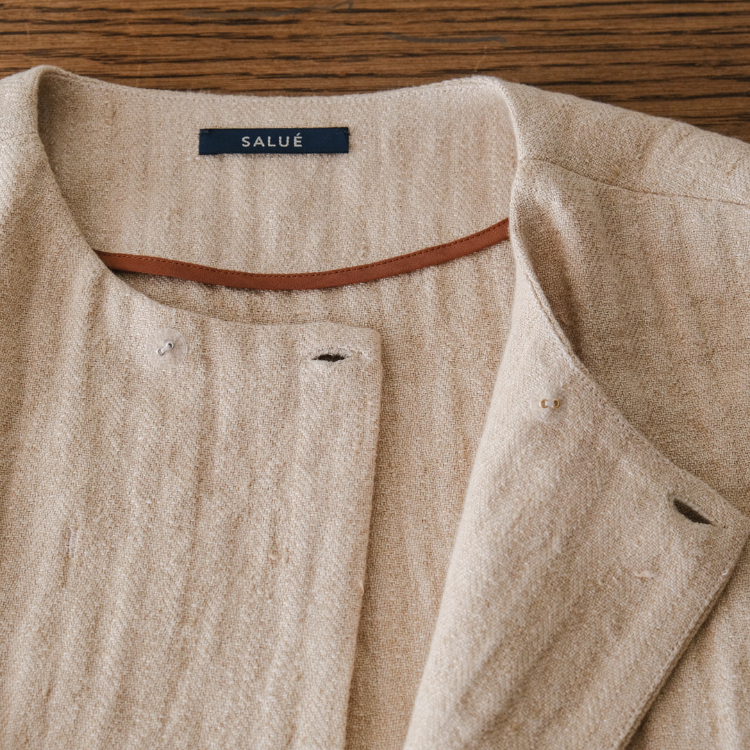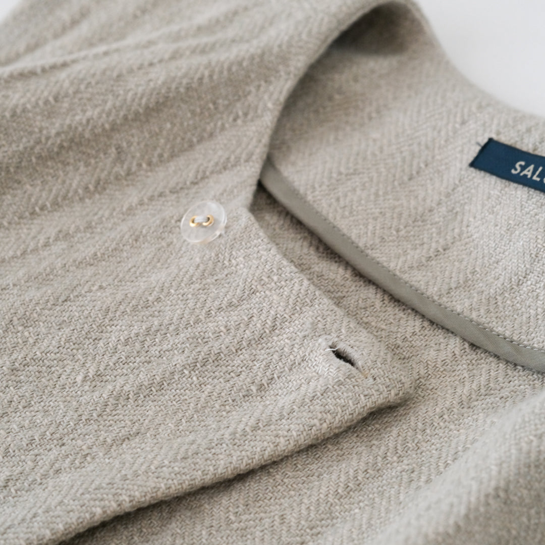 経糸がグレー、緯糸がオリーブのメランジ生地です。明るめのグレーと、万能カラーオリーブのヘリンボーンは、ミリタリー寄りにも着こなしやすい SALUÉ オリジナルの特別なカラーです。それぞれのリネン生地に引き立つように配色された、裏の総パイピングもポイントです。