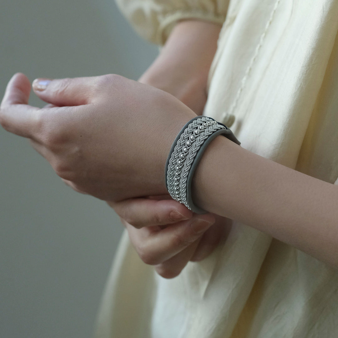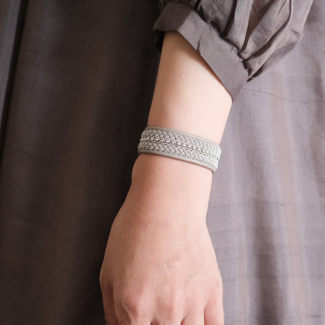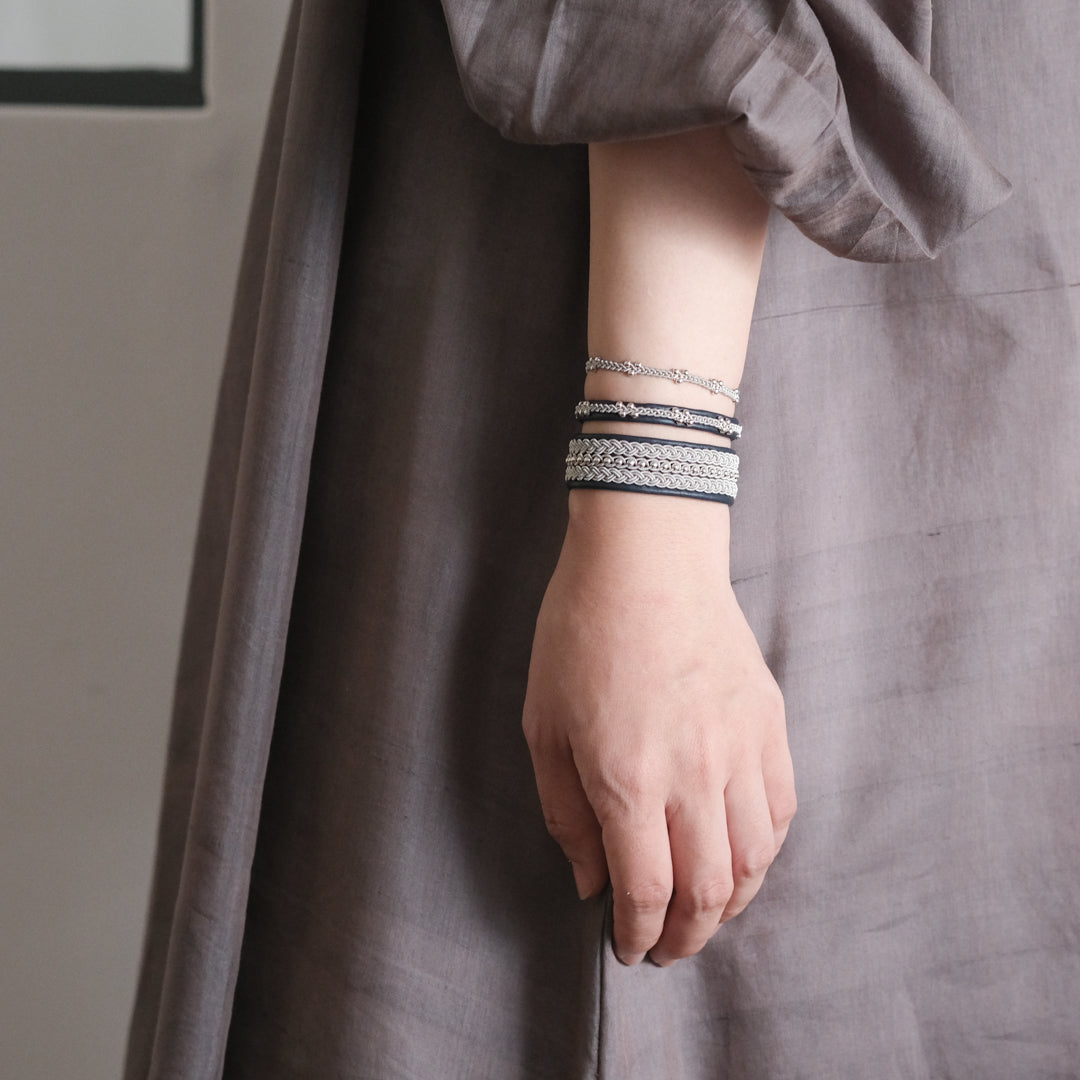 このページでご紹介している「BRC031」は、三つの編み目が並び目を引く美しさ。センターのシルバービーズが華やかさを添えています。