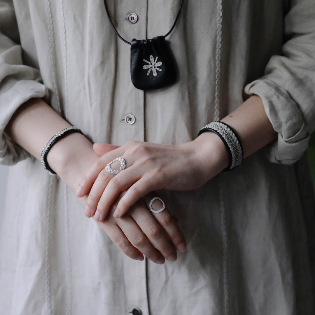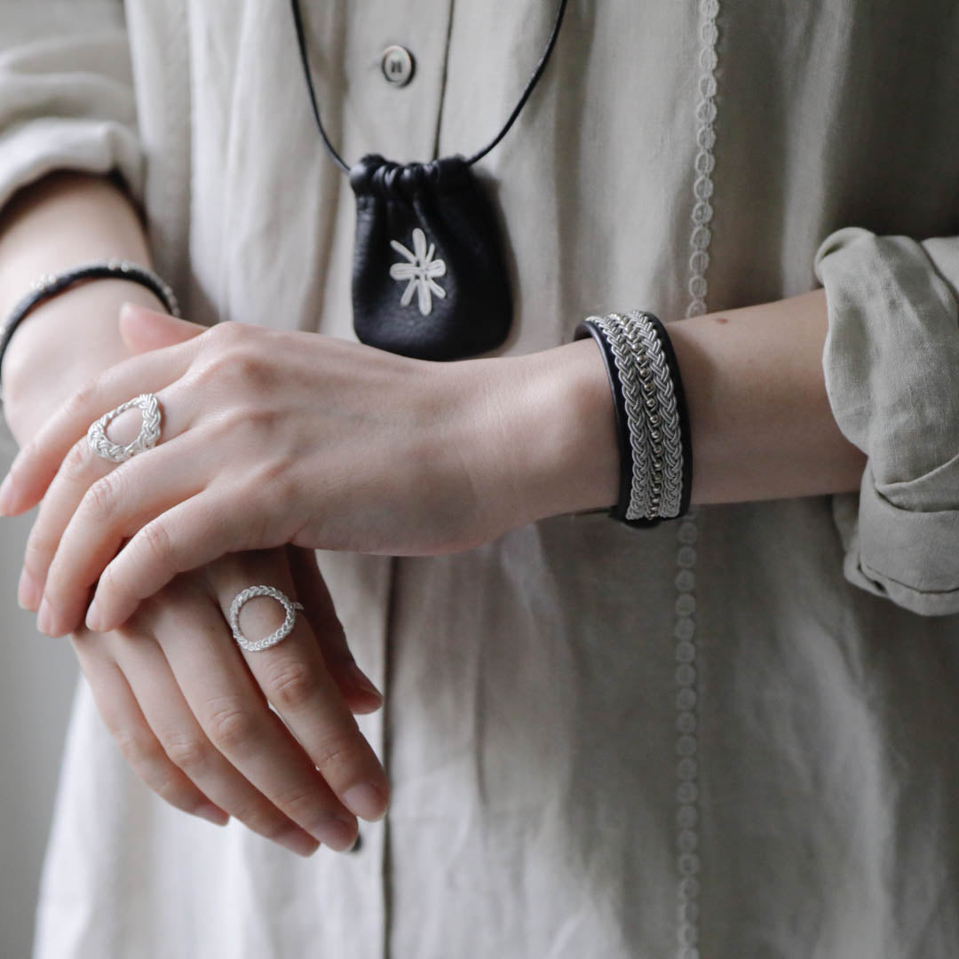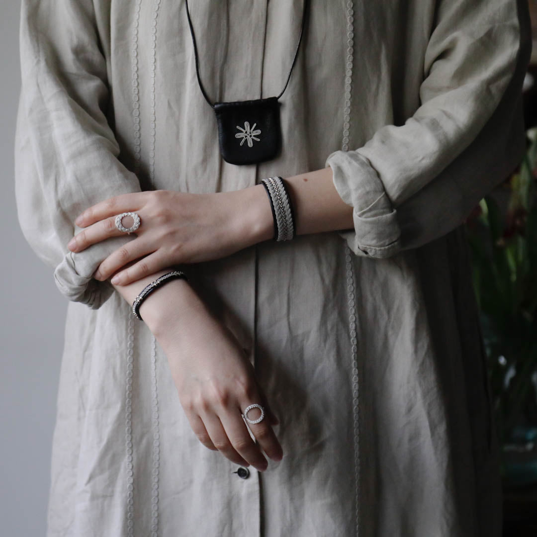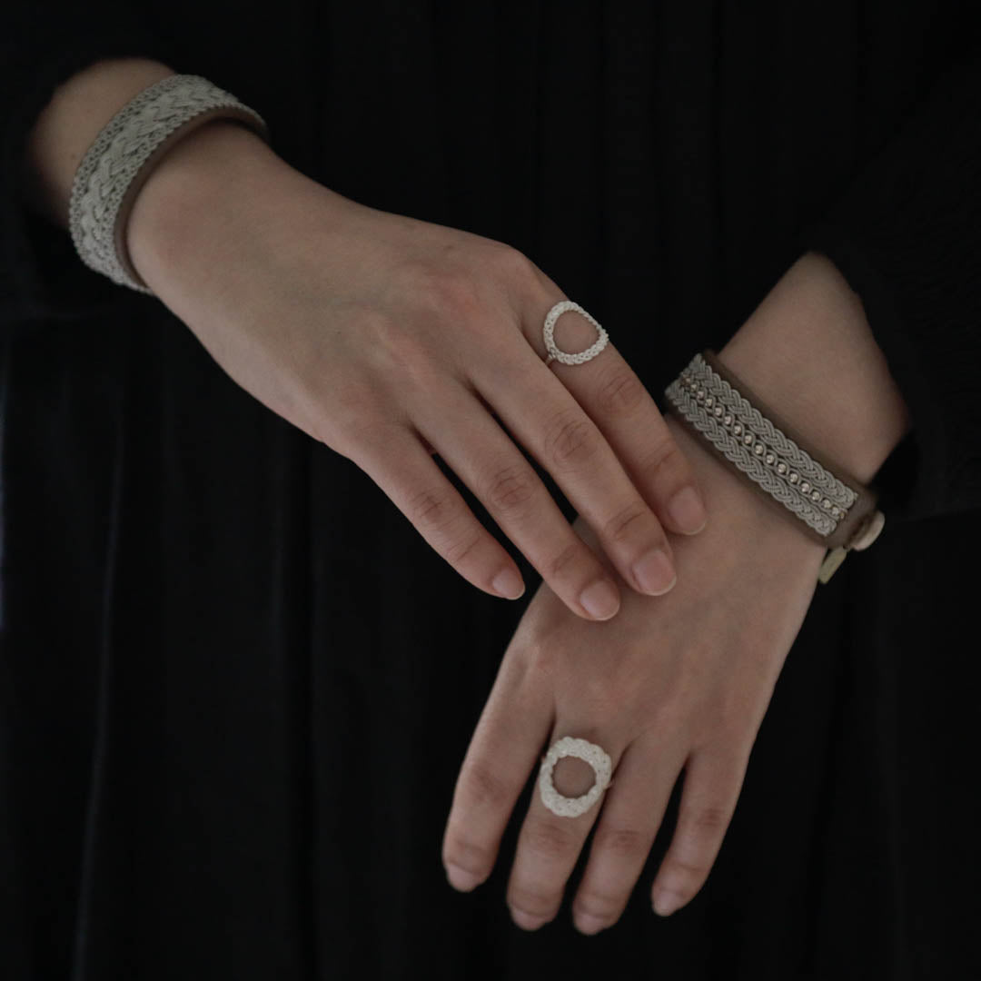 その伝統を取り入れつつ、あえてゆるく編むことでレースのような繊細さを表現。トライバルモードになりすぎず、普段の装いになじみます。