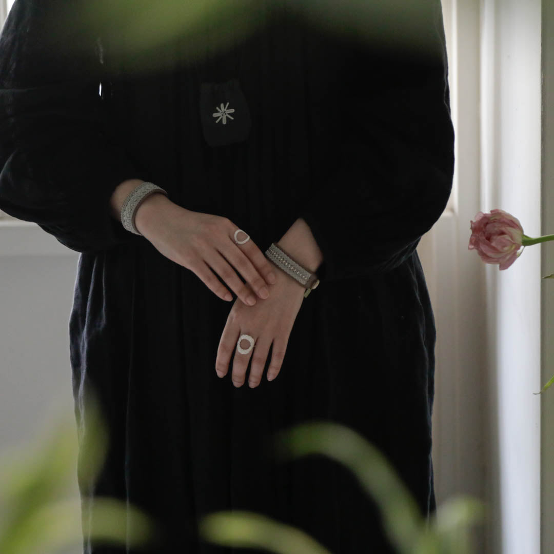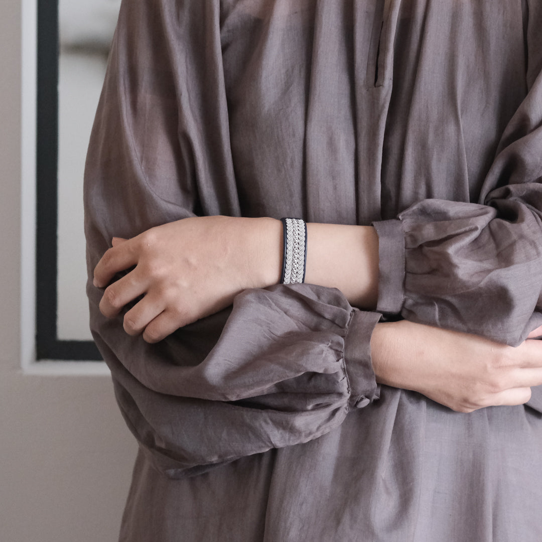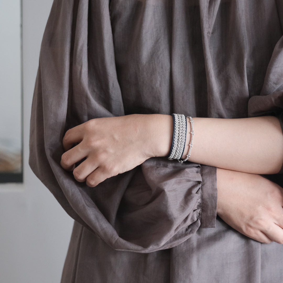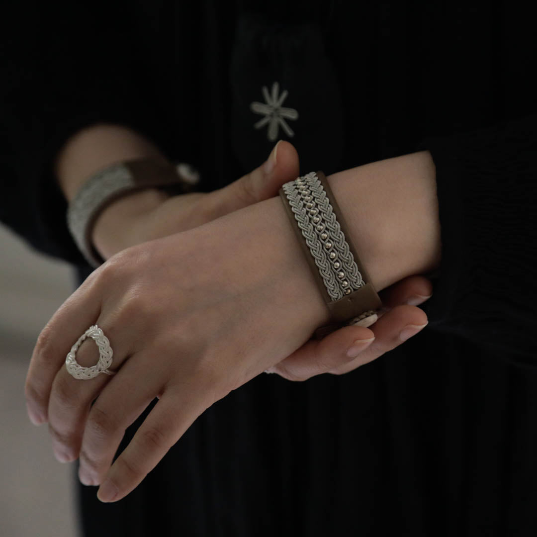 その伝統を取り入れつつ、あえてゆるく編むことでレースのような繊細さを表現。トライバルモードになりすぎず、普段の装いになじみます。
