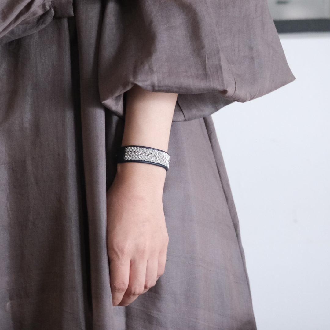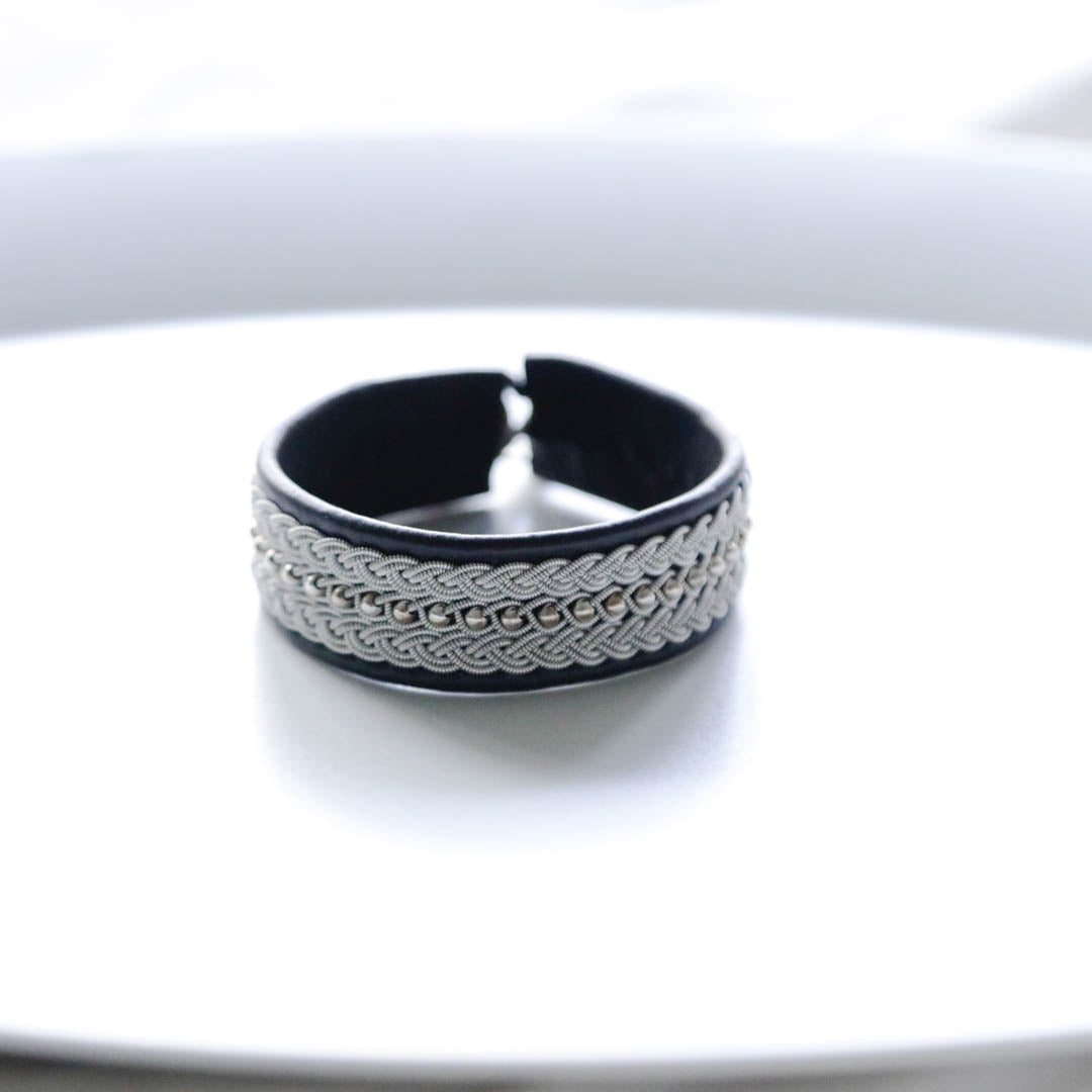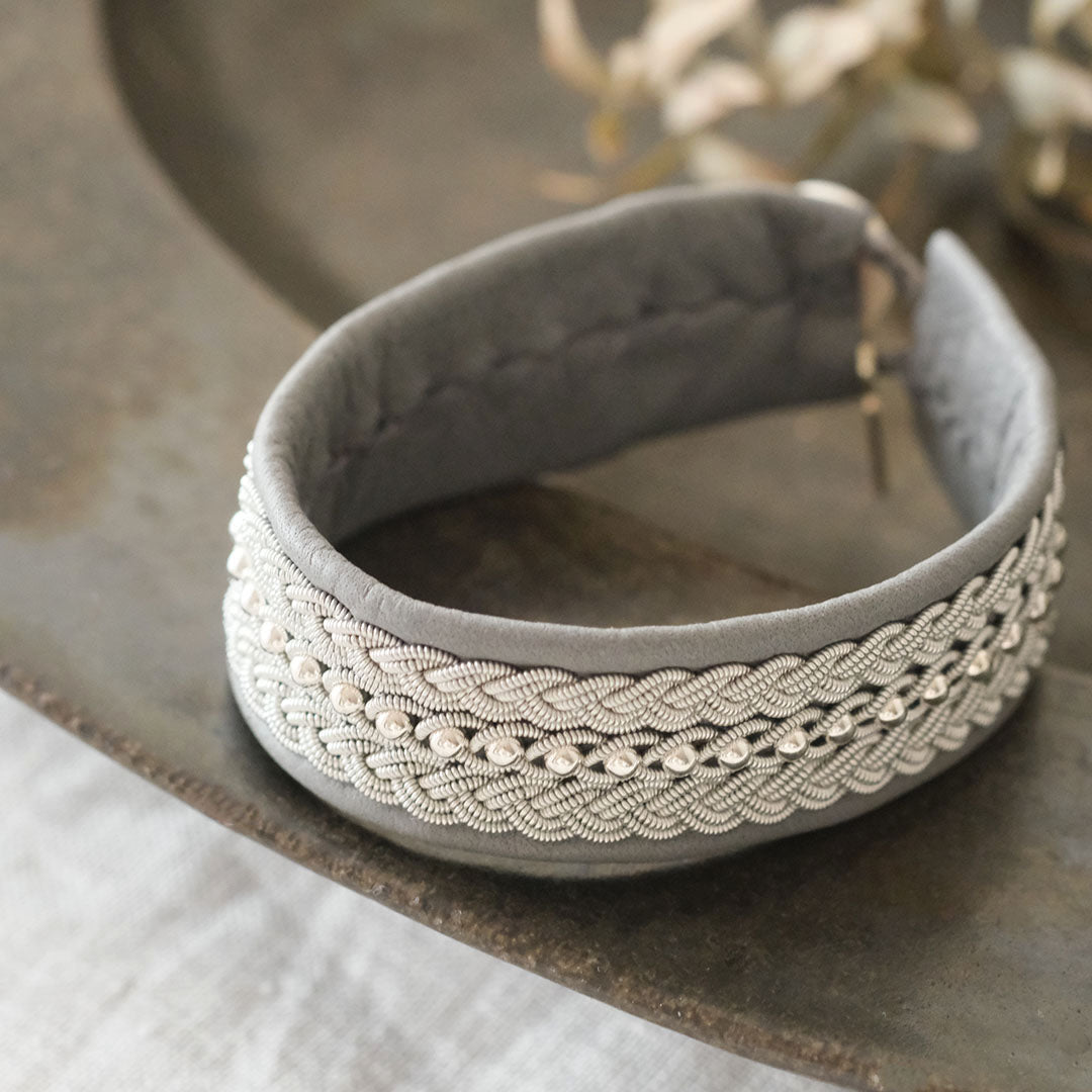 ピューターワイヤーとトナカイの革を使ったブレスレットは、トナカイを食べて暮らすサーミ族ならではのアクセサリー、お守りのような存在です。