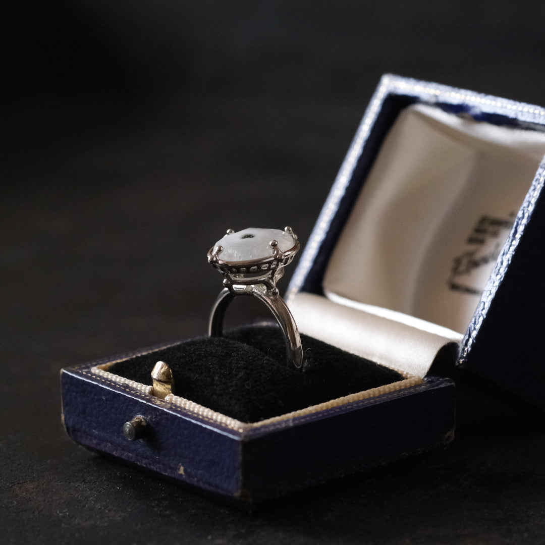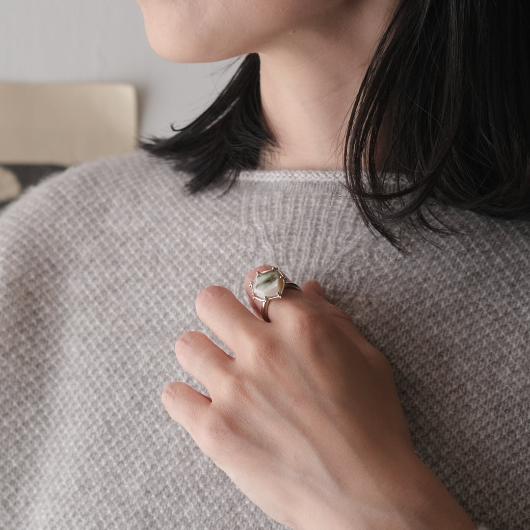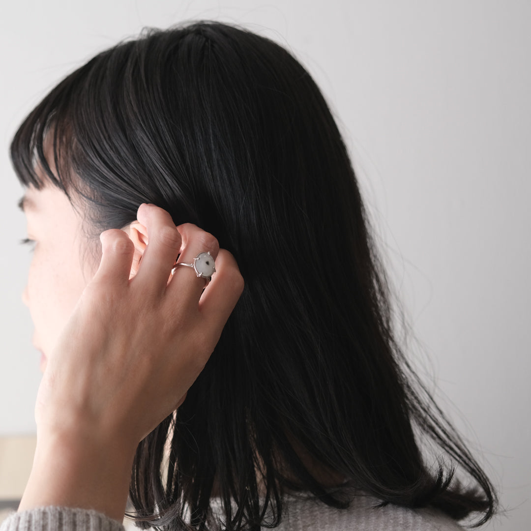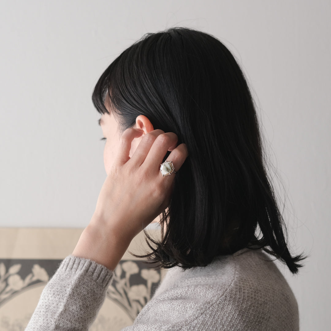 石の形に合わせてシルバーの装飾が包み込んでいます。ホワイトがベースになっているので、どんな装いの日にもお守りのように身に付けられそうです。