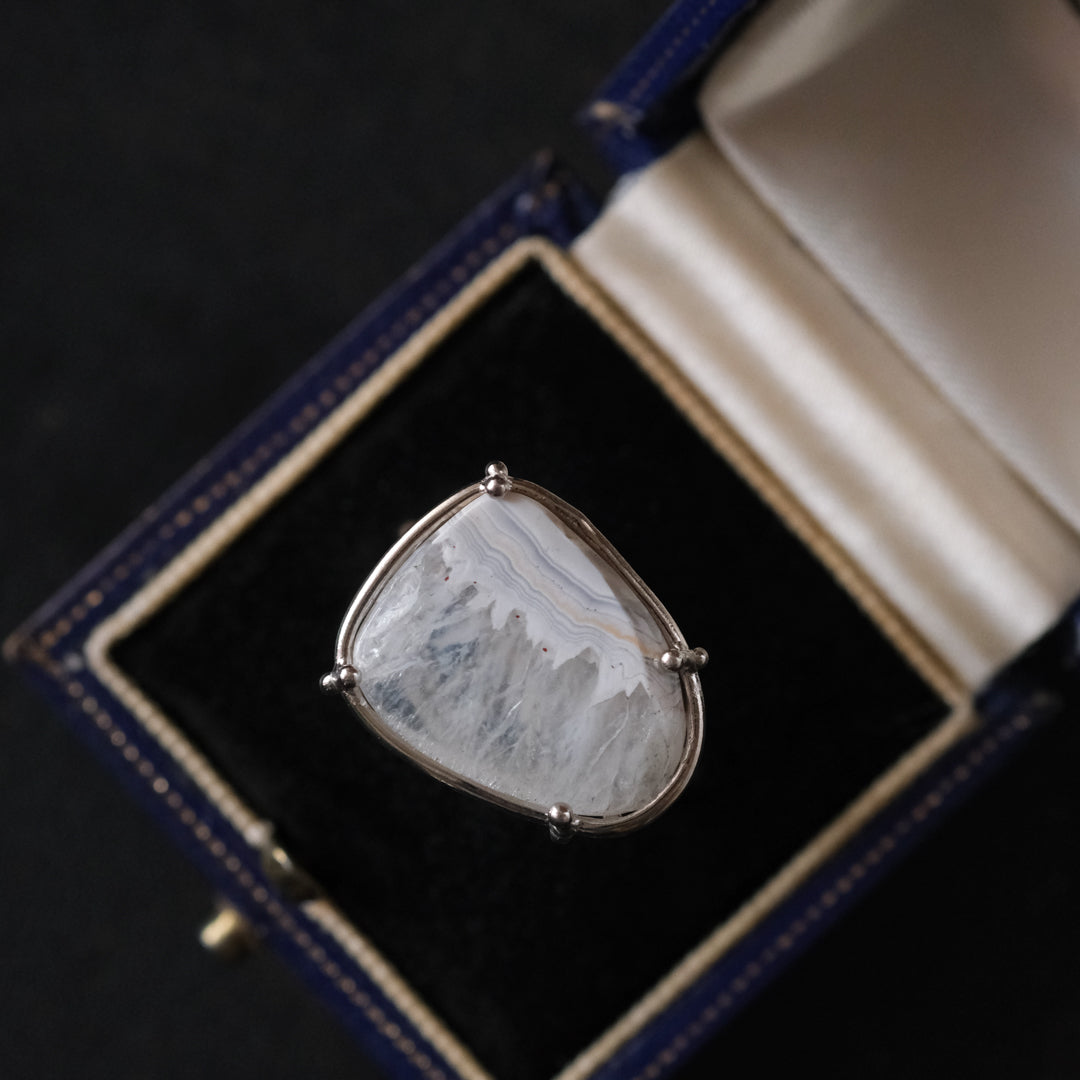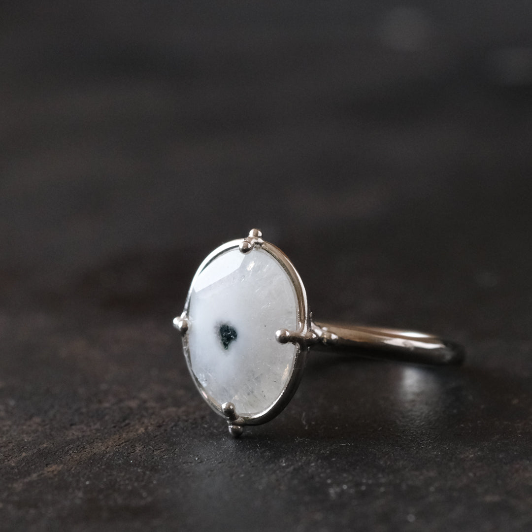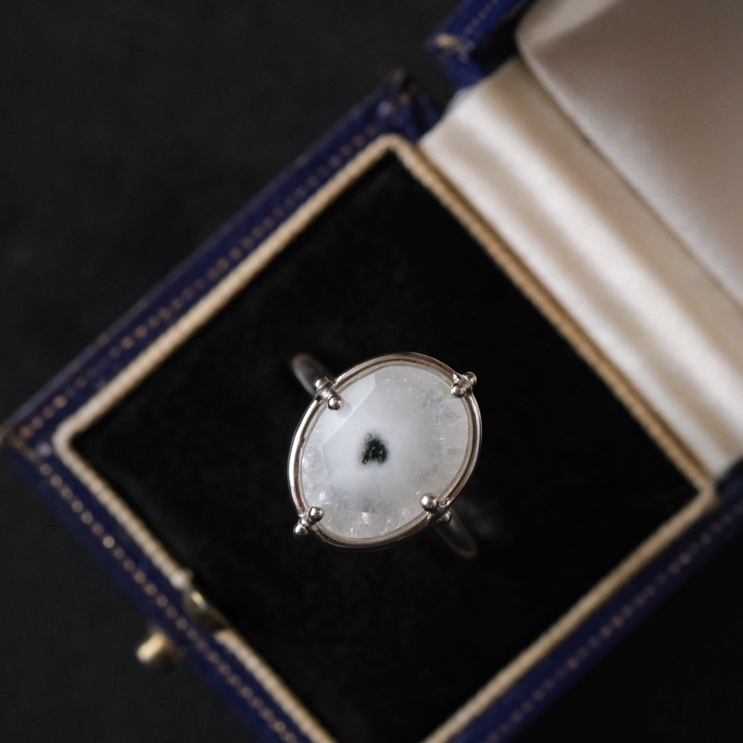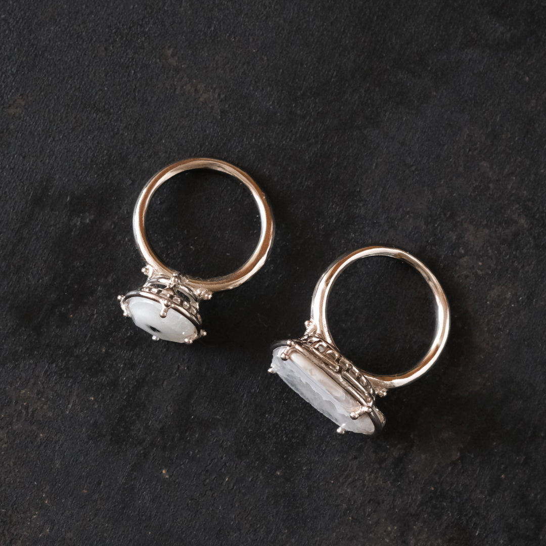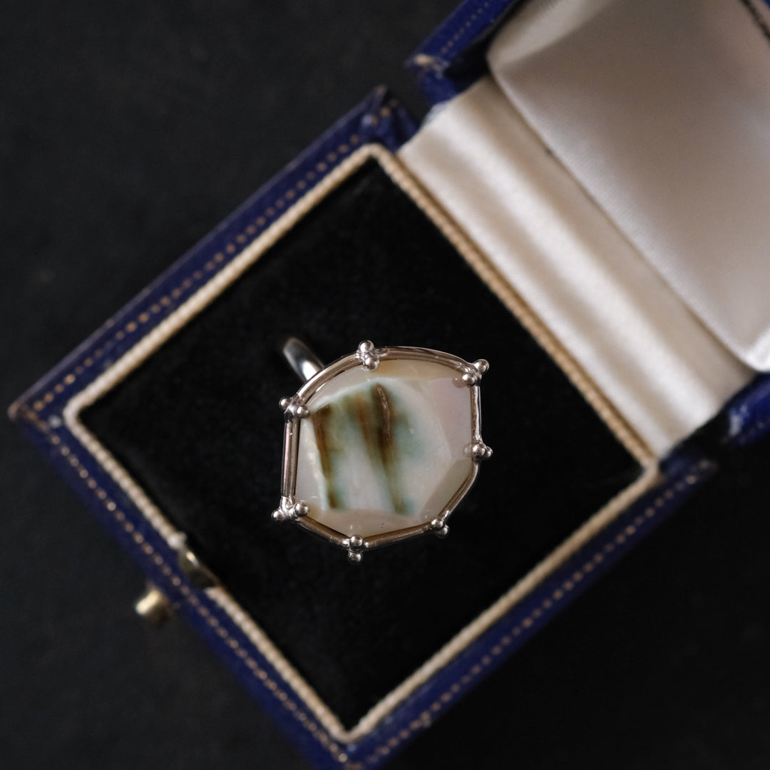 石の形に合わせてシルバーの装飾が包み込んでいます。ホワイトがベースになっているので、どんな装いの日にもお守りのように身に付けられそうです。