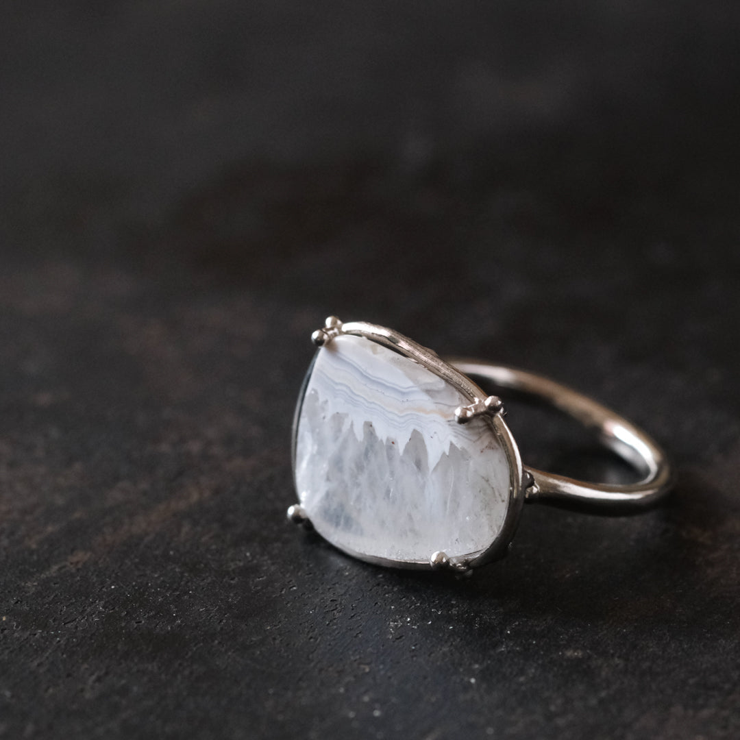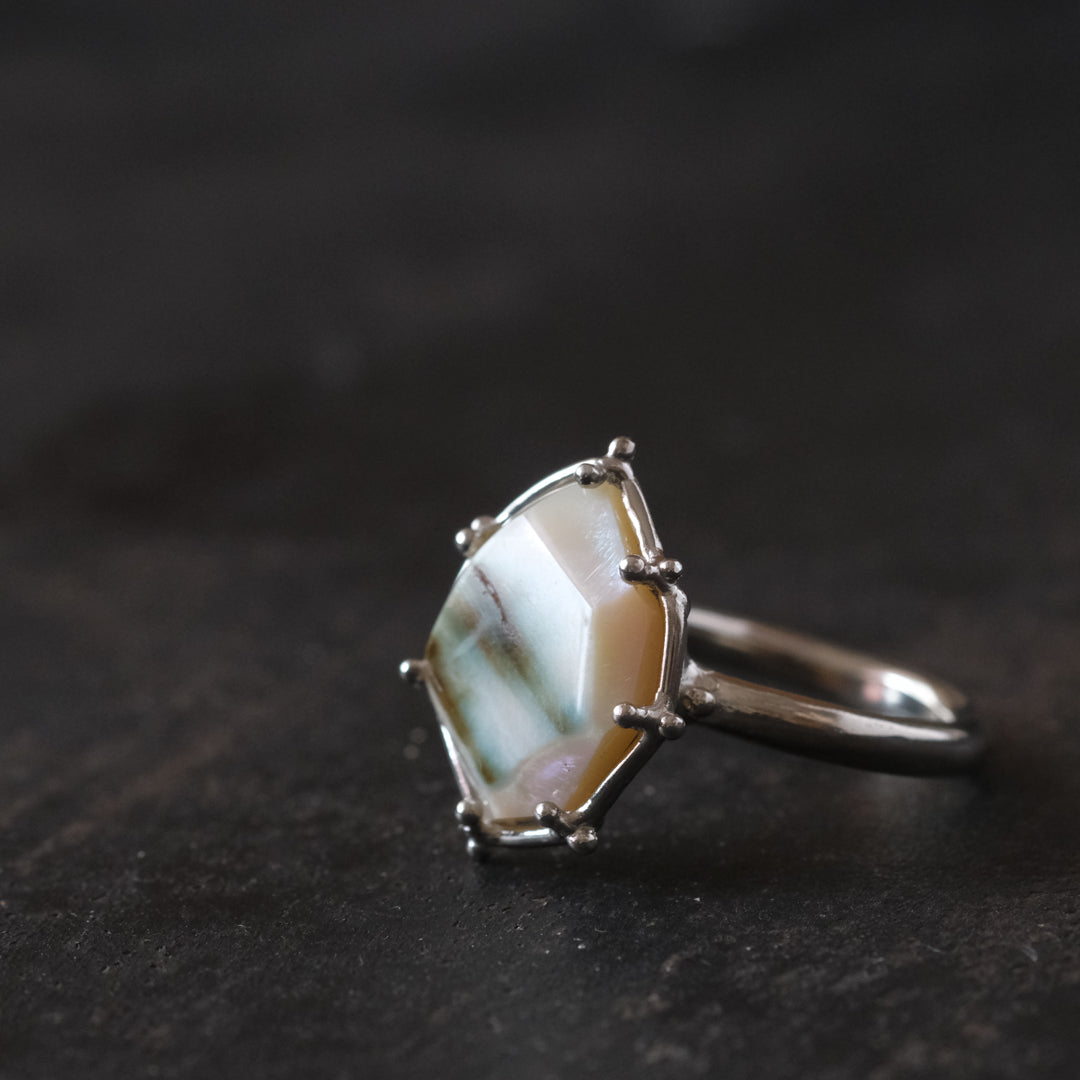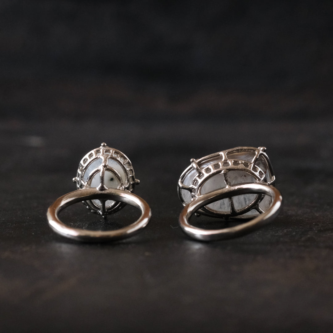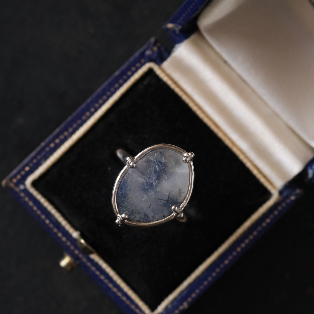 石の形に合わせてシルバーの装飾が包み込んでいます。ホワイトがベースになっているので、どんな装いの日にもお守りのように身に付けられそうです。