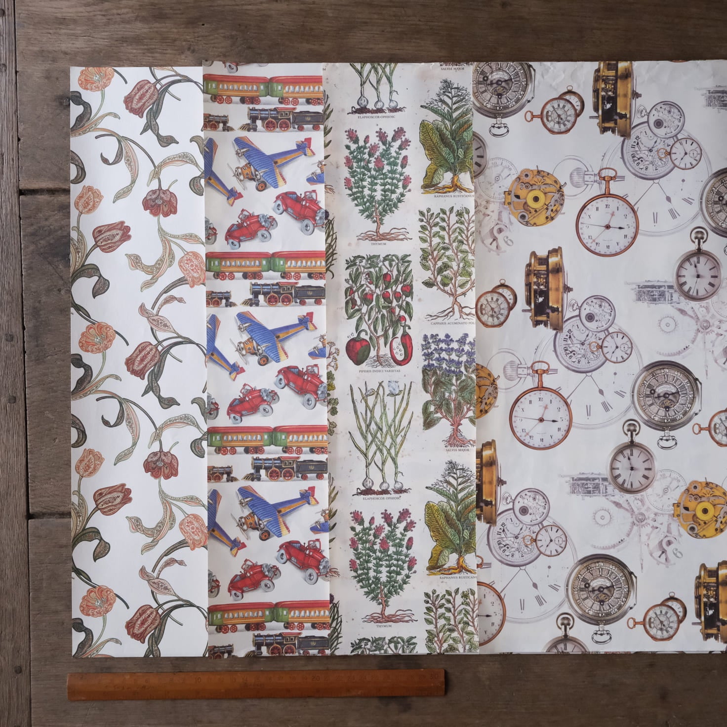 イタリアTASSOTTI社を中心に4種類のラッピングペーパーをセット。贈る相手やシーンに合わせて選んでお楽しみください。