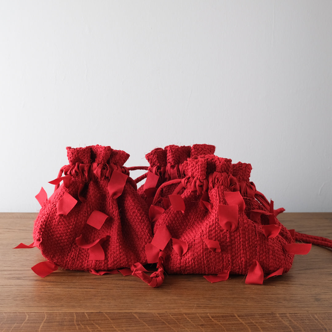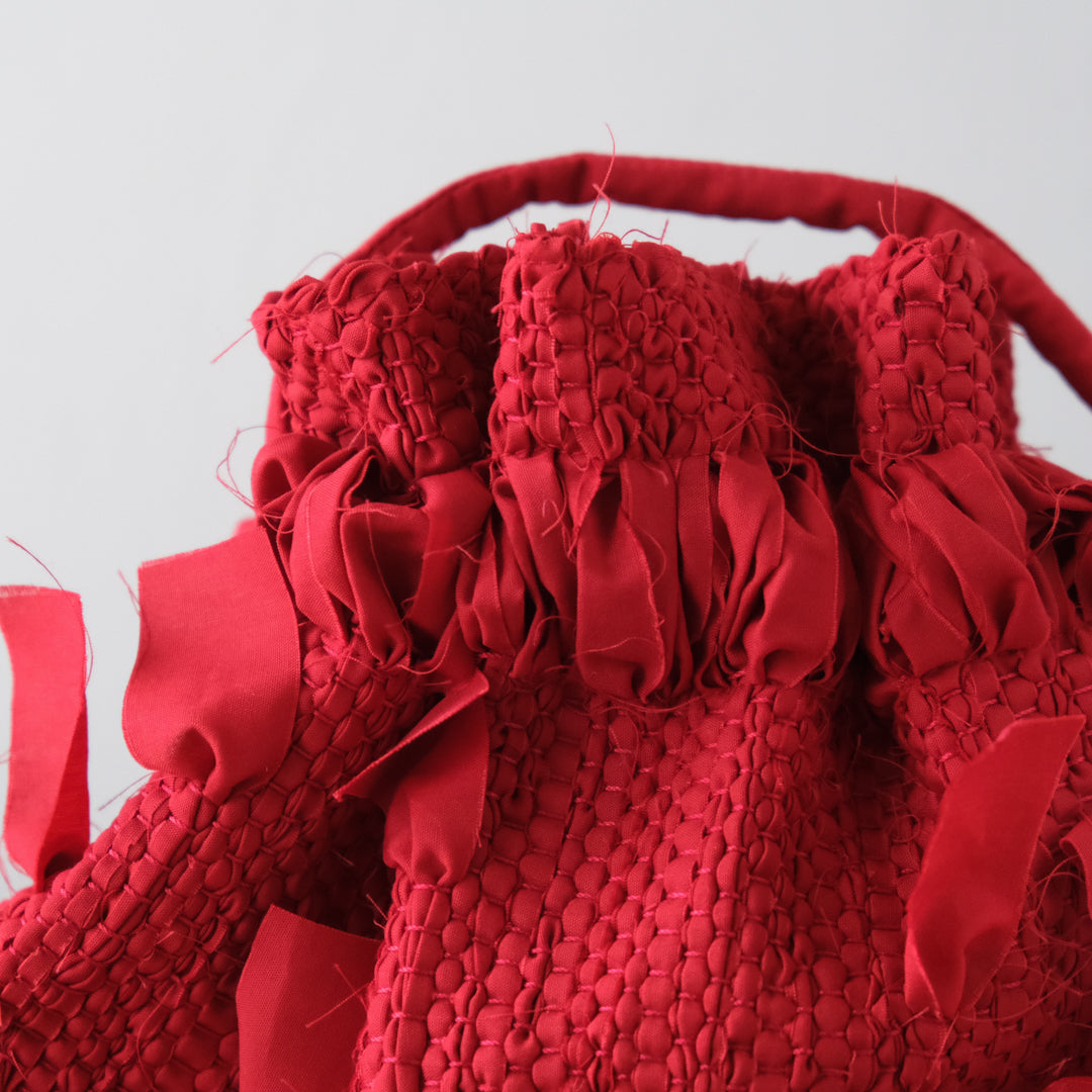 バッグはしっかりと織った裂き織りでつくられた巾着です。織り目の凹凸により表情が生まれ、鮮やかな赤でも強くなりすぎていません。