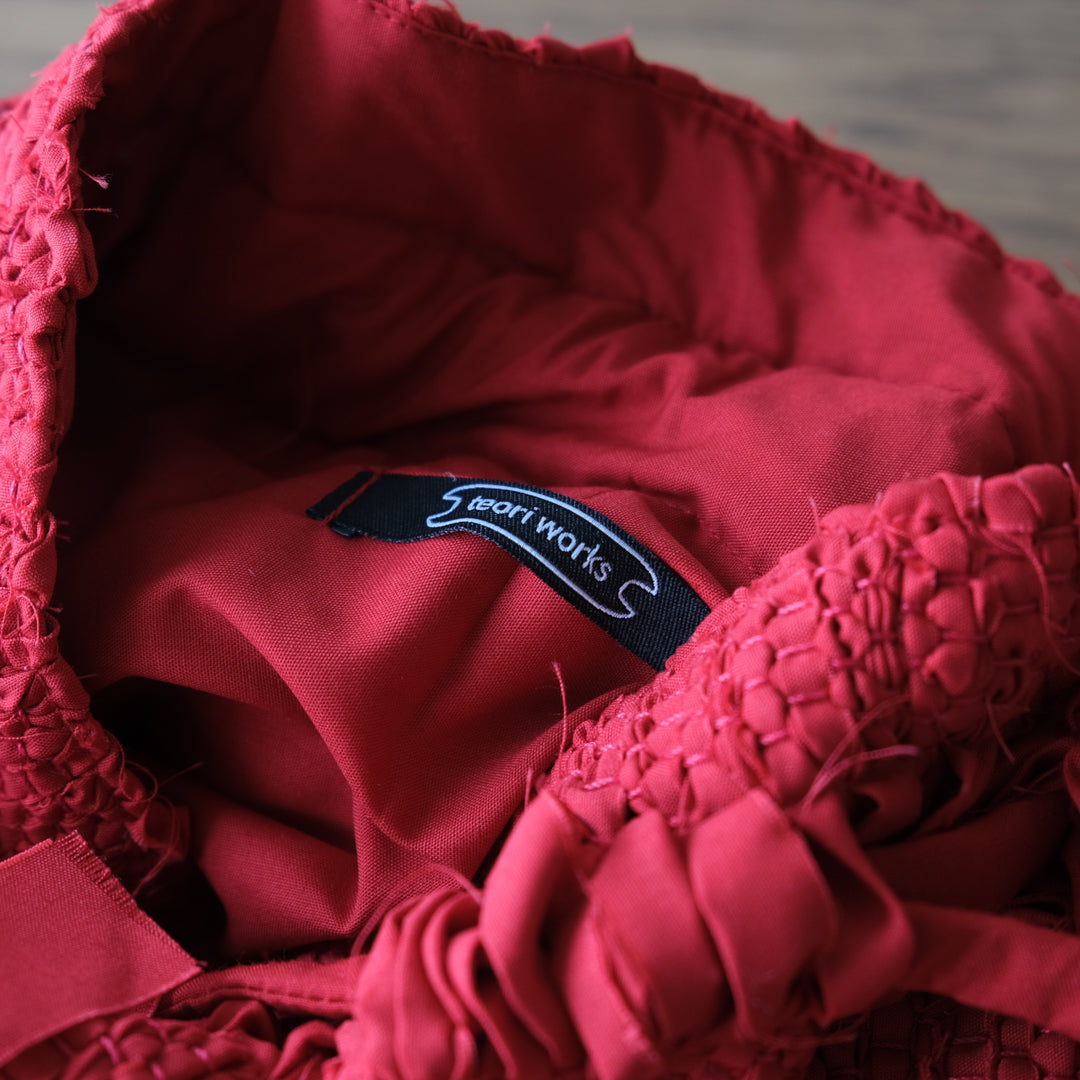 コーディネートのアクセント役になってくれるバッグを teori worksにつくってもらいました。こちらが、鮮やかな赤の巾着バッグmini uni kinchakuです。