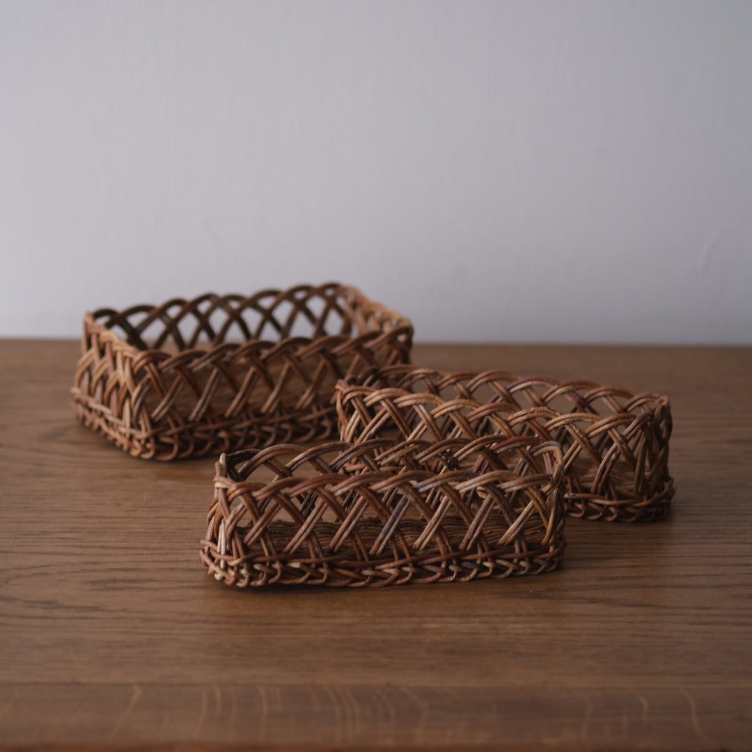 ぐるぐると繰り返し編まれたあけびが陸橋を想起するおしぼり入れ。サイズは2種類。編み目模様が際立つレトロな雰囲気は、おしぼり以外にも眼鏡やリモコンなどにもぴったりです。