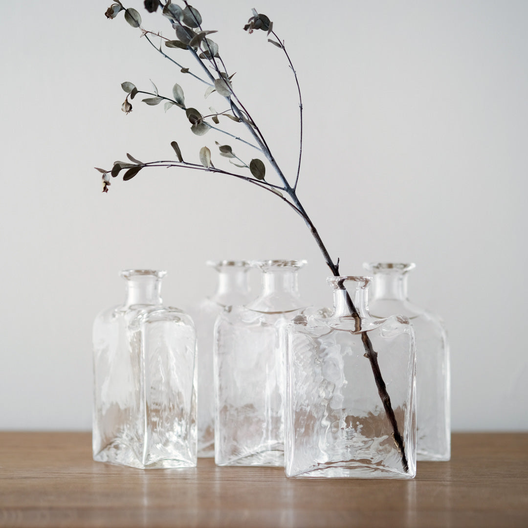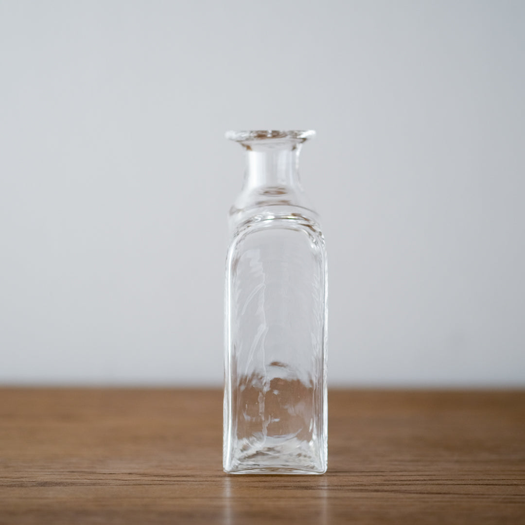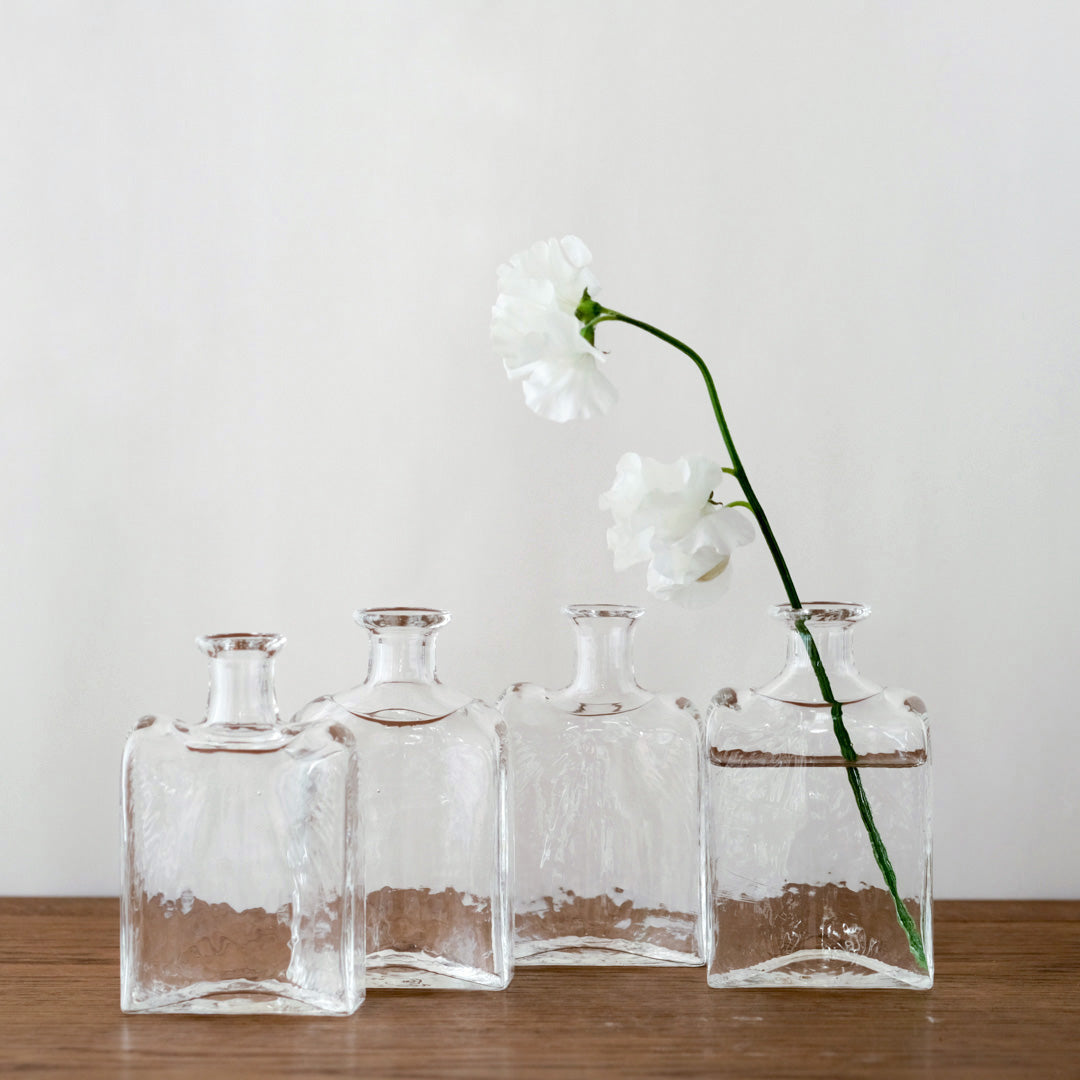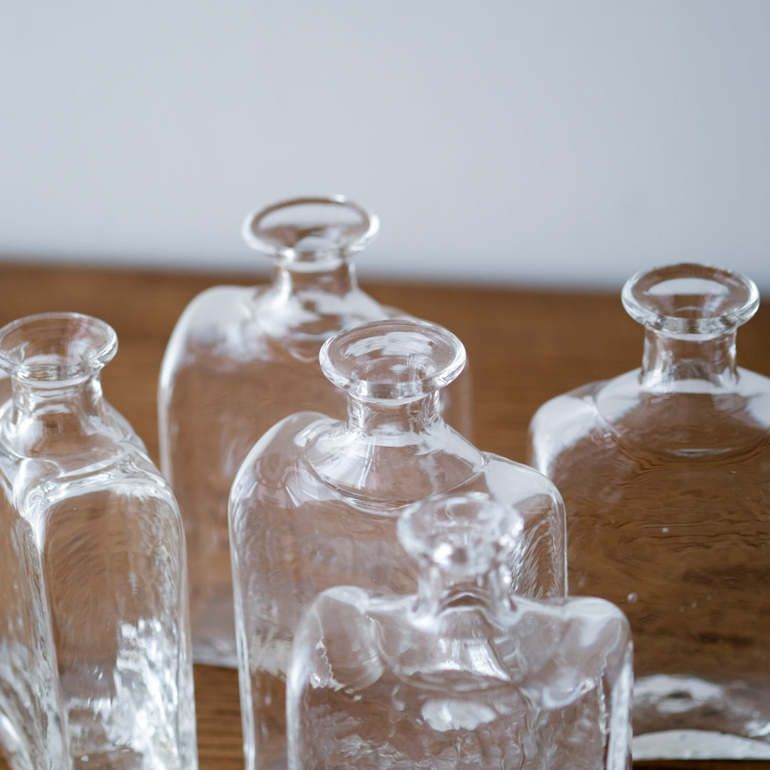 細く短い口にかっちりとした胴のフォルム、どことなくアンティークの瓶を彷彿とさせる花器です。揺らぎのあるガラスの質感、うっすらと透ける高く盛り上がった底にも独特の表情があります。