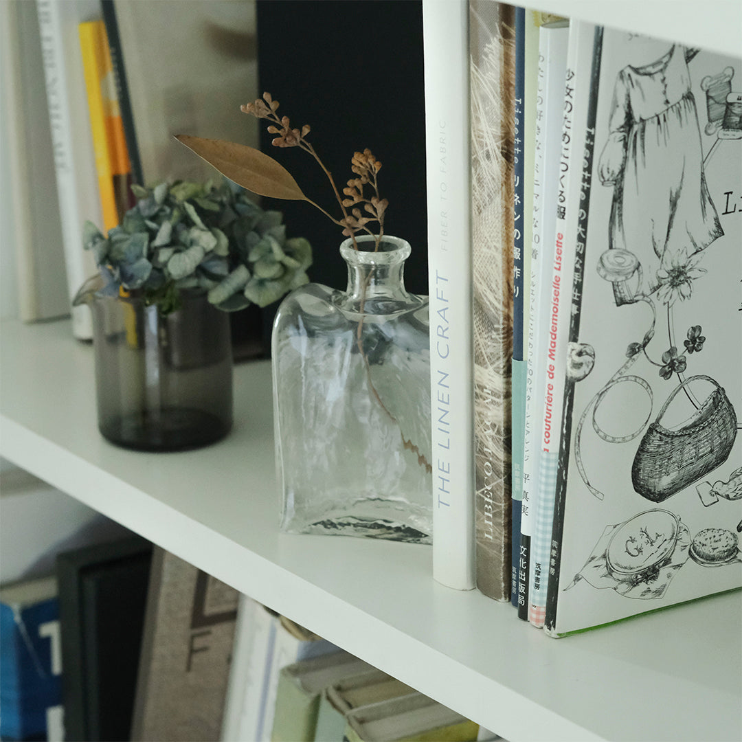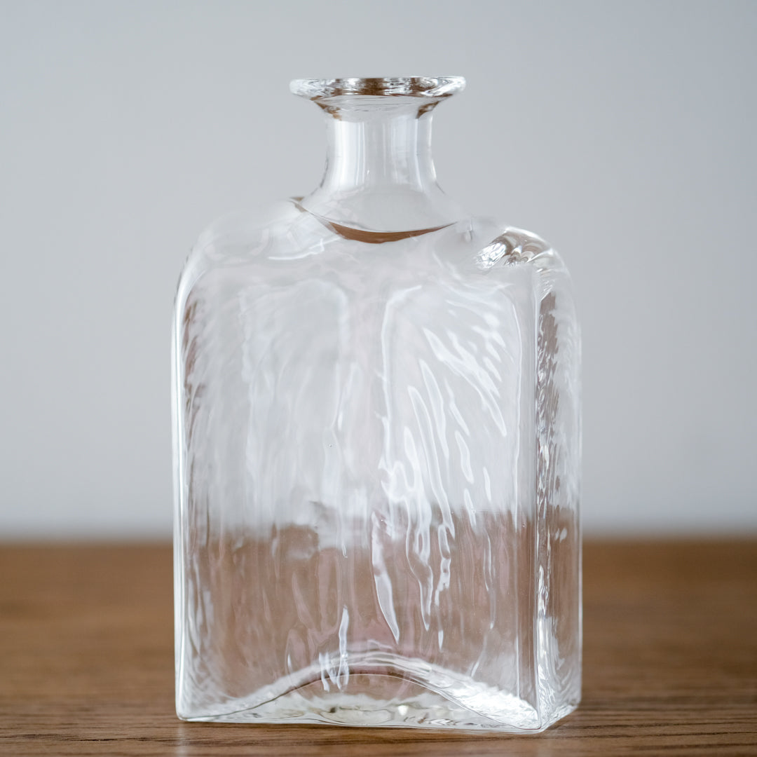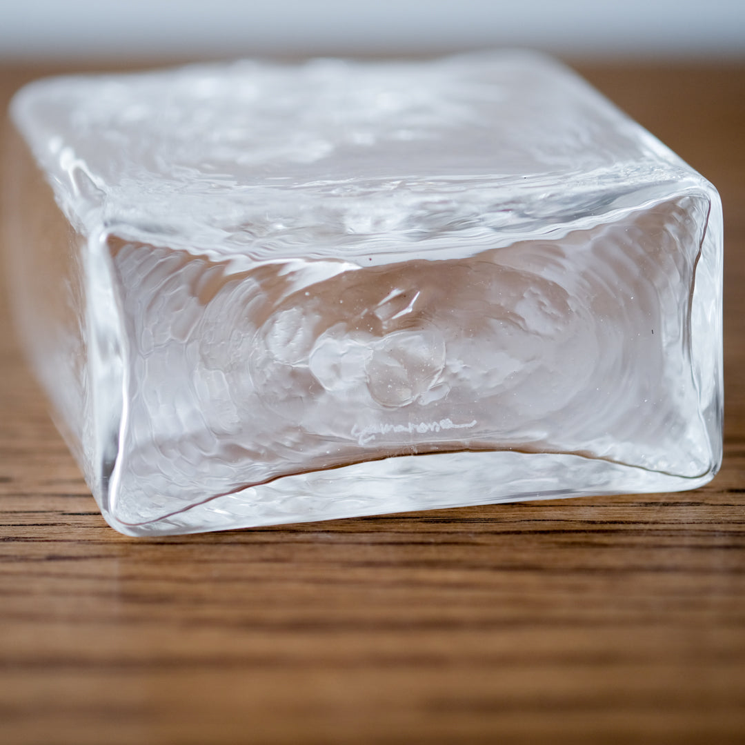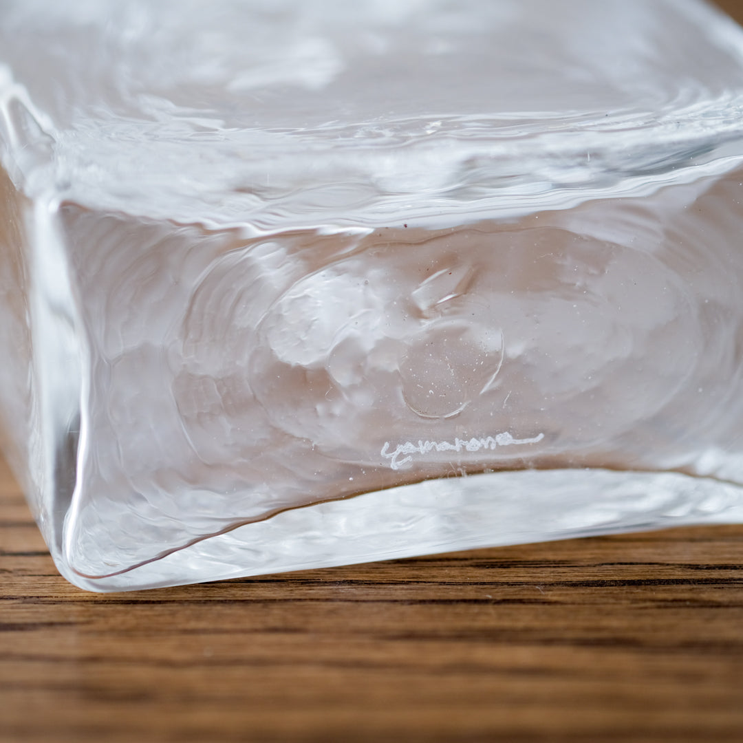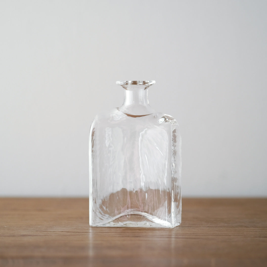 細く短い口にかっちりとした胴のフォルム、どことなくアンティークの瓶を彷彿とさせる花器です。揺らぎのあるガラスの質感、うっすらと透ける高く盛り上がった底にも独特の表情があります。