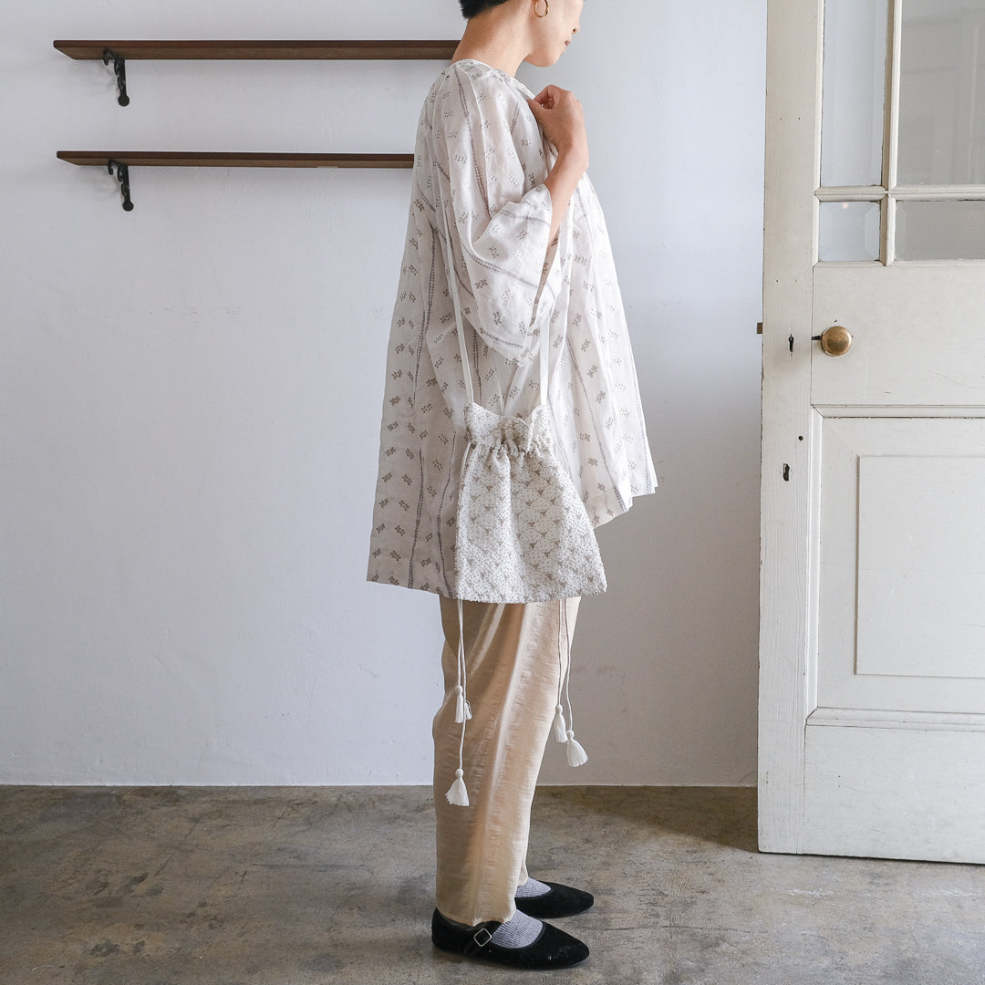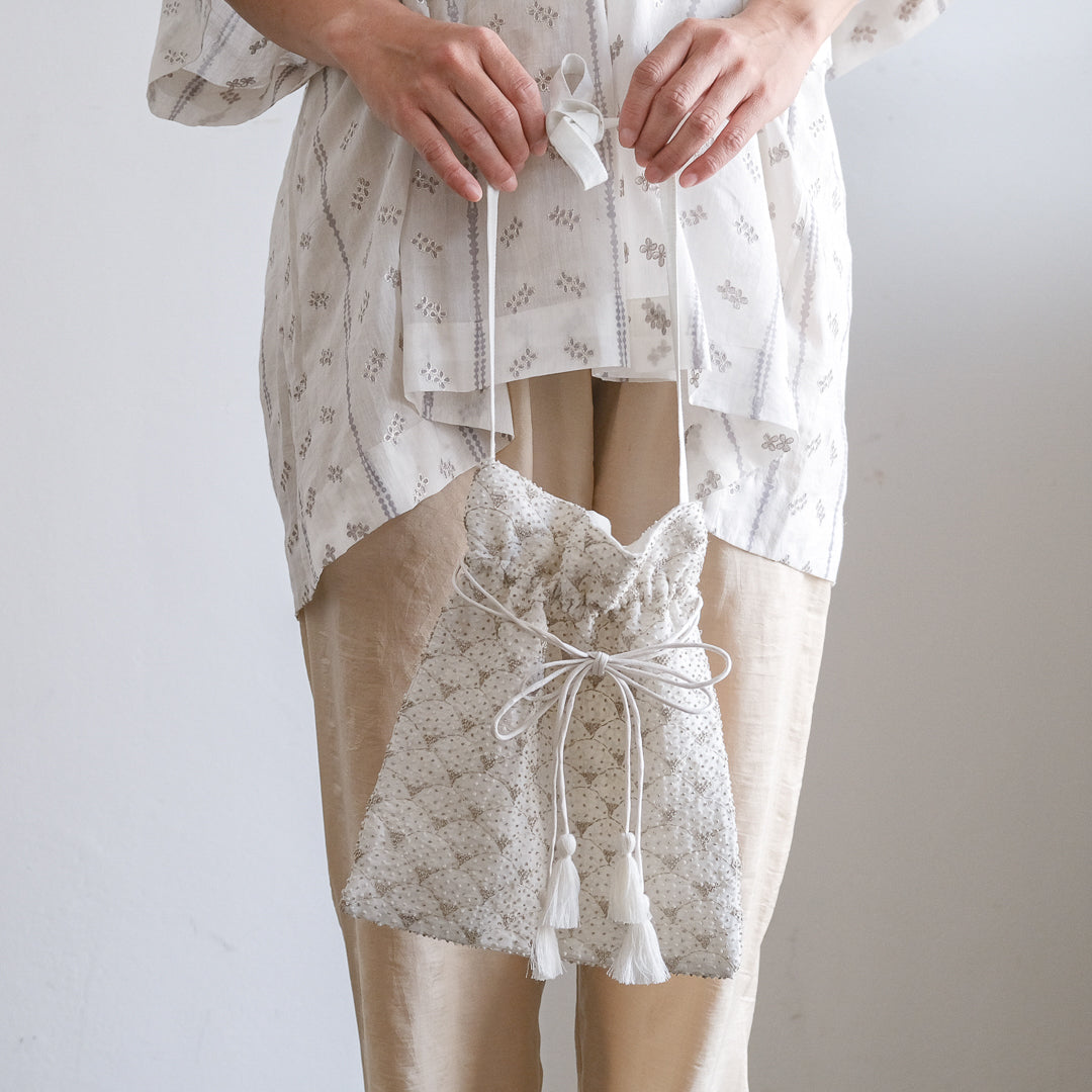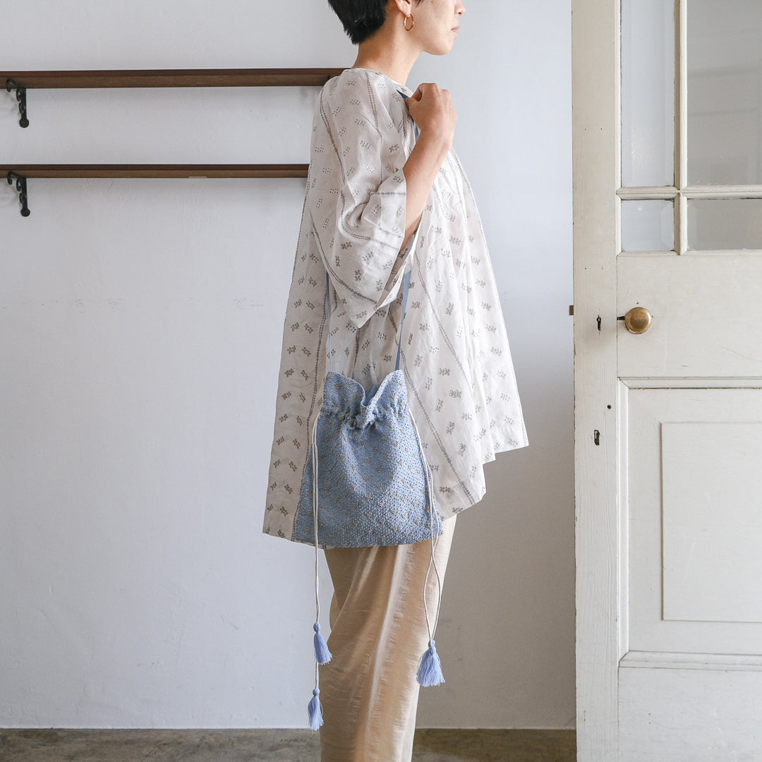 手紡ぎのシルクやコットンカディに、ベンガル地方伝統の刺繍やプリントなどの手仕事が詰まった服をつくるBUNON(ブノン)。毎シーズン人気の手刺繍をあしらったEmbroidery Drawstring Bag。斜め掛けができるようになって新登場しました。