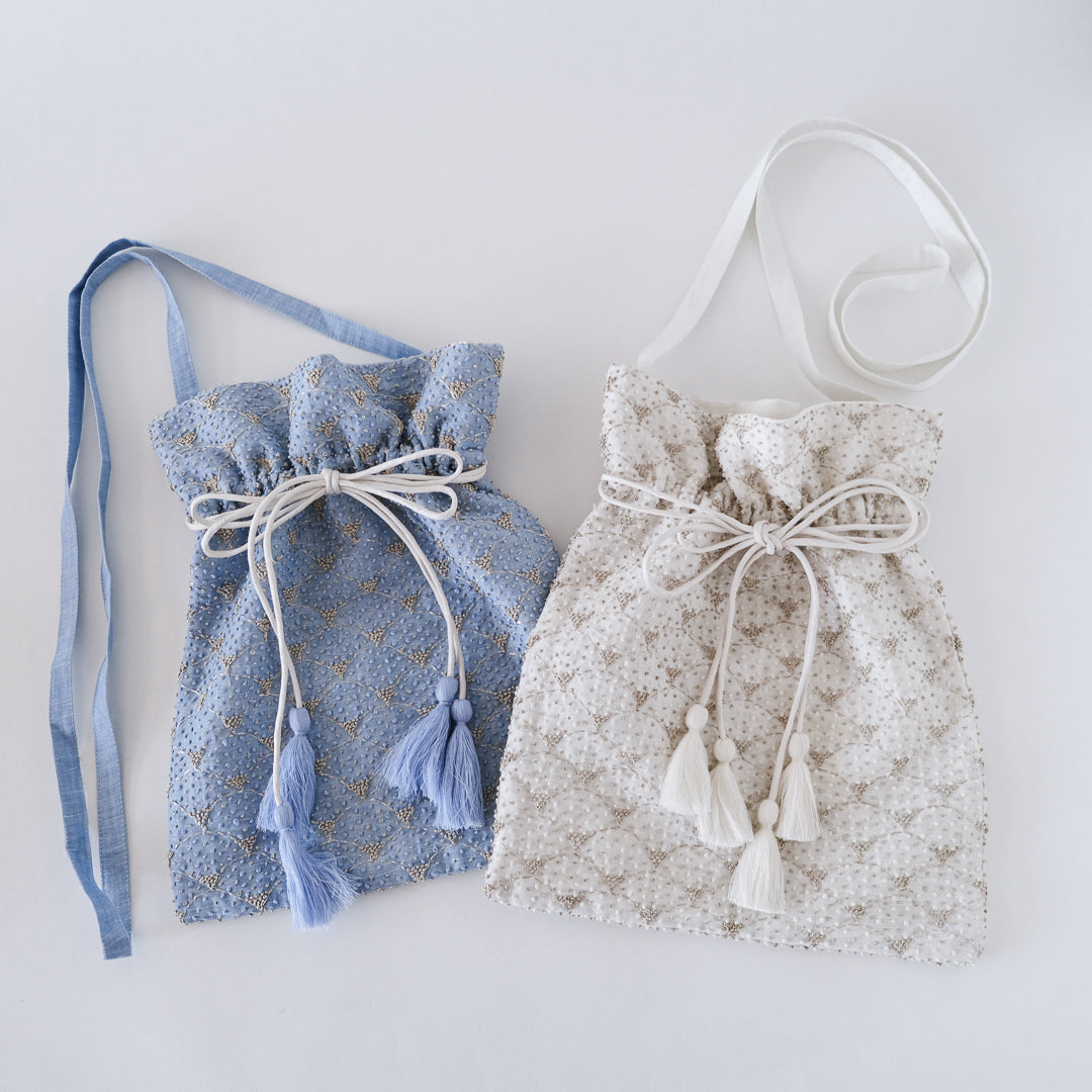 細やかな手刺繍を全面にあしらった、華やかな巾着型のバッグ。シルク糸を使って、ひと刺しひと刺し手作業で縫いつけています。