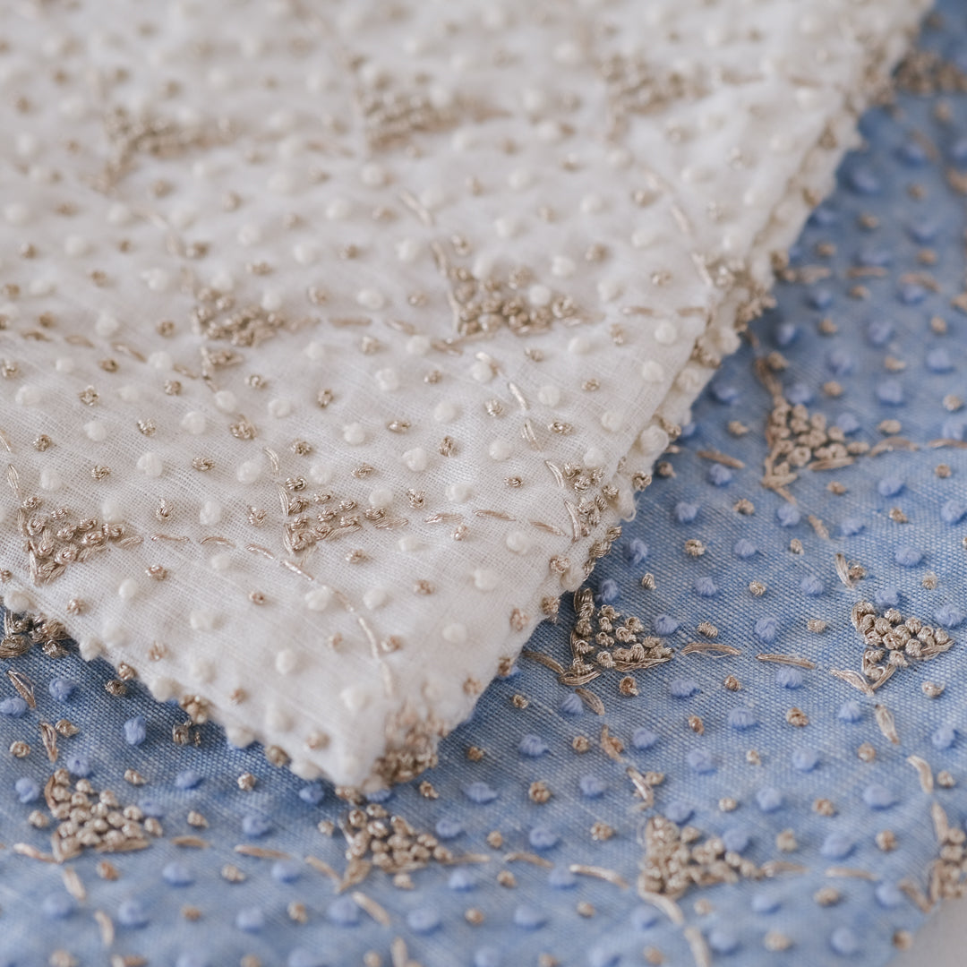 手作業で縫い付けられた刺繍は、思わずため息が出るような繊細さ。▲上 ホワイト 下 アイスブルー 細やかなフレンチナッツステッチが散りばめられています