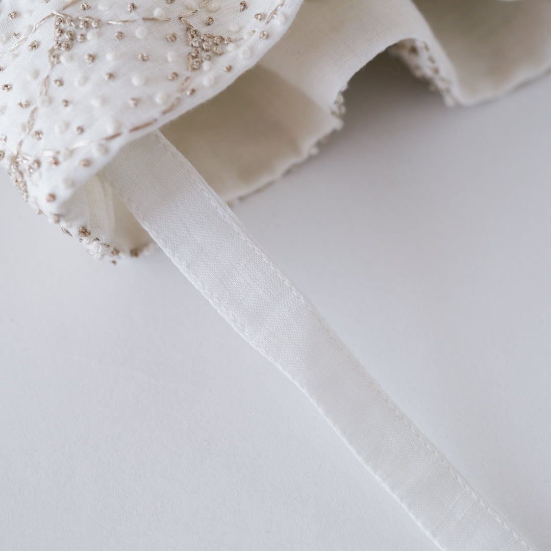 ホワイトは、白地にゴールドの刺繍とホワイトのフレンチナッツステッチがほどこされています。▲ホワイト