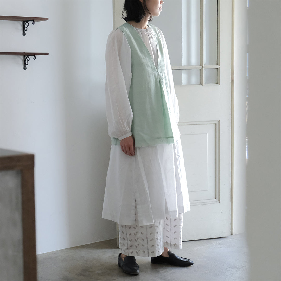 ▲ミント ワンピース:[BUNON]Kantha Gather Dress オフホワイト、パンツ:[BUNON]Embroidery Tuck Pants