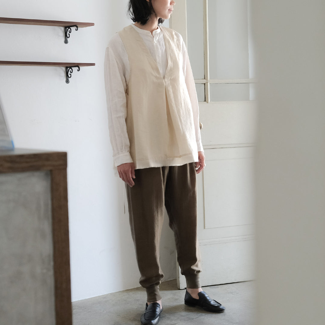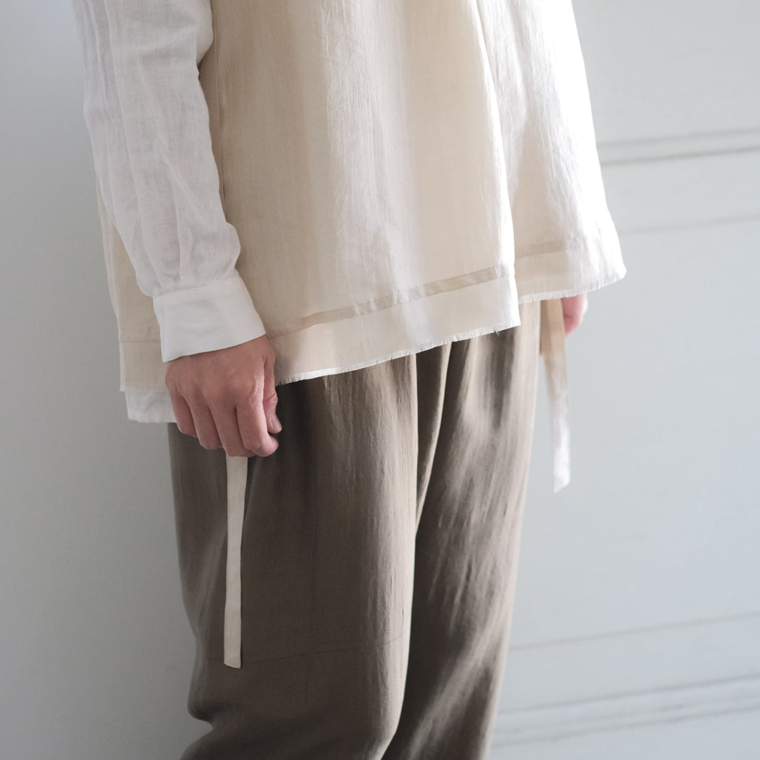 ▲ビスケット シャツ:[SALUÉ]ユニセックスバンドカラーシャツ/ライトウェイトリネン アンティークホワイト、パンツ: [uryya]シルク リブパンツ カーキ