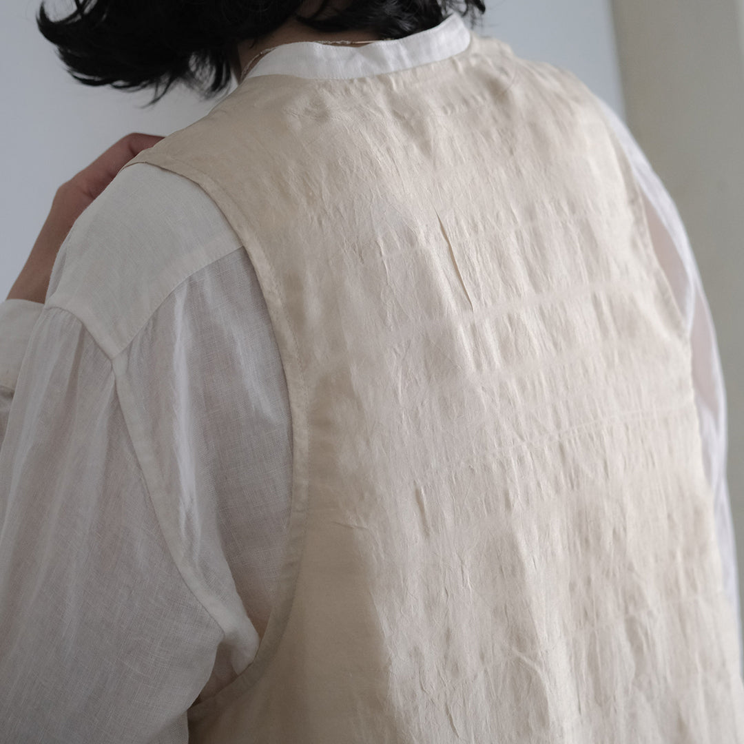 普段の装いに合わせたいシルクの洋服を提案するuryya(ユライヤ)。シンプルな形でインナーを選ばないシルクベストは、1枚重ねるだけで奥行きのある表情をつくります。