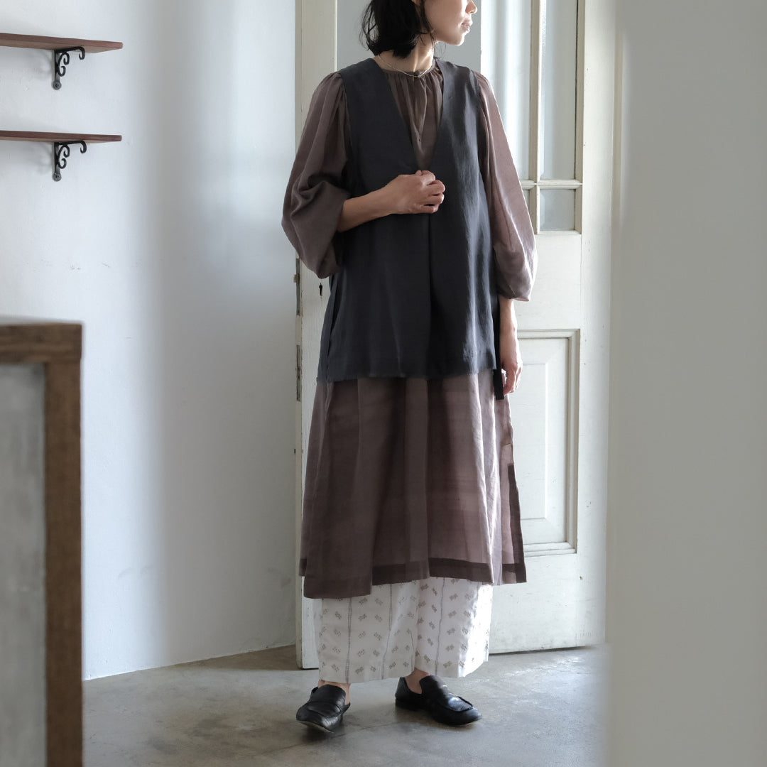一枚だと透け感が気になるアイテムの上に合わせるのも。こちらのコーディネートでは、ワンピース、ベスト共に透け感はありますが重ねることで透け感はほとんど気になりません。