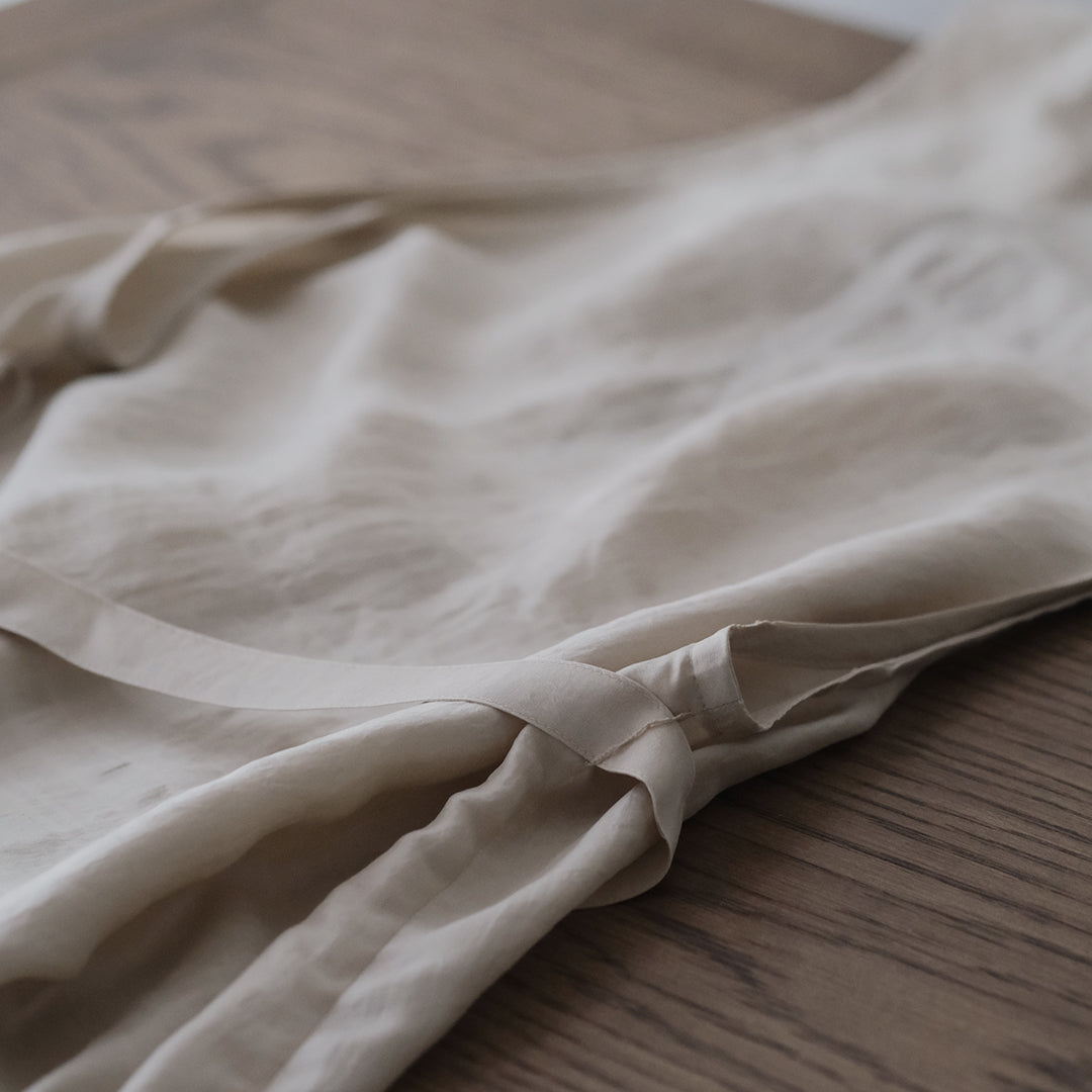 シンプルな装いに重ねれば、大人っぽい印象に。紐を結んですこしシルエットを変えて楽しんでも。