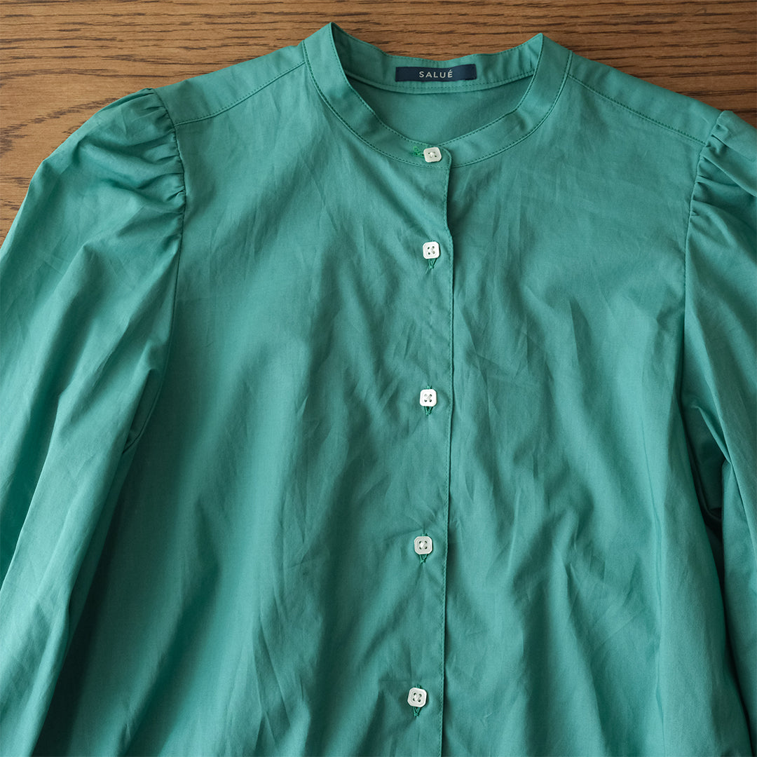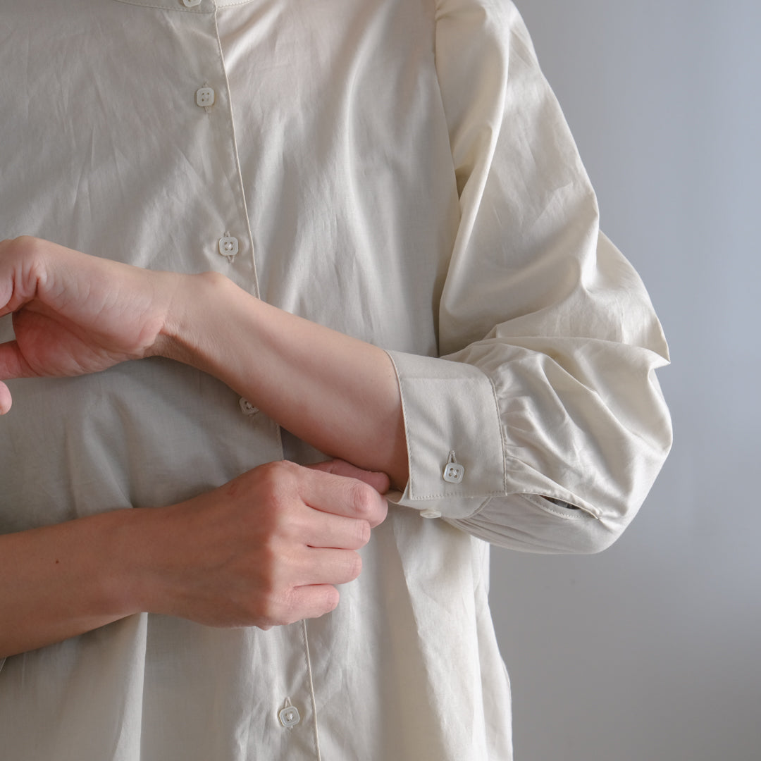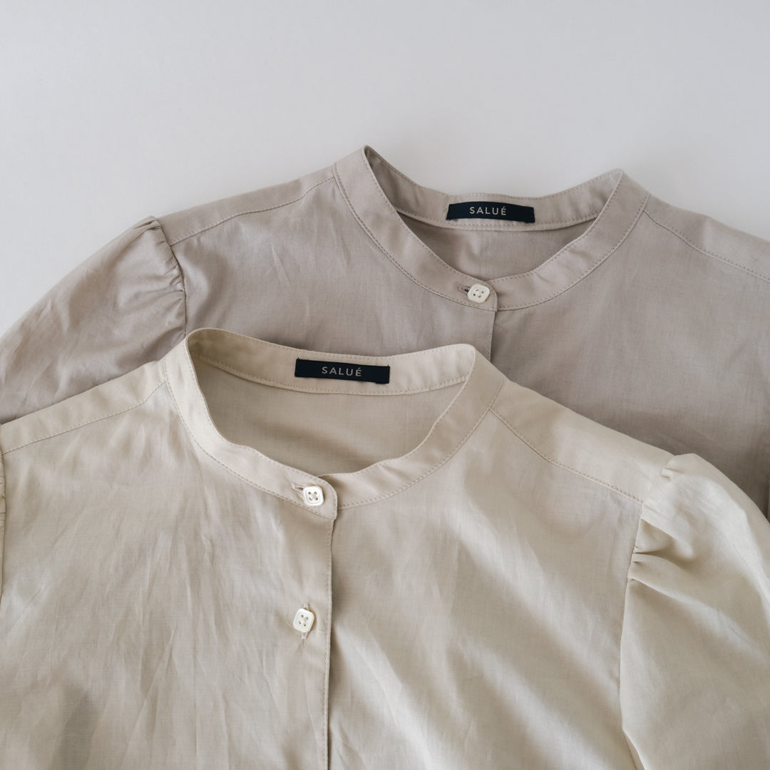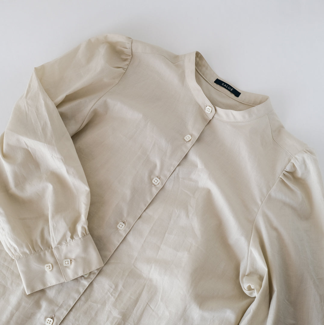 生地を変えたり色を増やしたりしながらつくり続けている、SALUÉ人気のパフスリーブシャツ。こちらでご紹介しているパフスリーブシャツロングはリネンのものに比べ少し長い丈が特長。リネンのものと比べ、薄さ・軽さに優れています。