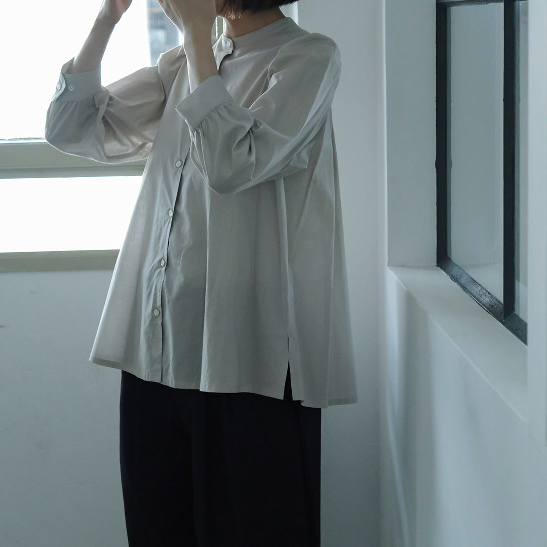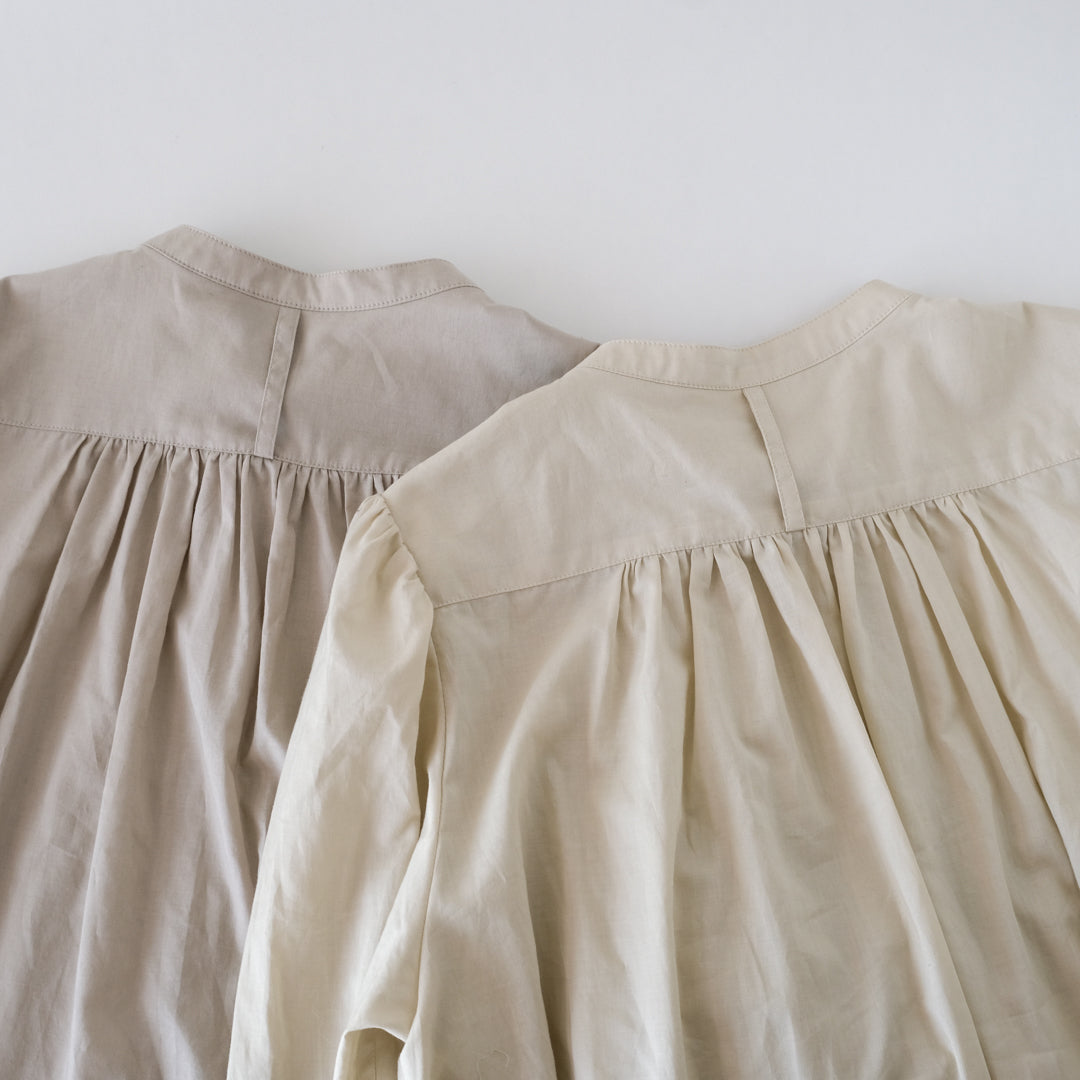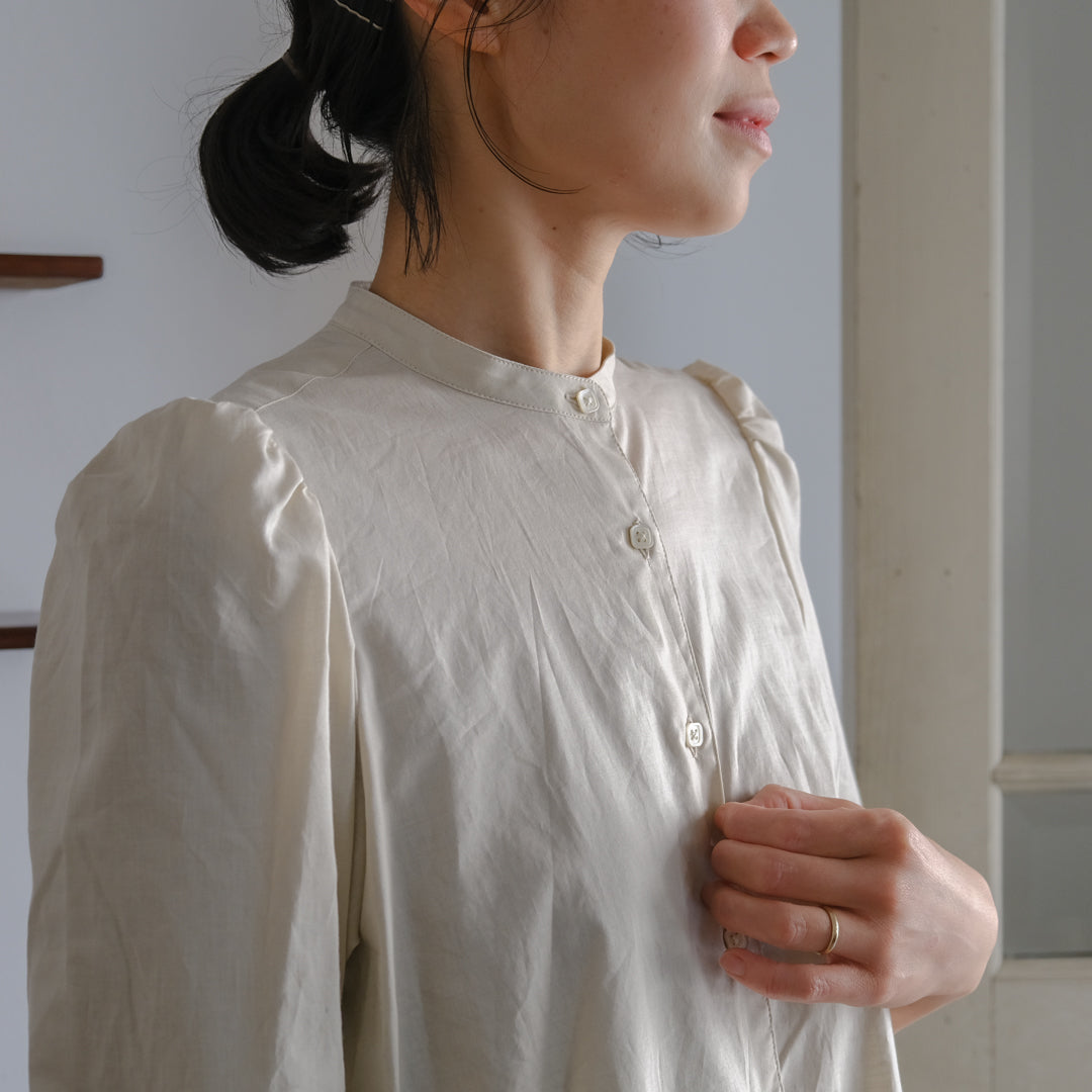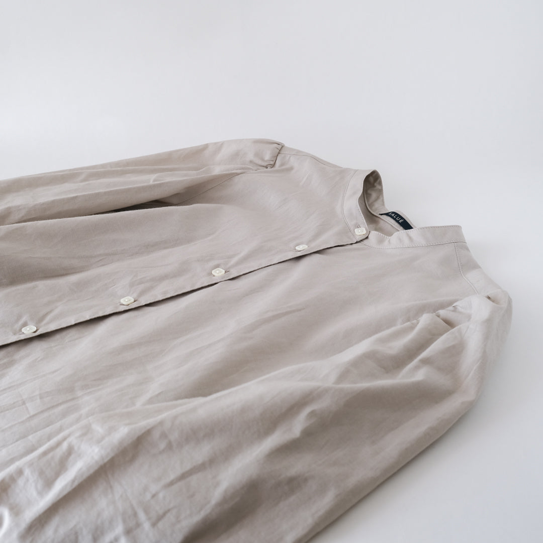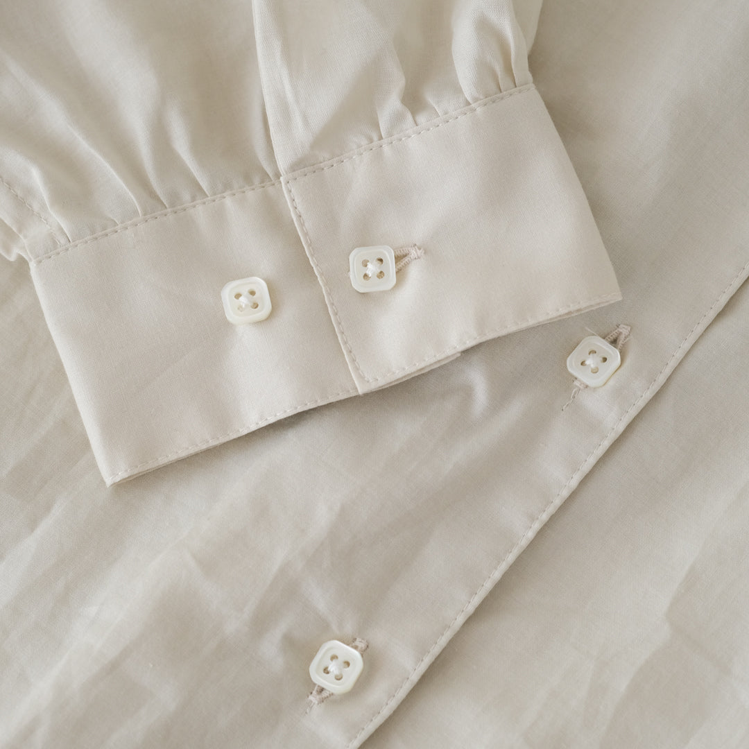 生地を変えたり色を増やしたりしながらつくり続けている、SALUÉ人気のパフスリーブシャツ。こちらでご紹介しているパフスリーブシャツロングはリネンのものに比べ少し長い丈が特長。リネンのものと比べ、薄さ・軽さに優れています。