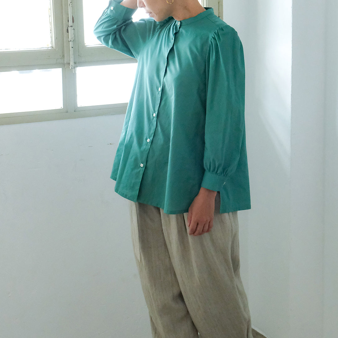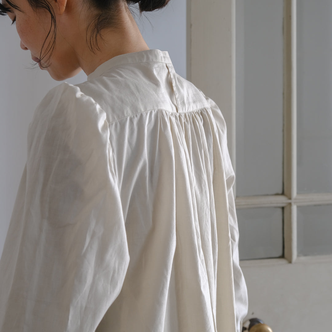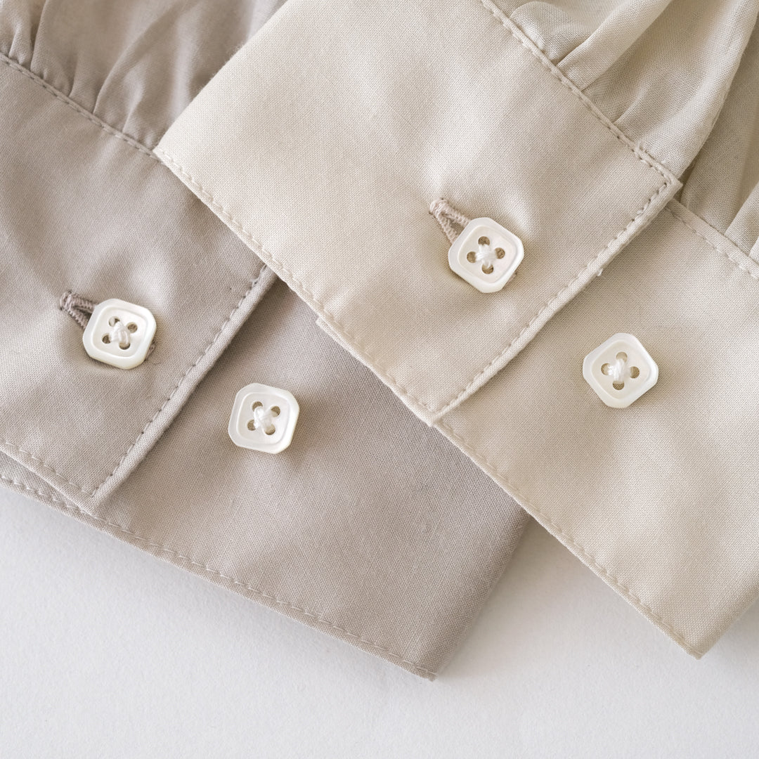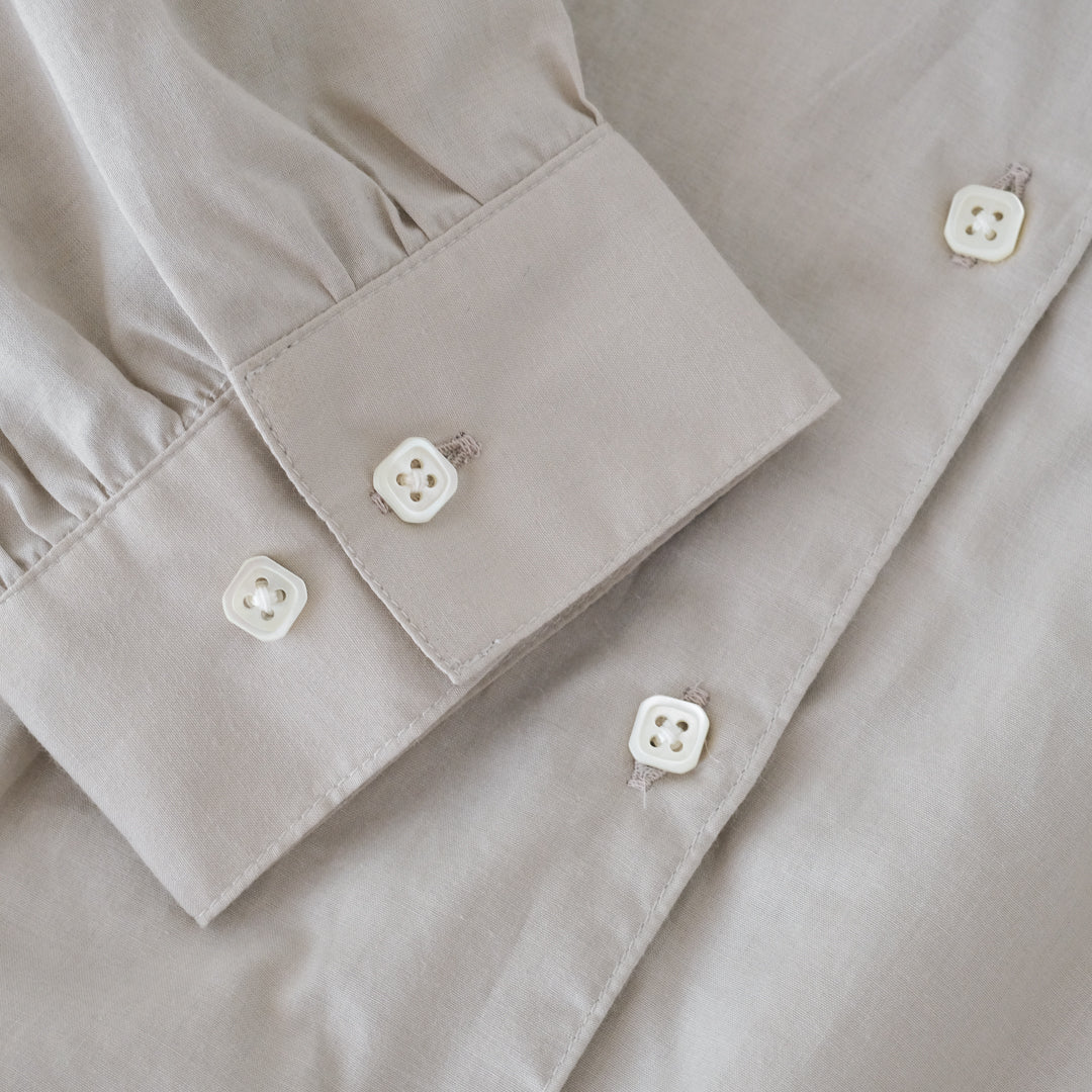 生地を変えたり色を増やしたりしながらつくり続けている、SALUÉ人気のパフスリーブシャツ。こちらでご紹介しているパフスリーブシャツロングはリネンのものに比べ少し長い丈が特長。リネンのものと比べ、薄さ・軽さに優れています。