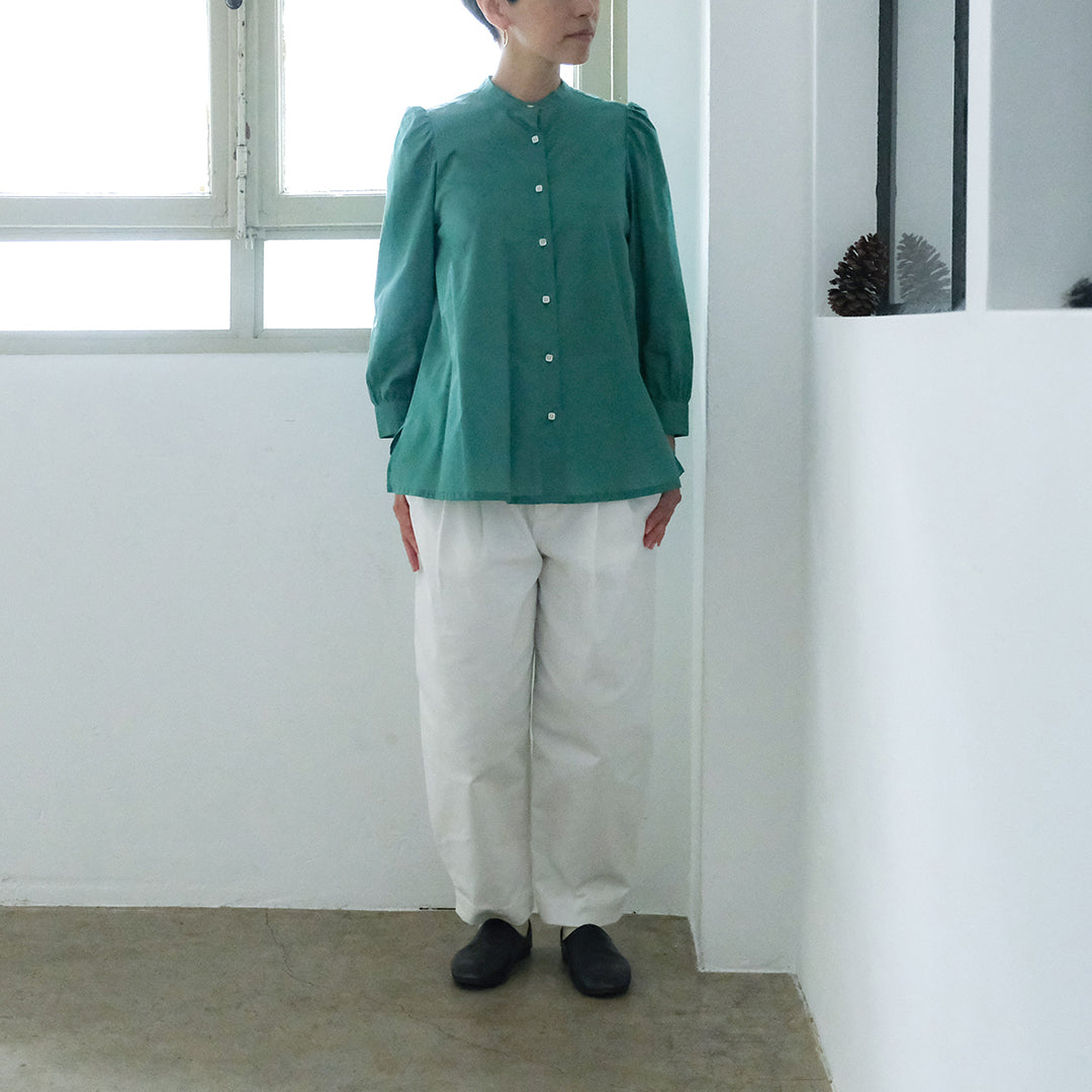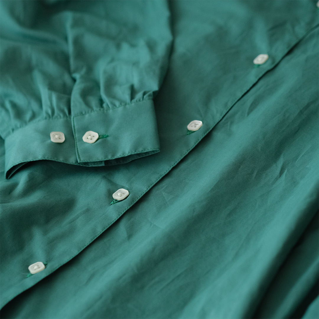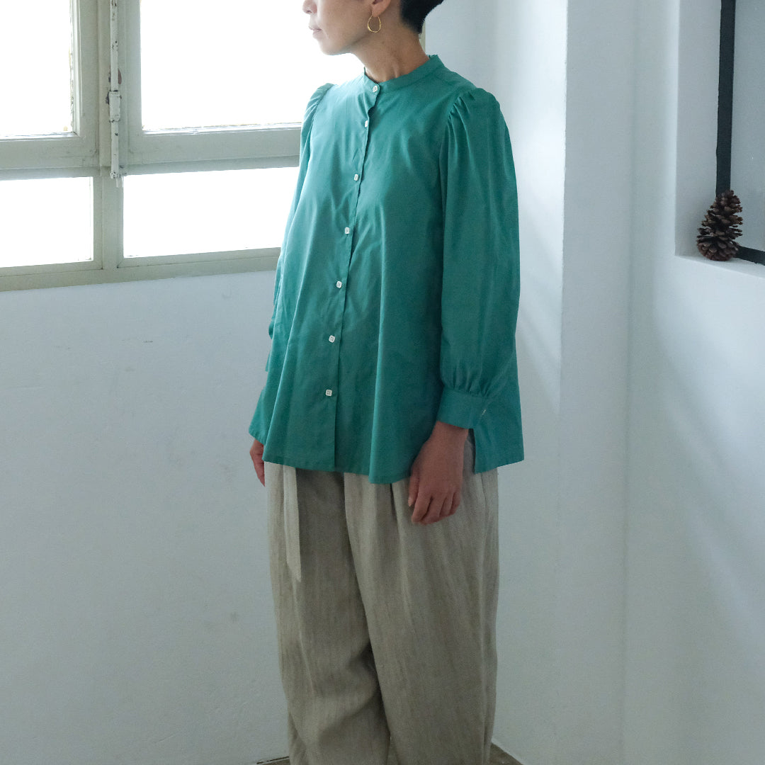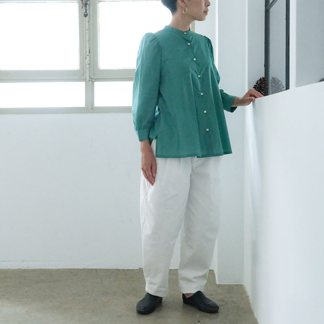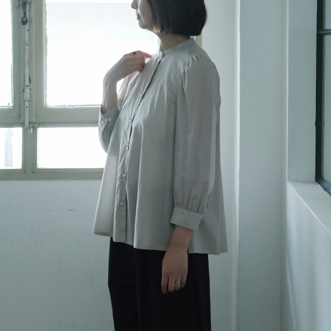 生地を変えたり色を増やしたりしながらつくり続けている、SALUÉ人気のパフスリーブシャツ。こちらでご紹介しているパフスリーブシャツロングはリネンのものに比べ少し長い丈が特長。リネンのものと比べ、薄さ・軽さに優れています。