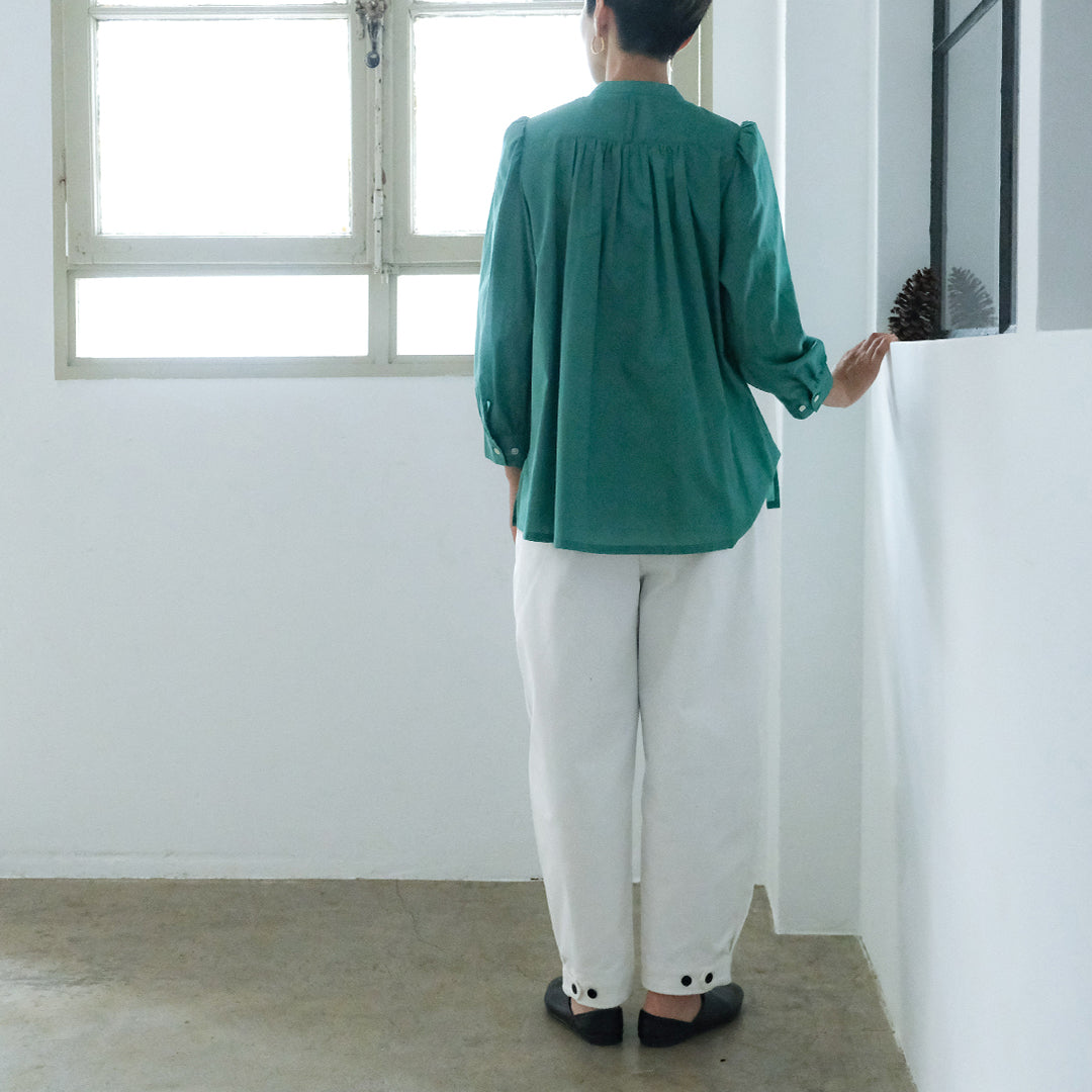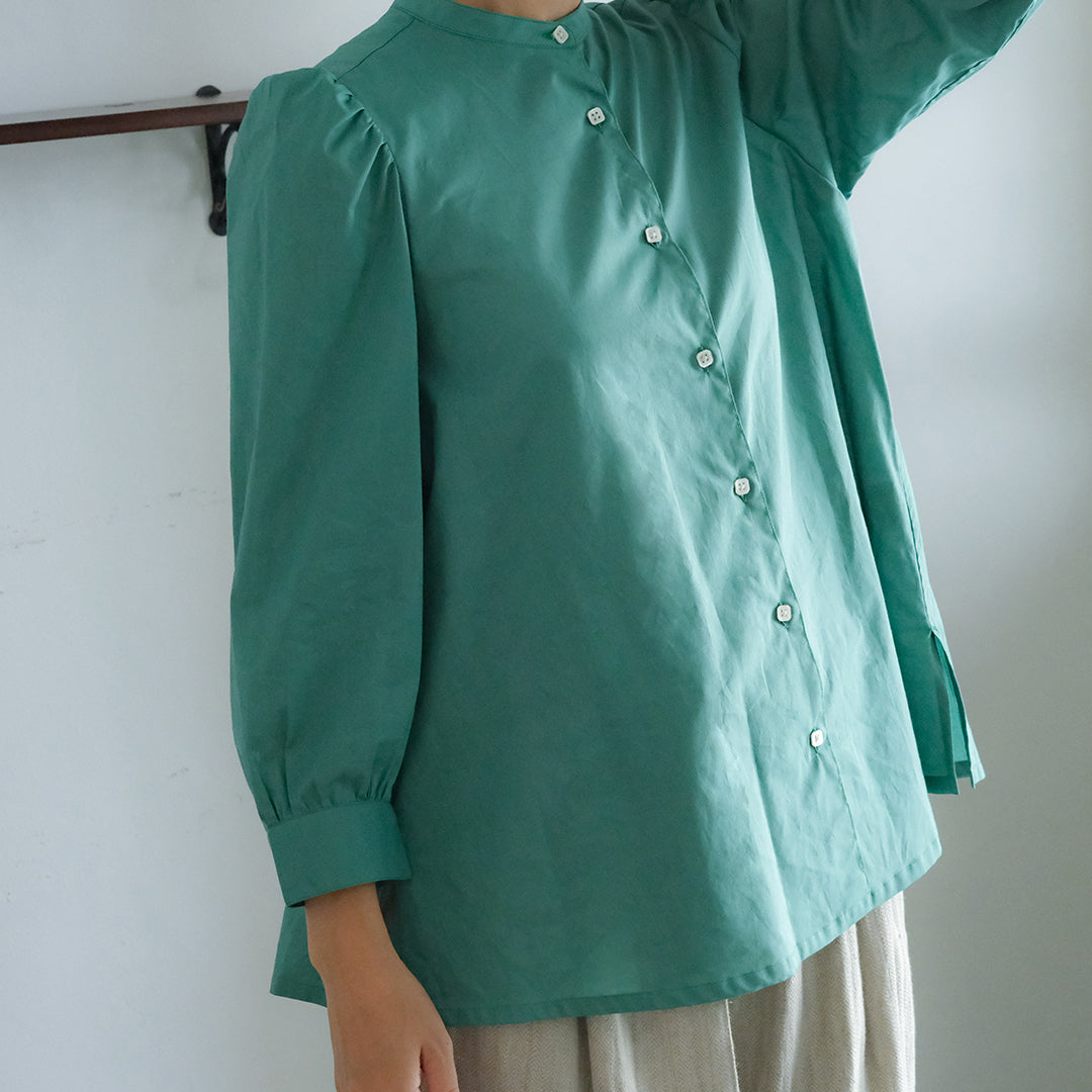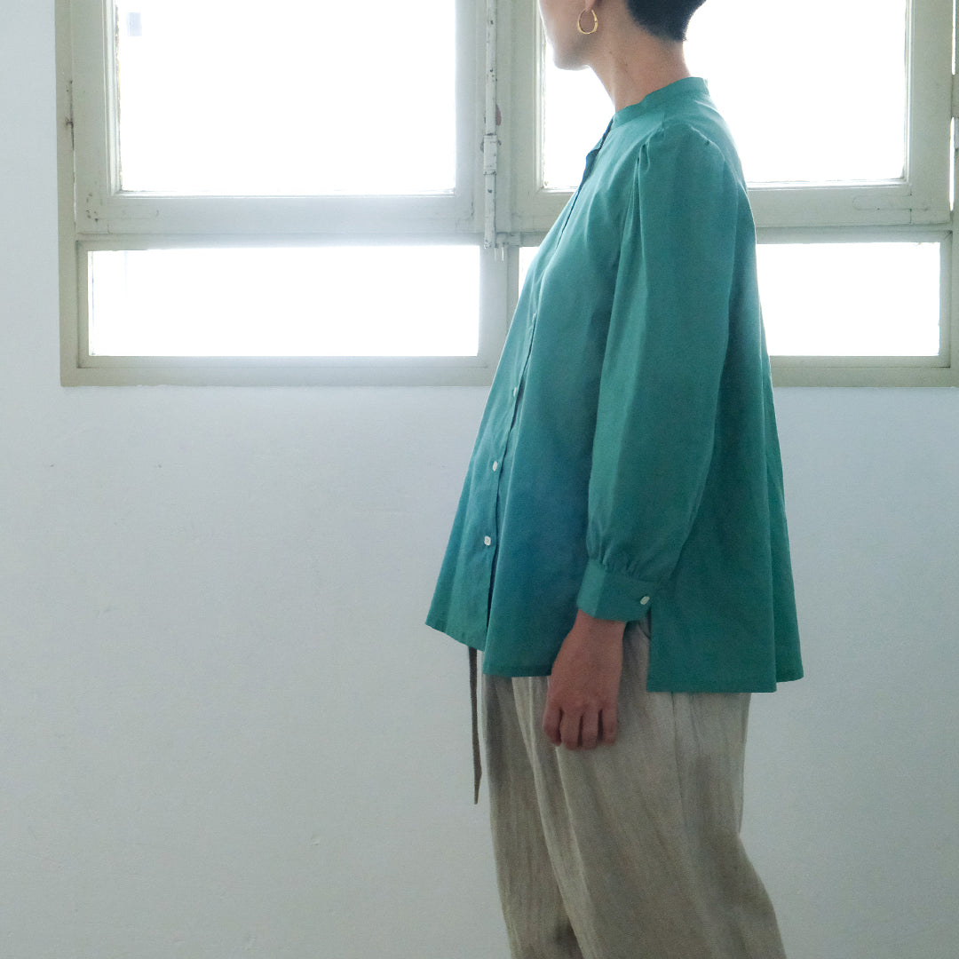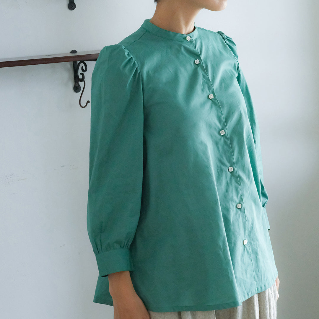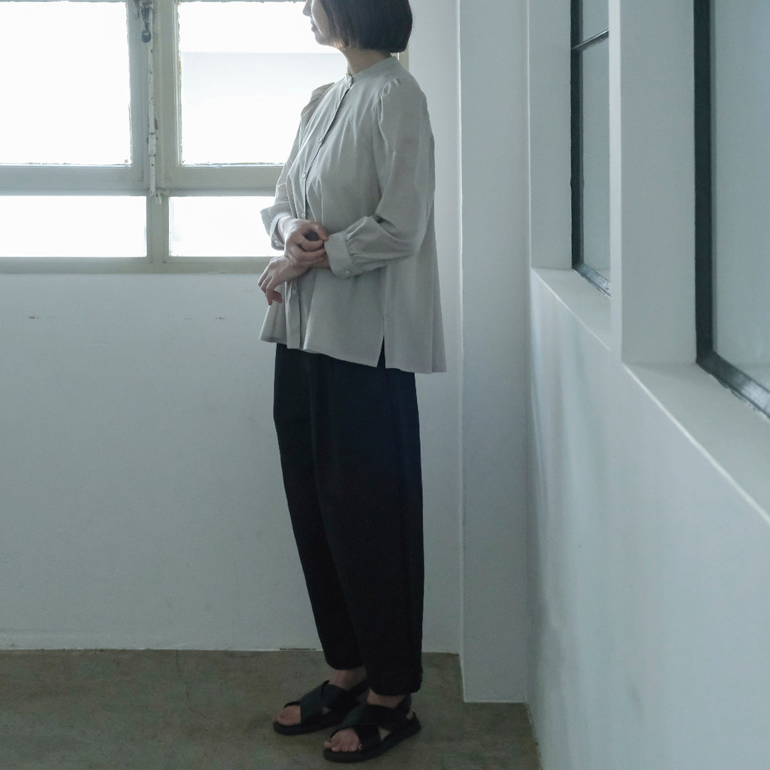 生地を変えたり色を増やしたりしながらつくり続けている、SALUÉ人気のパフスリーブシャツ。こちらでご紹介しているパフスリーブシャツロングはリネンのものに比べ少し長い丈が特長。リネンのものと比べ、薄さ・軽さに優れています。