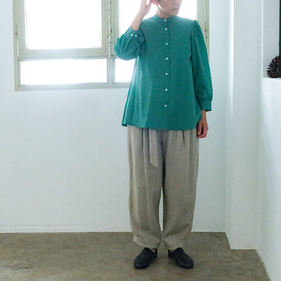 ブラックやブルーに合わせるとモードに着こなせ、ブラウンやベージュに合わせると個性的ながら落ち着いた雰囲気になります。▲ジャスパーグリーン、パンツ:エッグパンツA/ヘリンボーンリネン、モデル身長161cm
