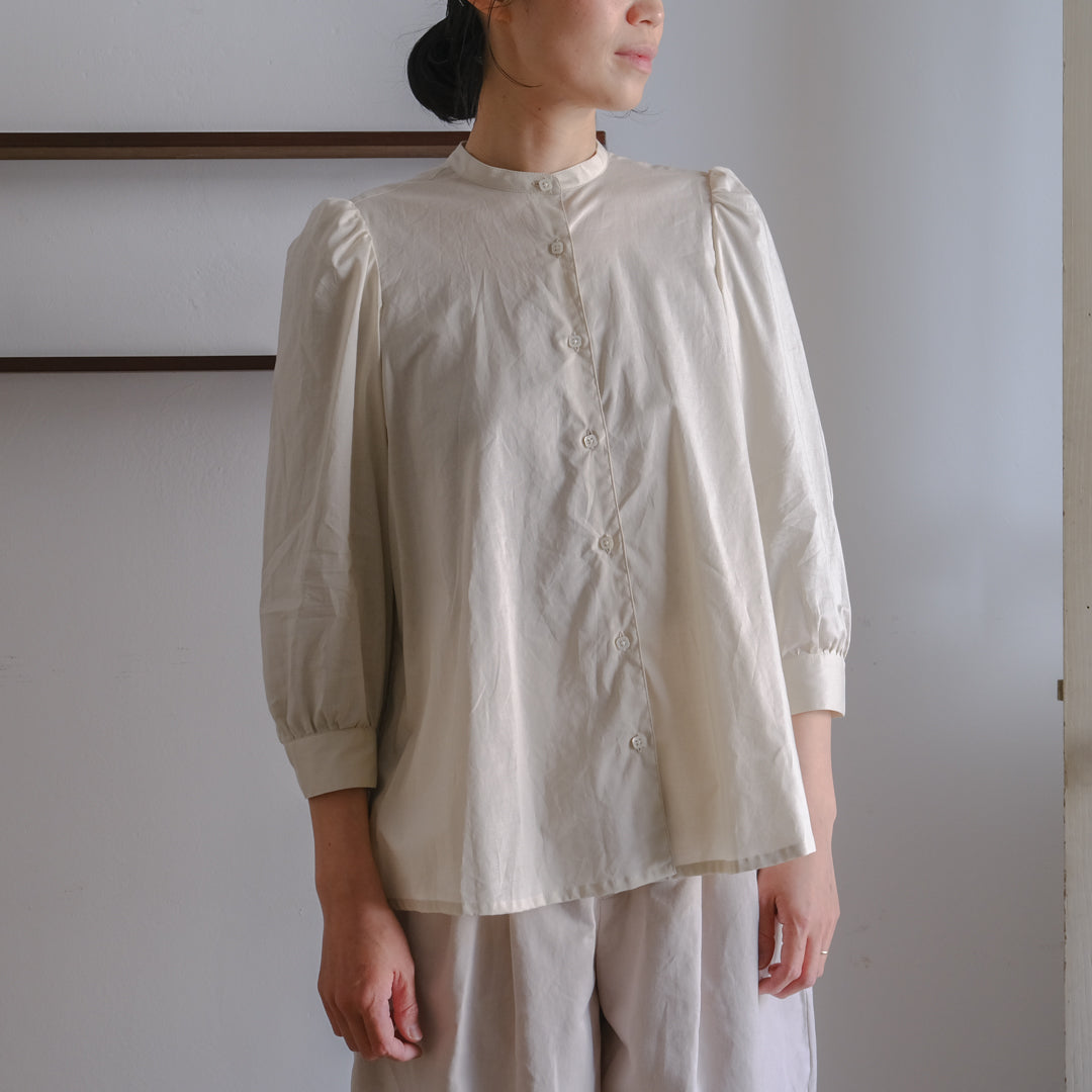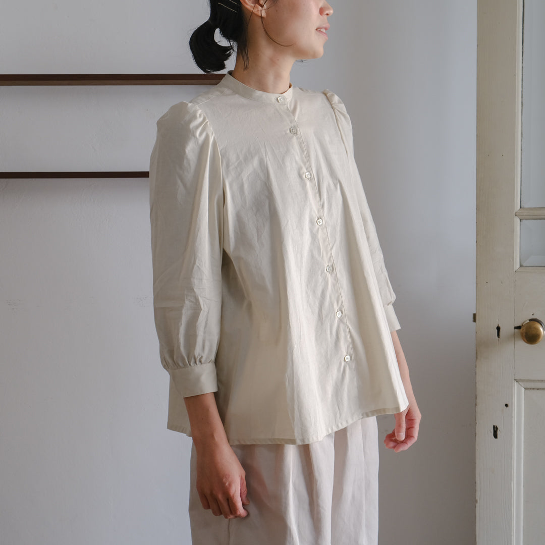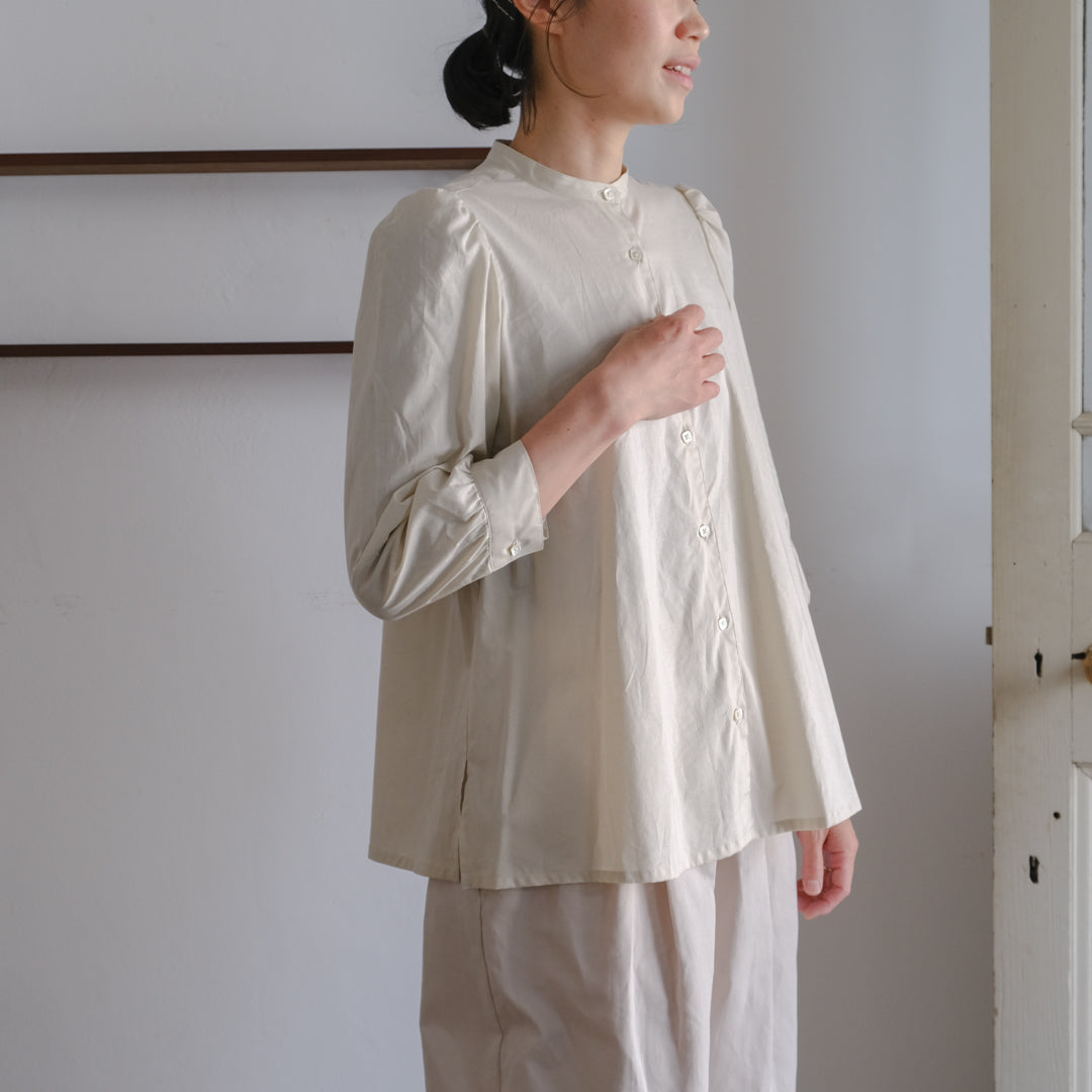 パフスリーブシャツは、肩幅と袖山のほどよいバランスにより、フリーサイズでも多くの方々にフィットするようにつくられています。体型を問わず誰もが華奢に見えることを目指したつくりです。▲アイボリーベージュ着用 モデル身長170cm