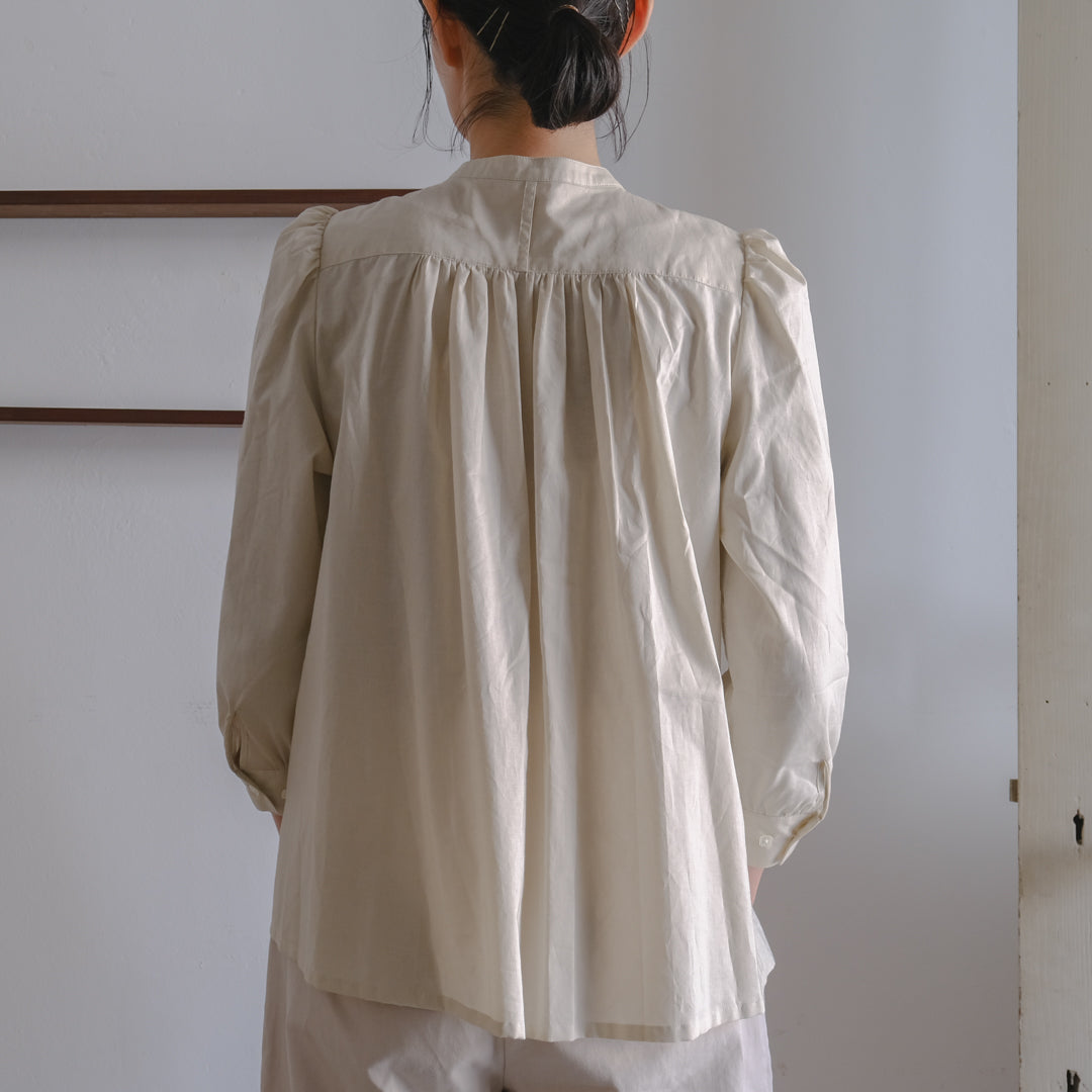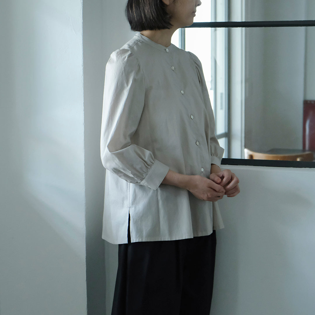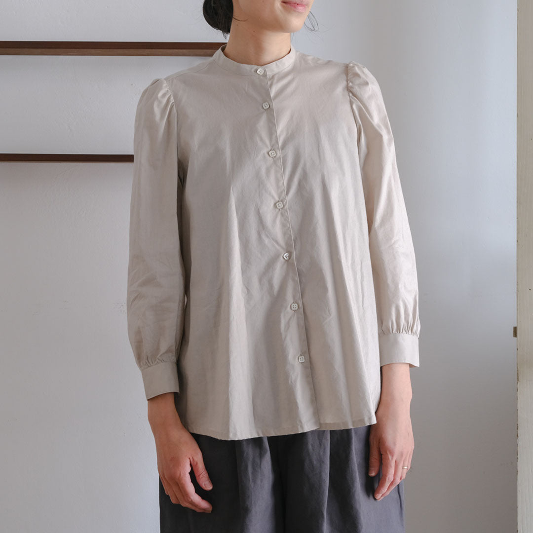 パフスリーブシャツは、肩幅と袖山のほどよいバランスにより、フリーサイズでも多くの方々にフィットするようにつくられています。体型を問わず誰もが華奢に見えることを目指したつくりです。▲アイボリーベージュ着用 モデル身長170cm