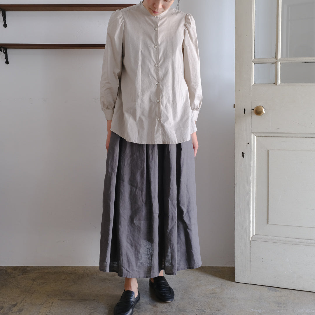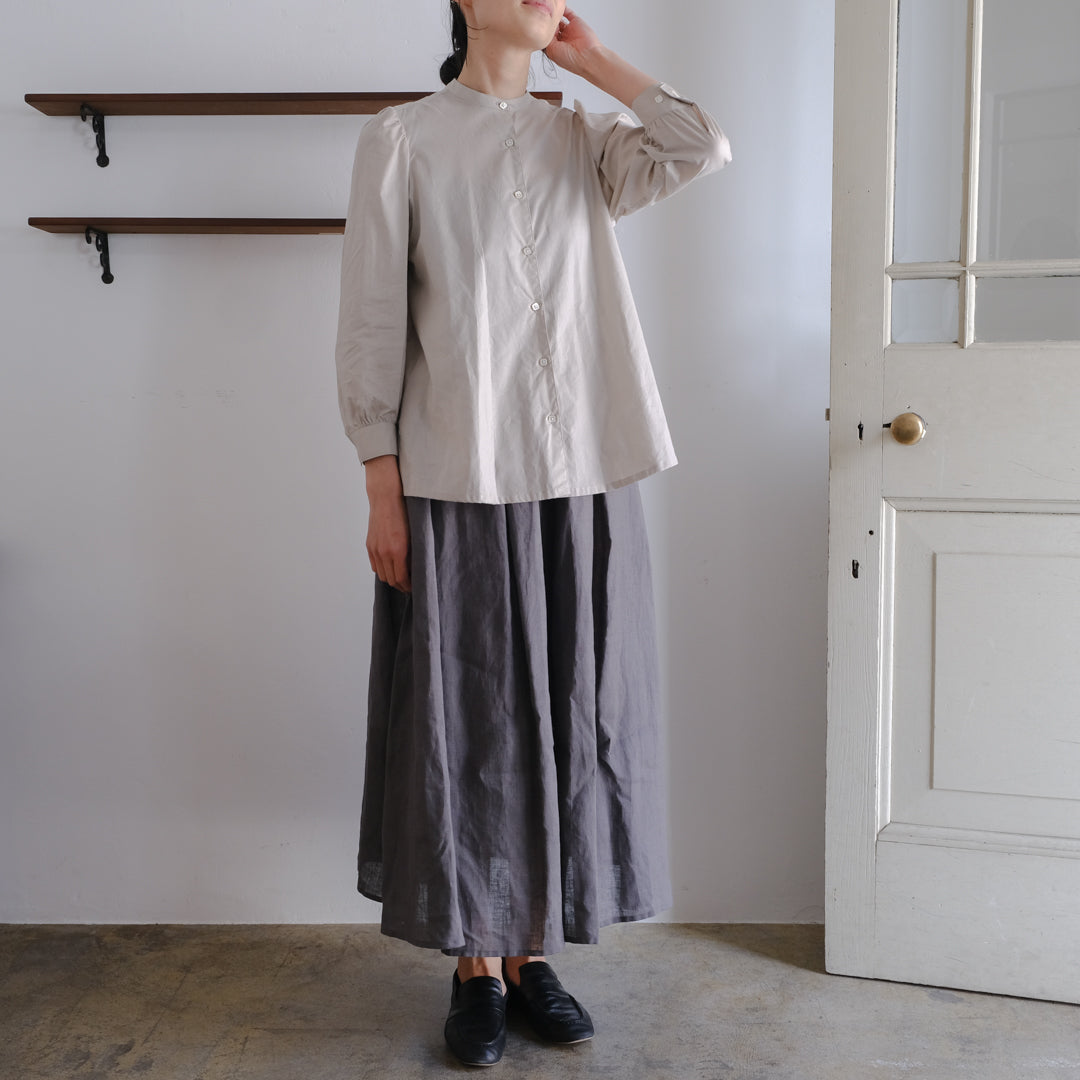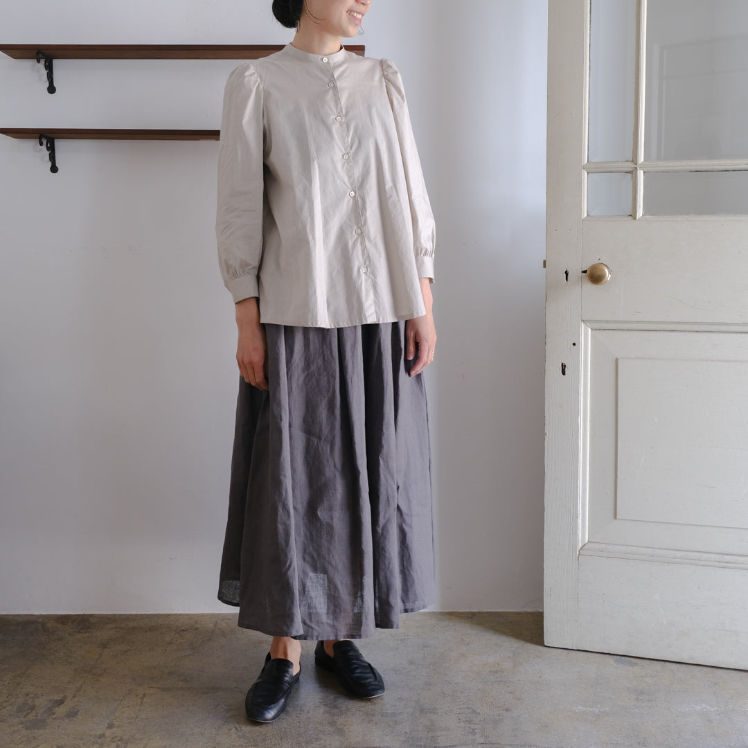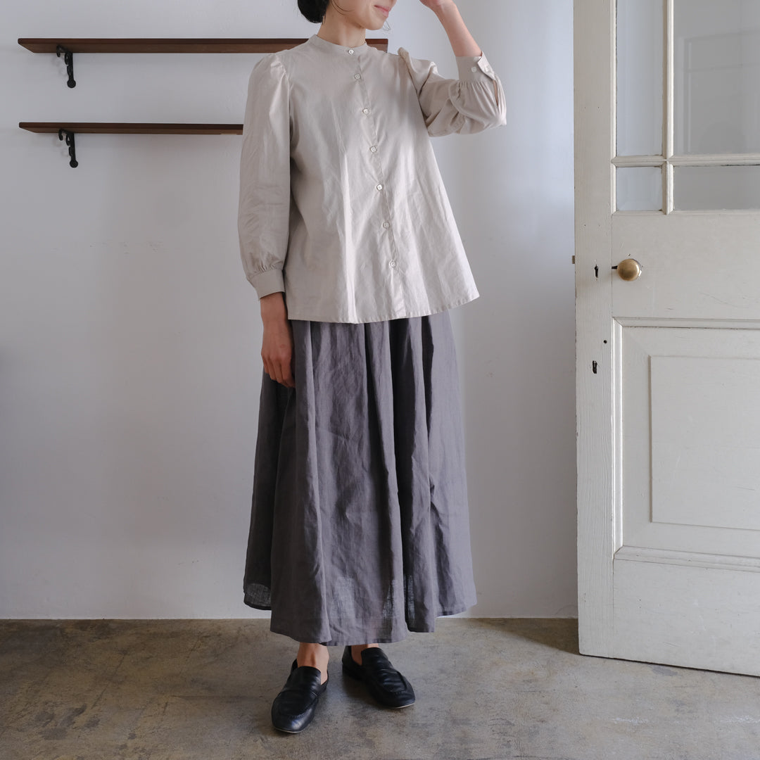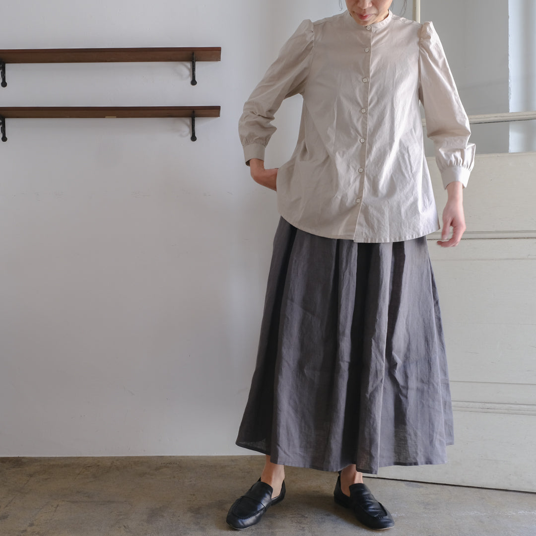 丈が少し長めにつくられたパフスリーブシャツは、着回し力抜群。外に出して着れば美しい裾のフレアを感じる上品な雰囲気に。長すぎない丈なので、ロングスカートと合わせても素敵にきまります。▲アイボリーベージュ、リトアニアンリネンタックギャザースカート/メランジェダークブラウンと合わせて。モデル身長168㎝