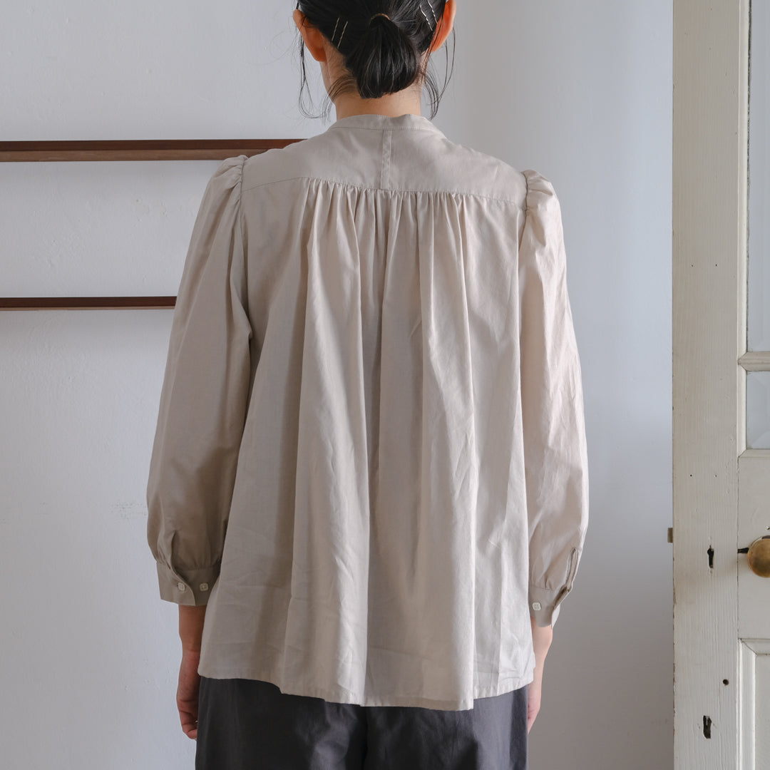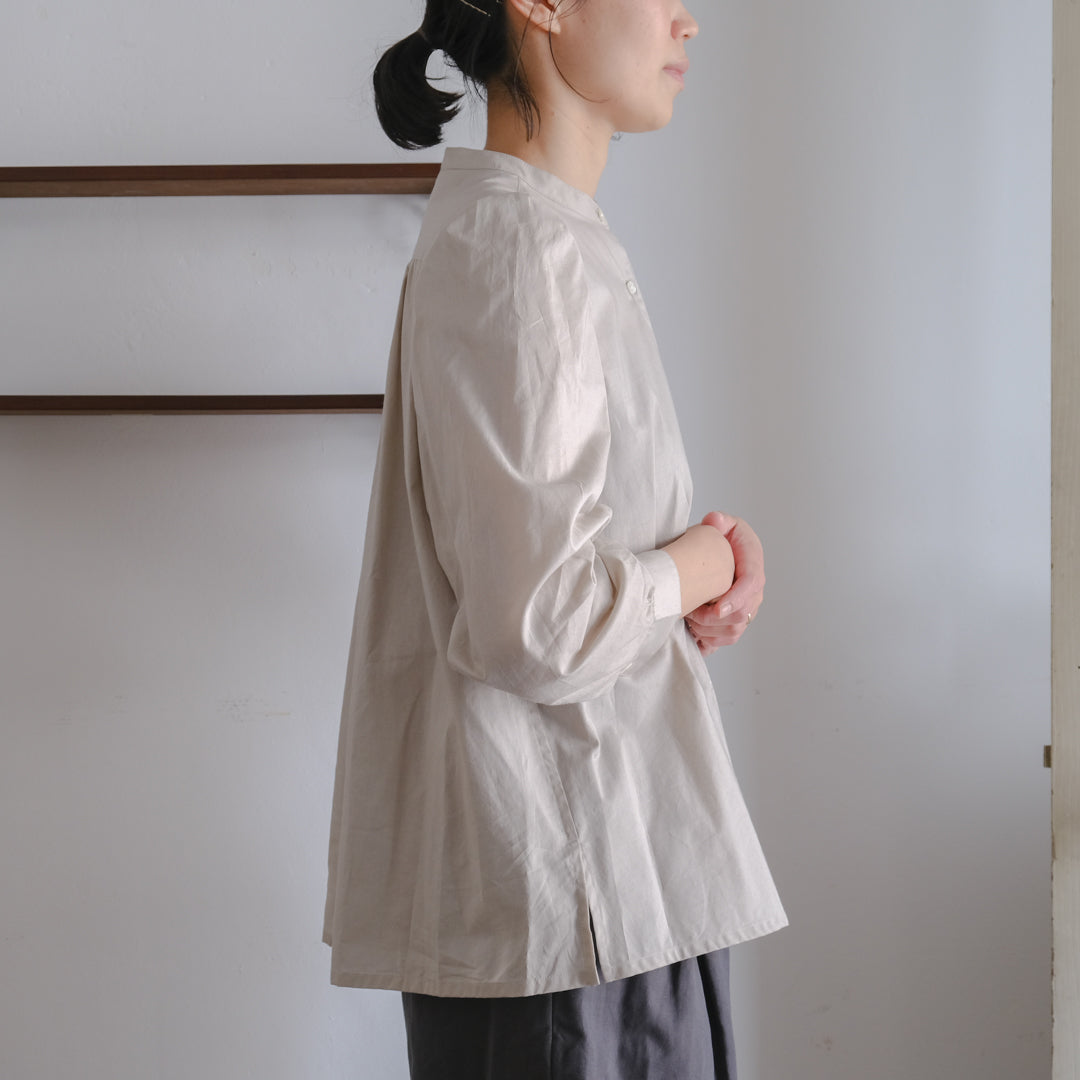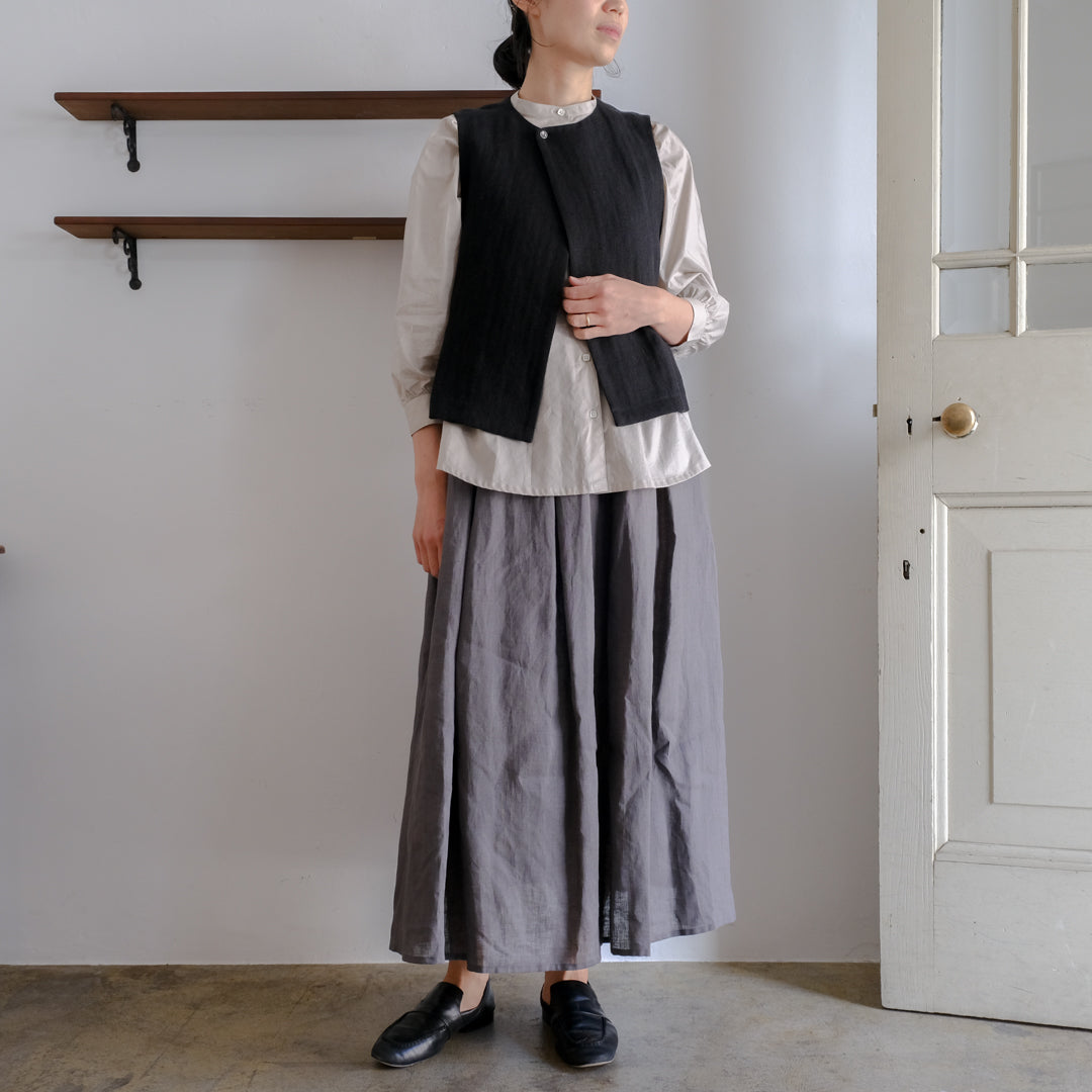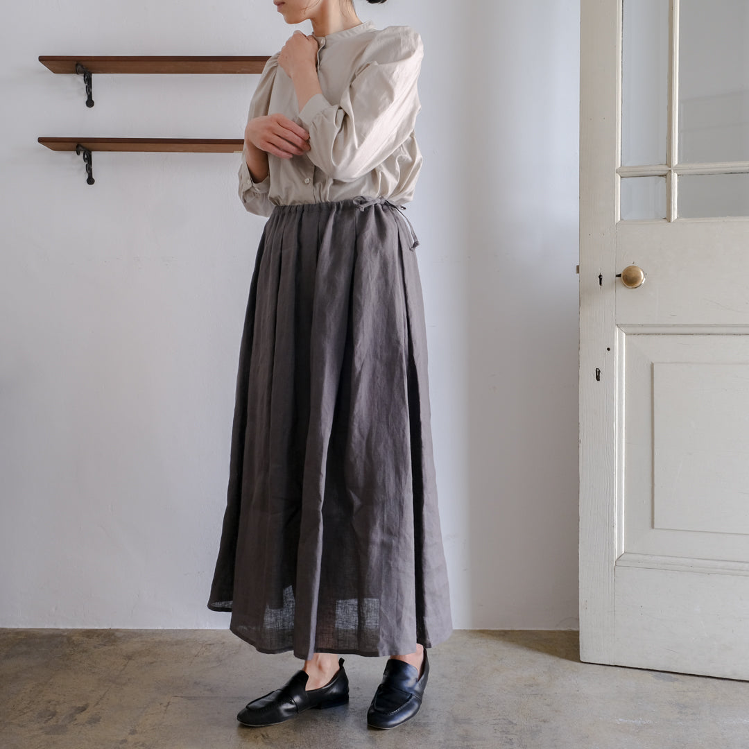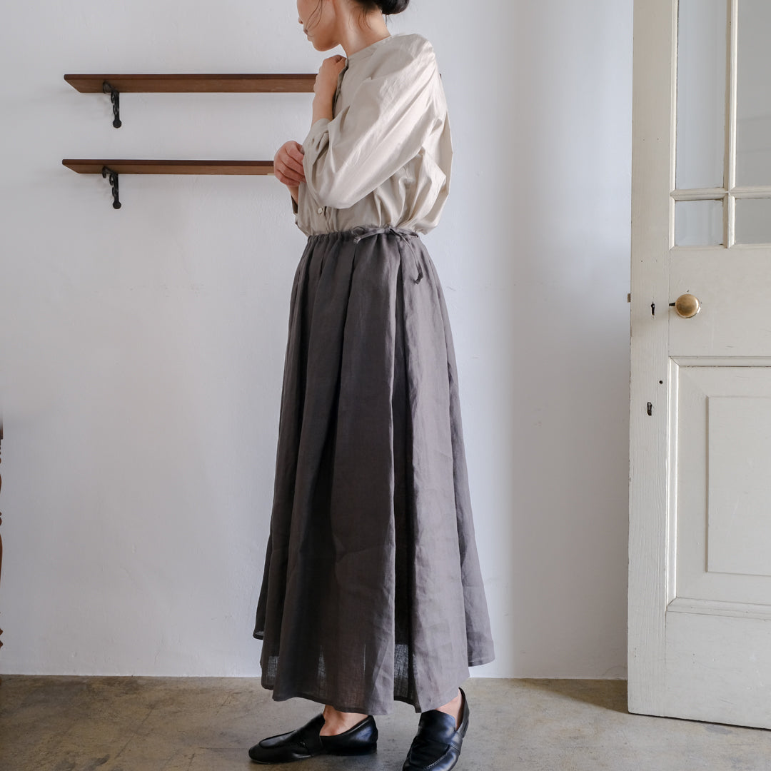 丈が少し長めにつくられたパフスリーブシャツは、着回し力抜群。外に出して着れば美しい裾のフレアを感じる上品な雰囲気に。長すぎない丈なので、ロングスカートと合わせても素敵にきまります。▲アイボリーベージュ、リトアニアンリネンタックギャザースカート/メランジェダークブラウンと合わせて。モデル身長168㎝