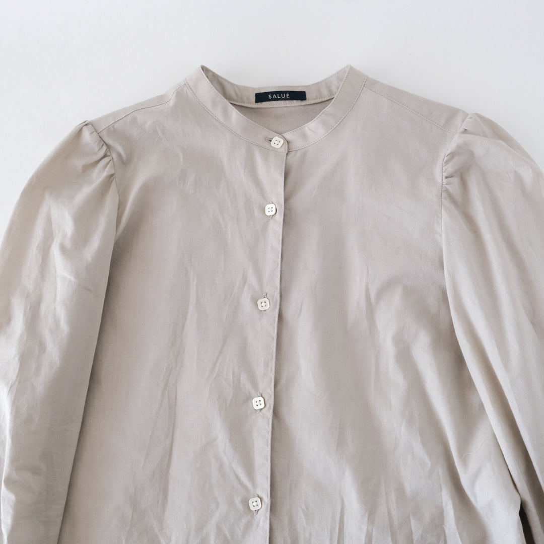 SALUEの定番アイテムパフスリーブシャツのロング丈。どんなボトムスにも合わせやすい丈、お仕事にも相応しいなめらかなコットン素材が特長です。