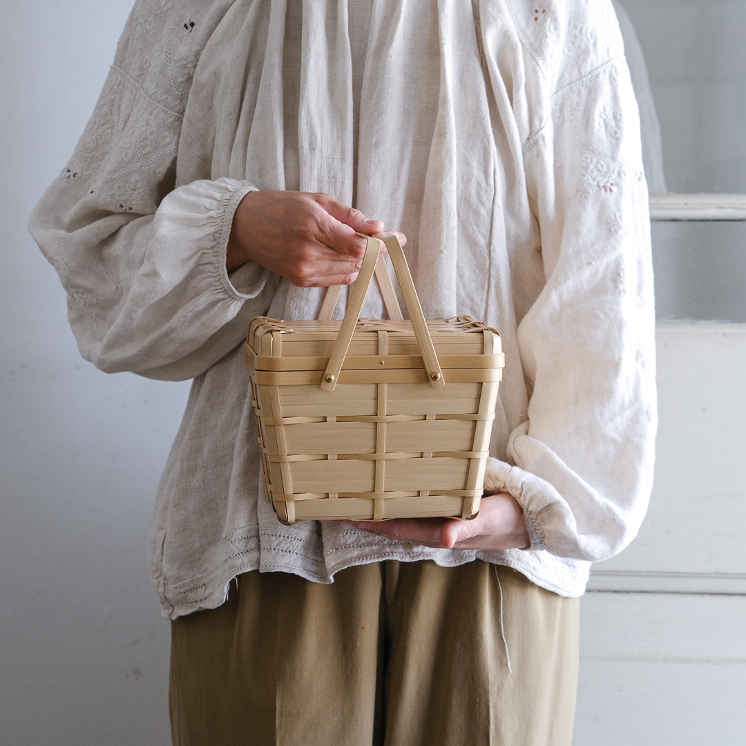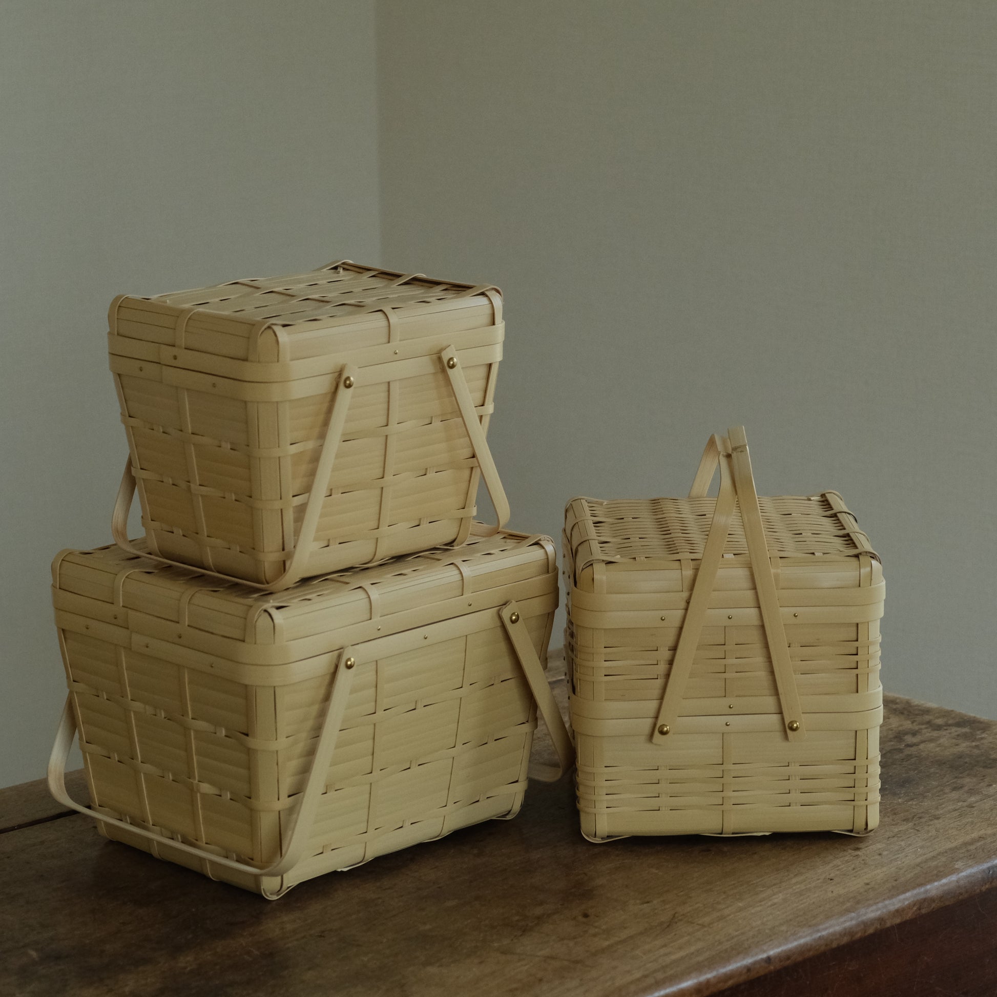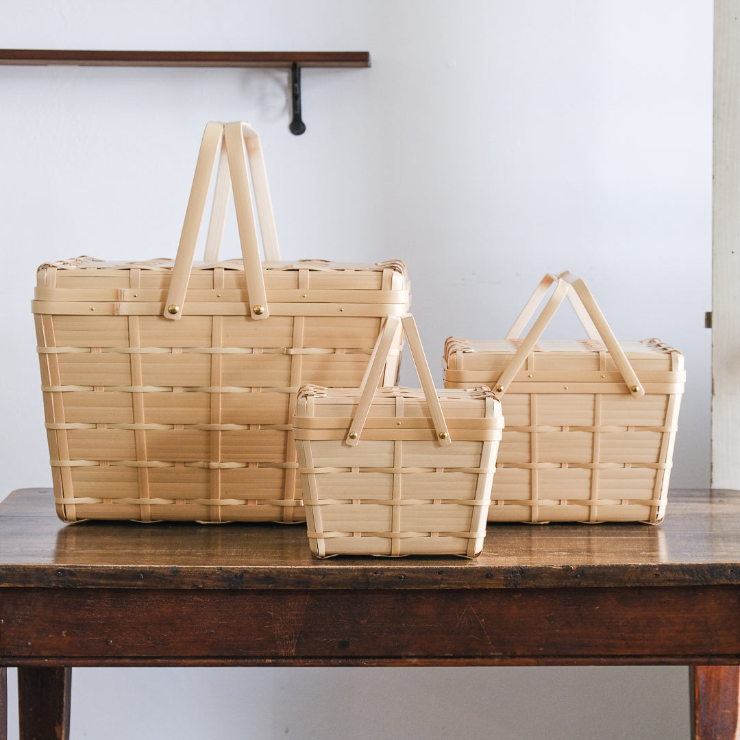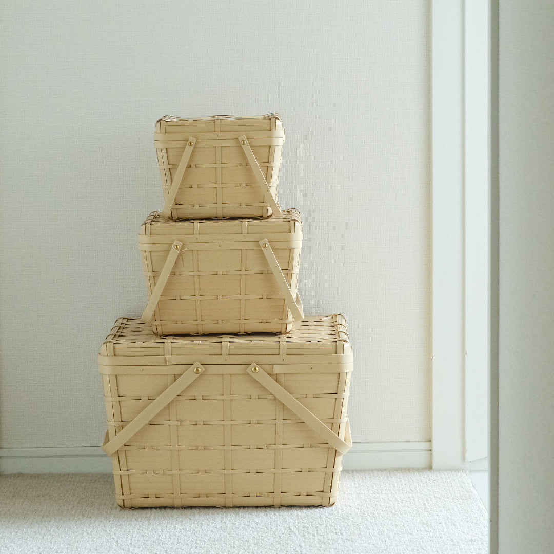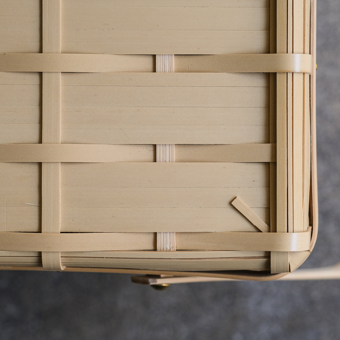 素材は真竹。その真竹に熱処理を施し、油や色を抜いた「白竹」を使い編まれています。ふたつきのバスケットは懐かしさも感じさせますが、白竹のみずみずしい透明感、逆台形の抜け感のある形はどこかモダンな印象も与えます。▲S