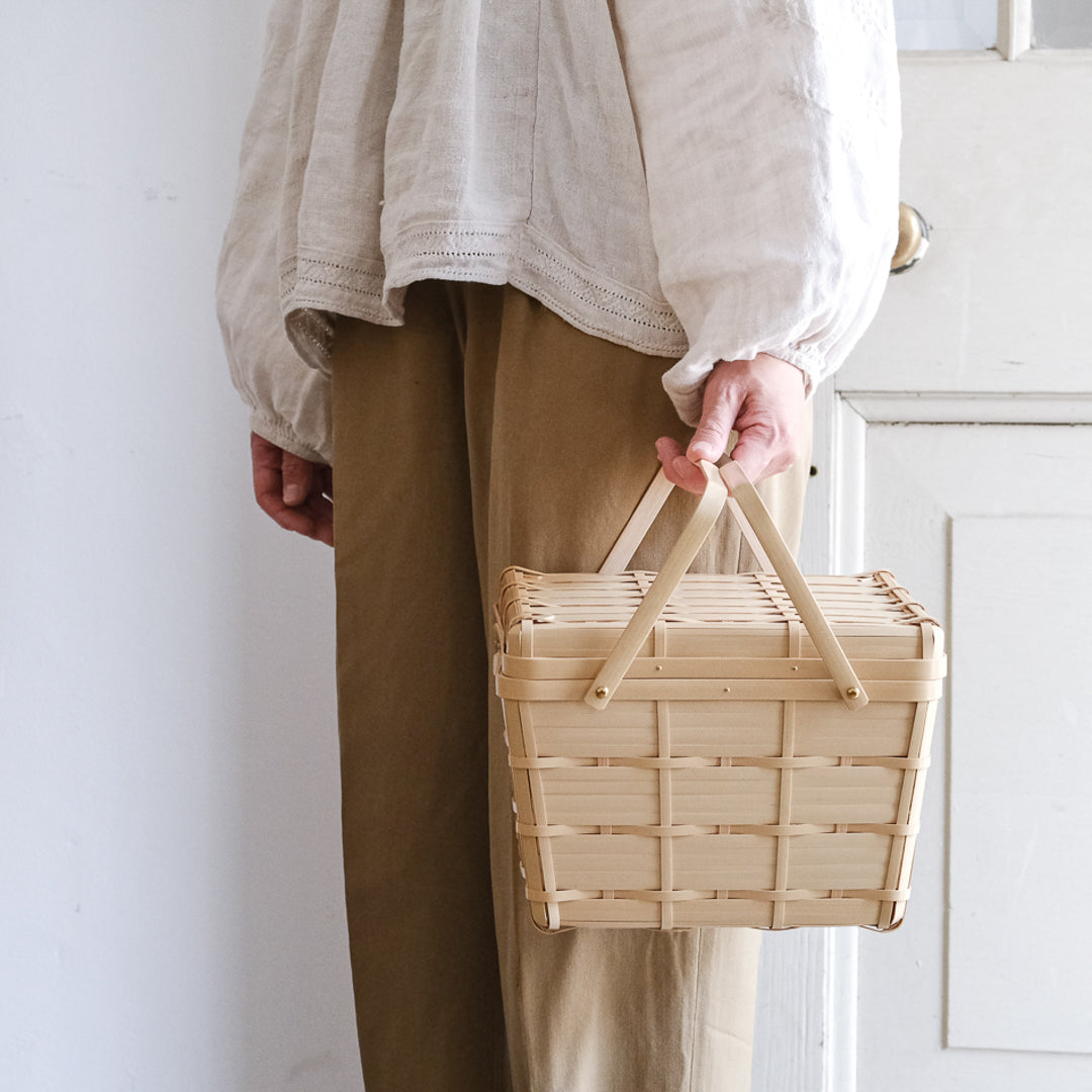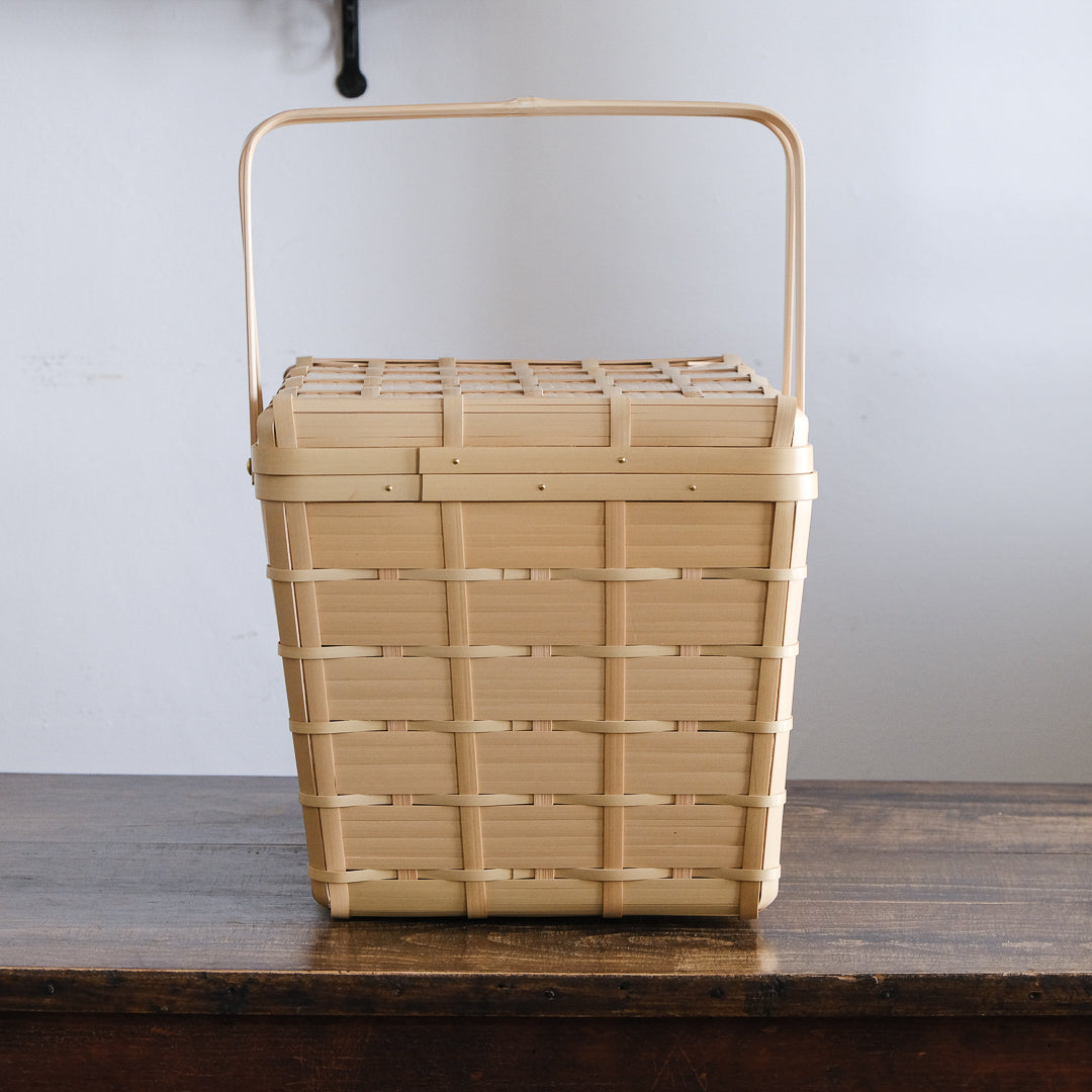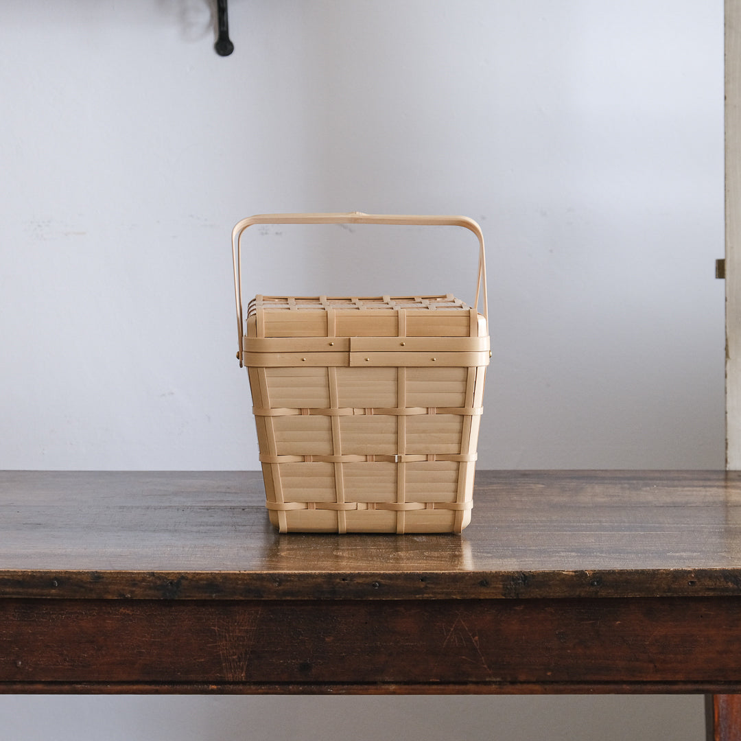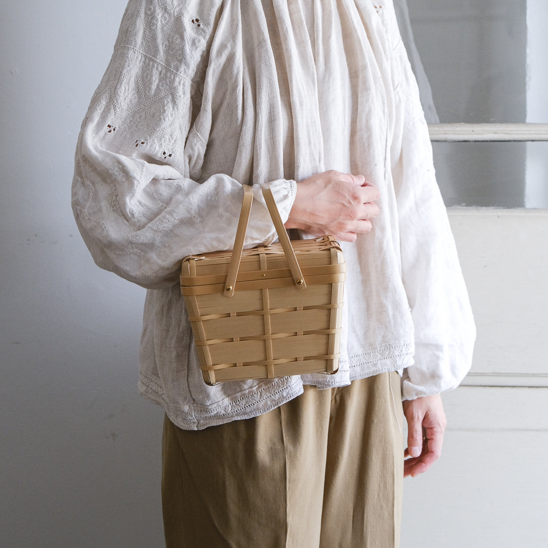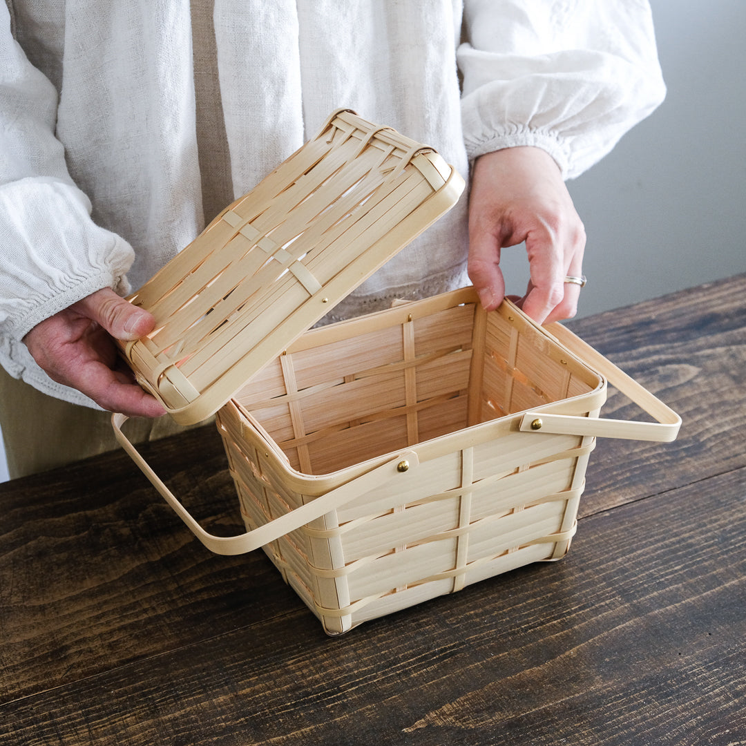 素材は真竹。その真竹に熱処理を施し、油や色を抜いた「白竹」を使い編まれています。ふたつきのバスケットは懐かしさも感じさせますが、白竹のみずみずしい透明感、逆台形の抜け感のある形はどこかモダンな印象も与えます。▲S