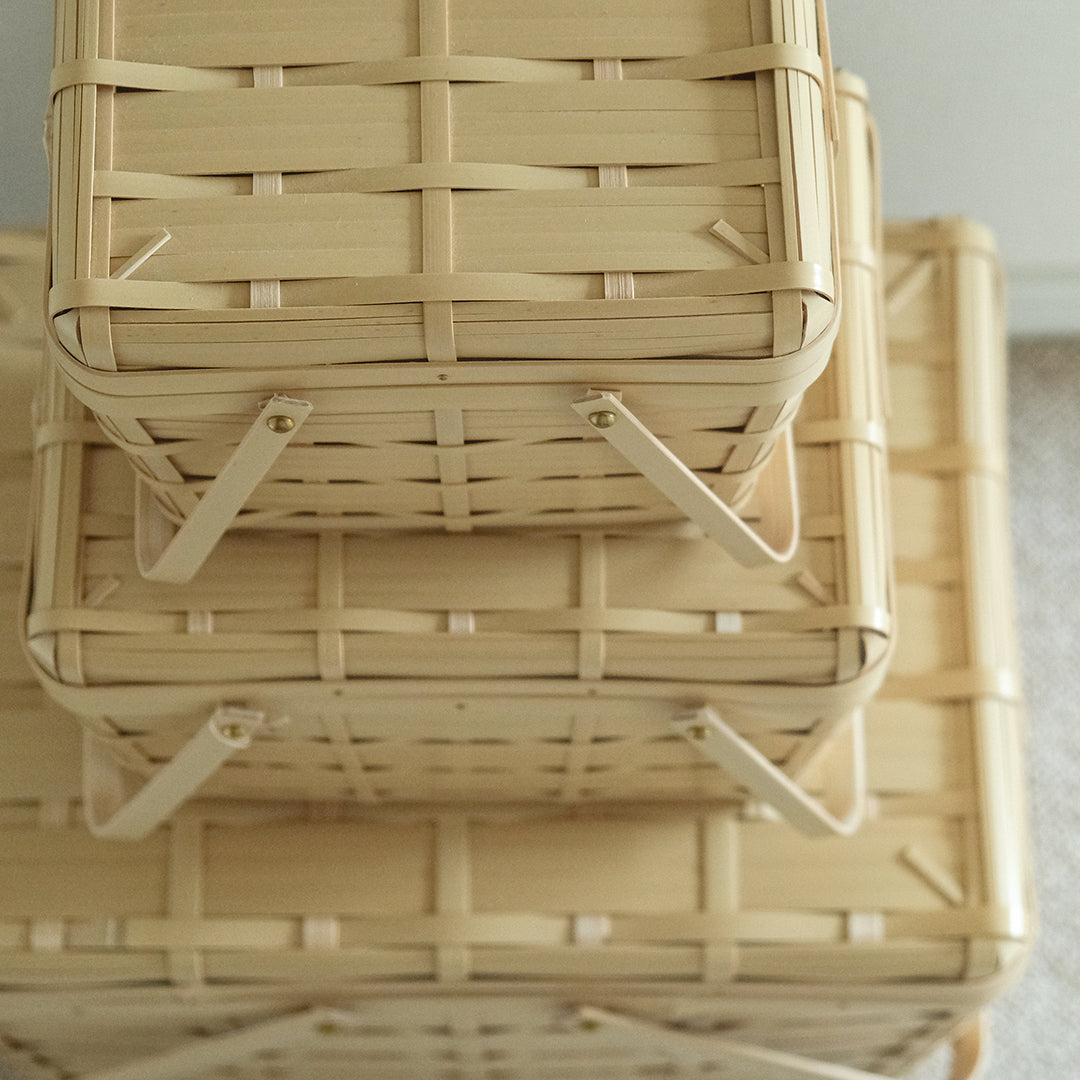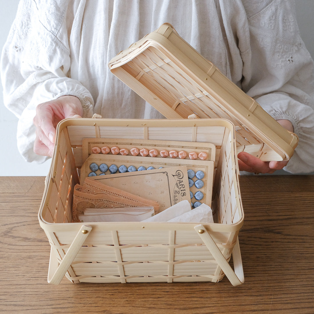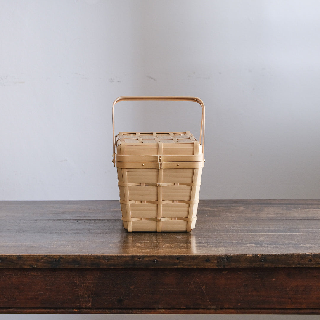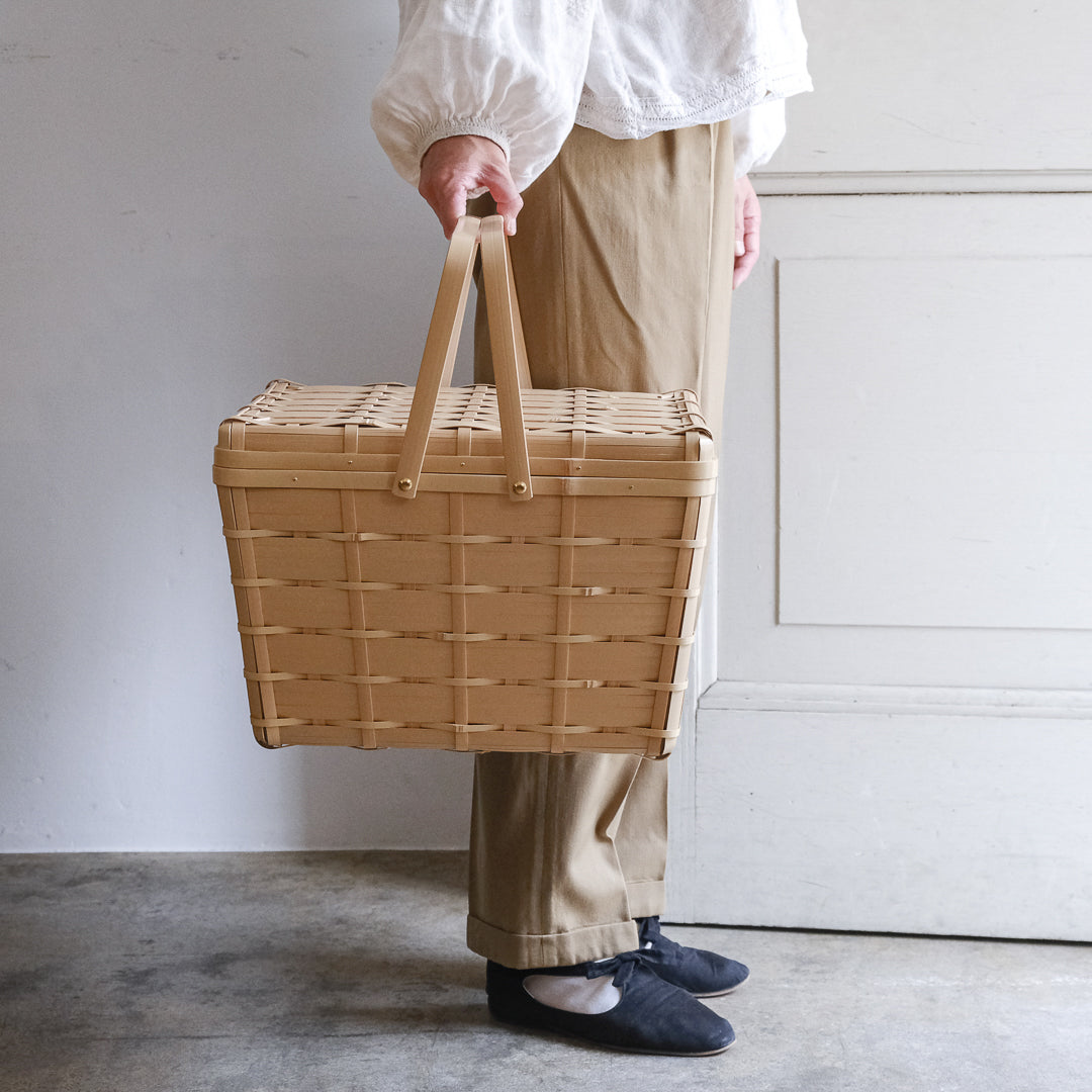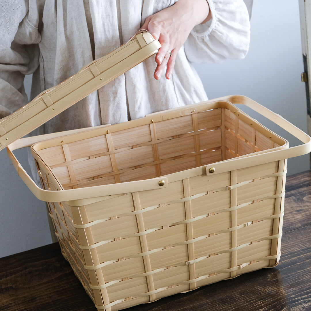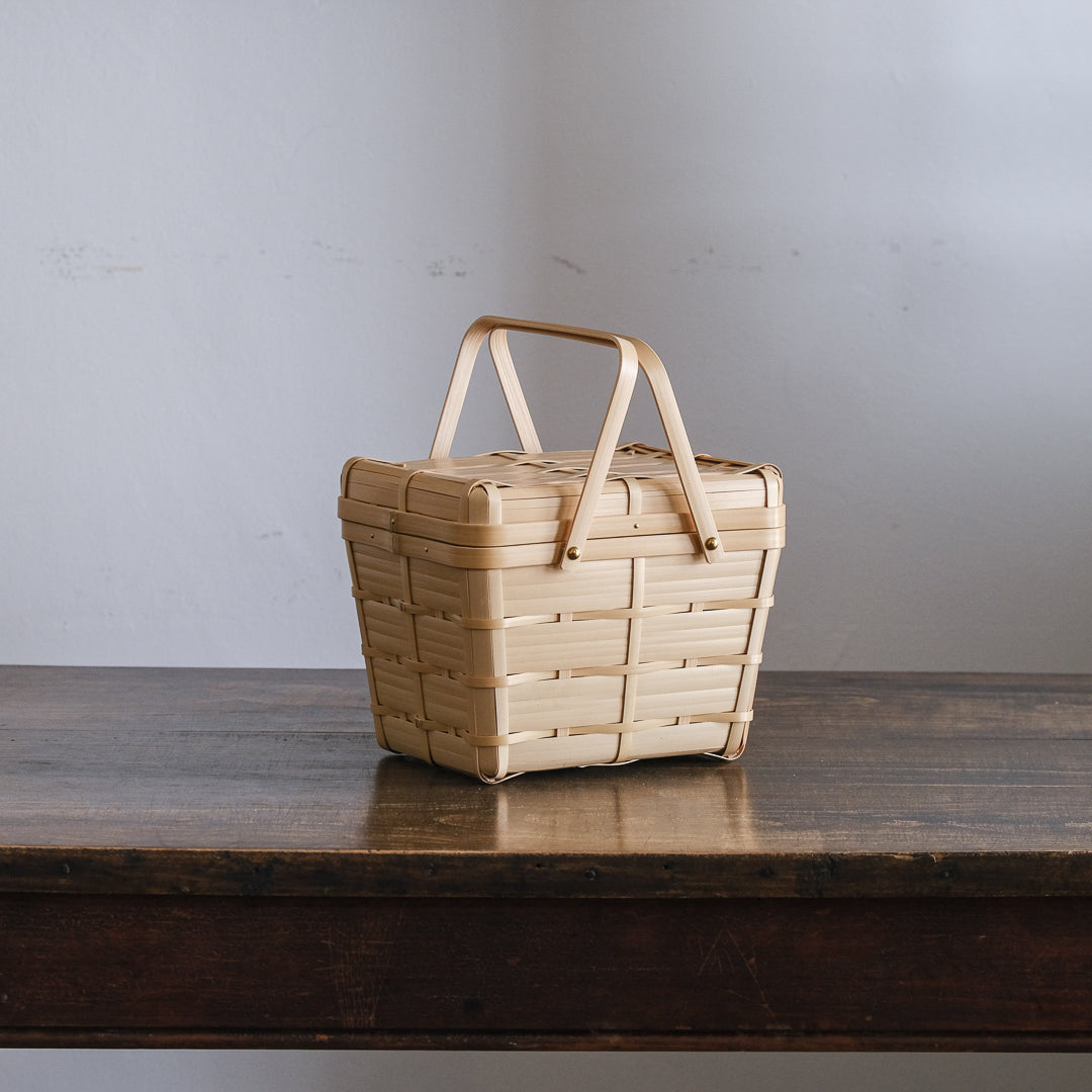 素材は真竹。その真竹に熱処理を施し、油や色を抜いた「白竹」を使い編まれています。ふたつきのバスケットは懐かしさも感じさせますが、白竹のみずみずしい透明感、逆台形の抜け感のある形はどこかモダンな印象も与えます。▲S