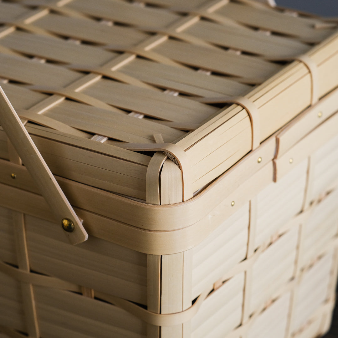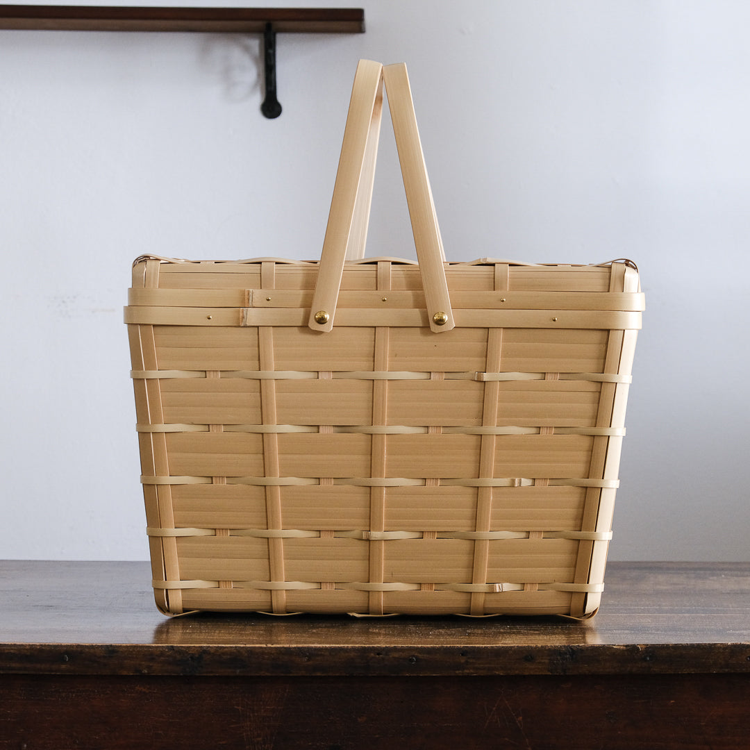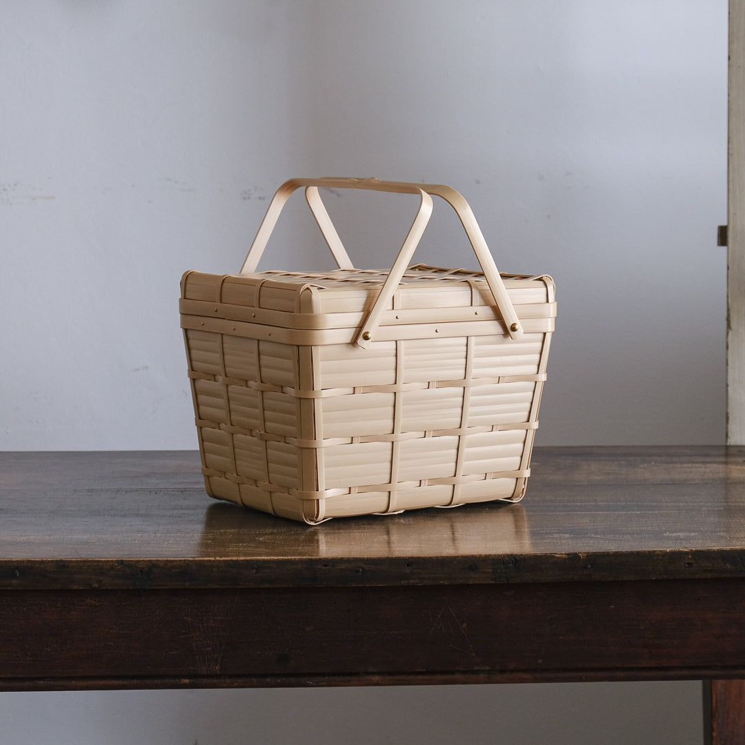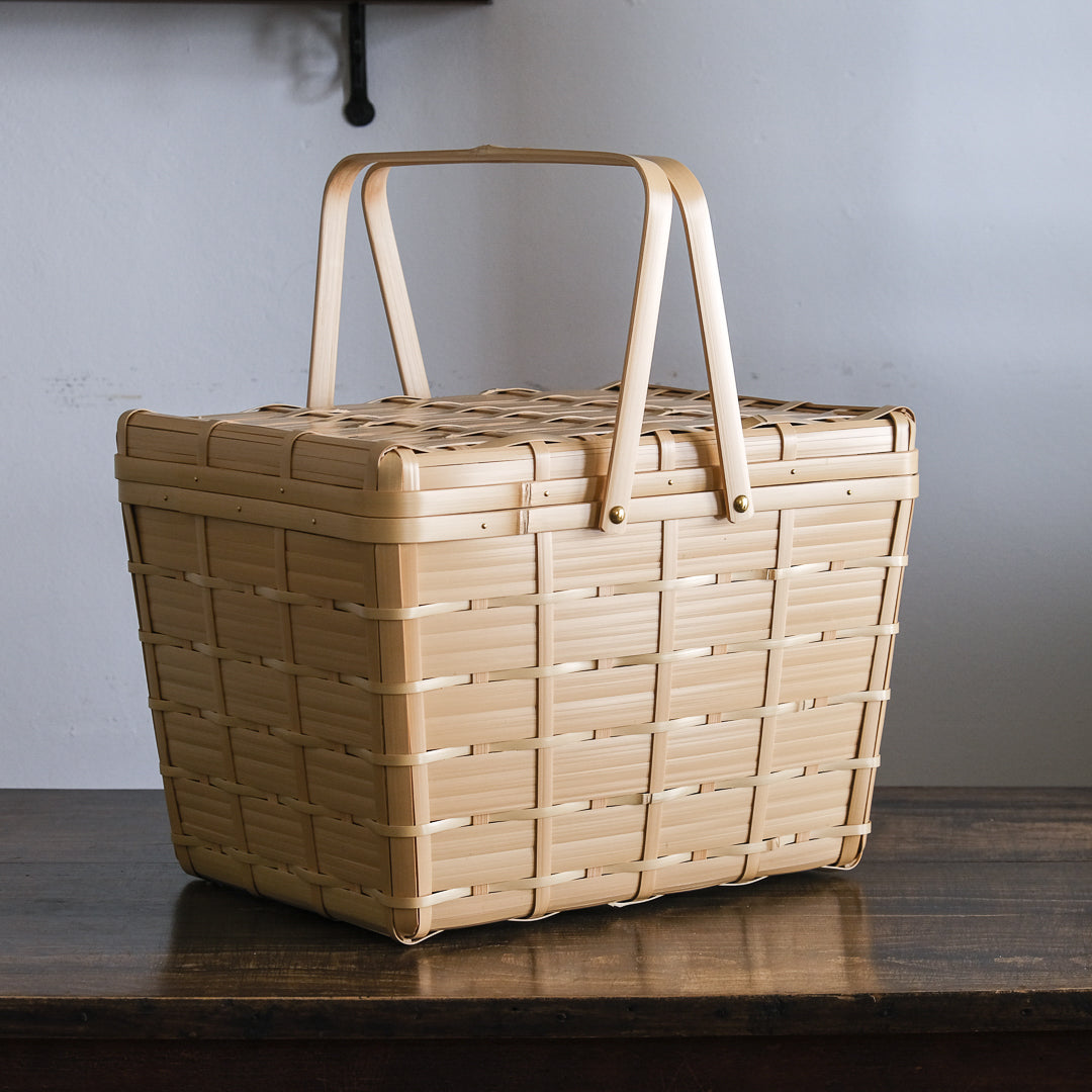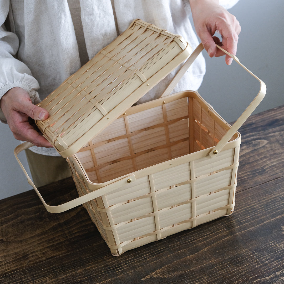素材は真竹。その真竹に熱処理を施し、油や色を抜いた「白竹」を使い編まれています。ふたつきのバスケットは懐かしさも感じさせますが、白竹のみずみずしい透明感、逆台形の抜け感のある形はどこかモダンな印象も与えます。▲S