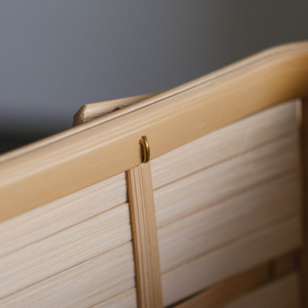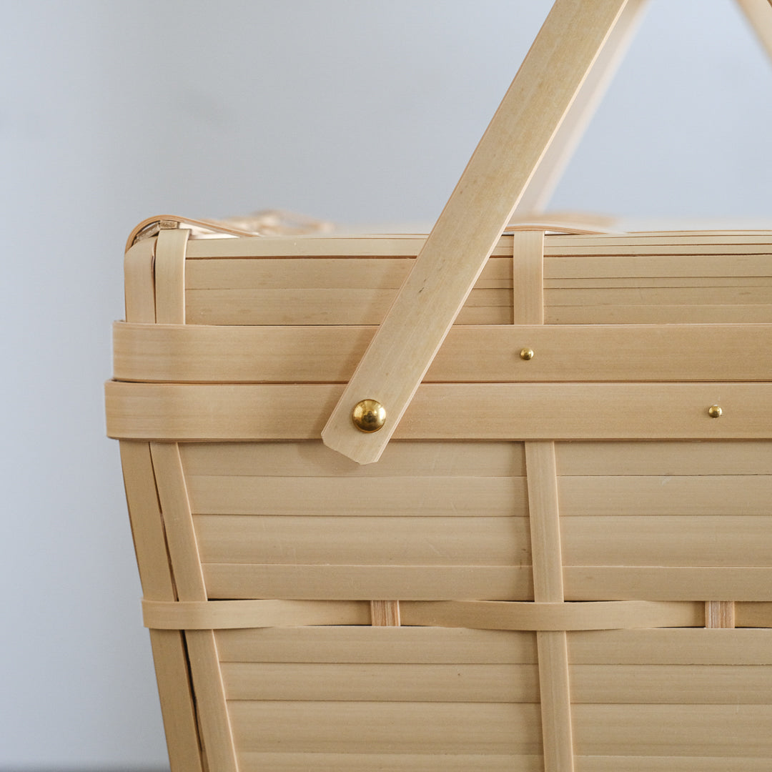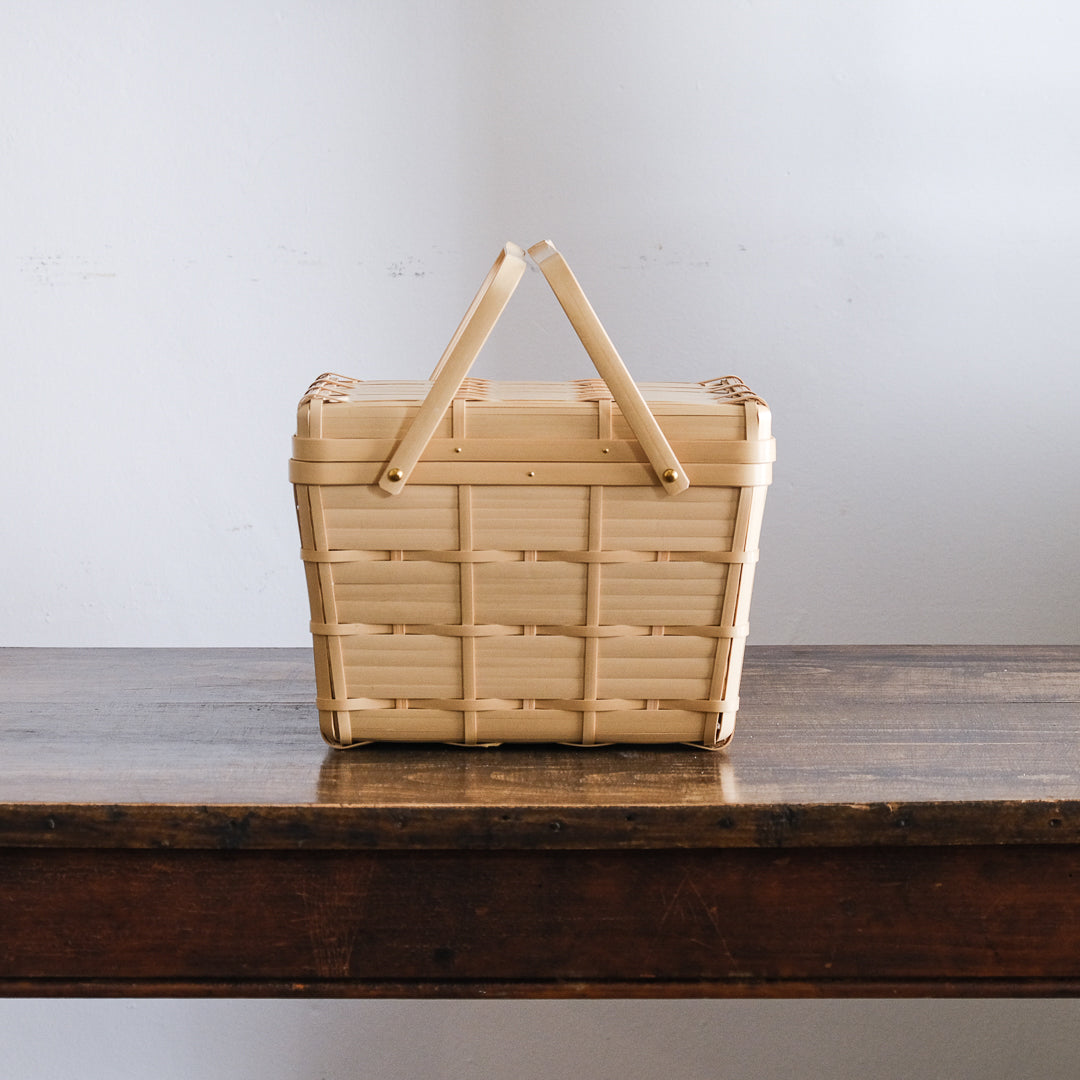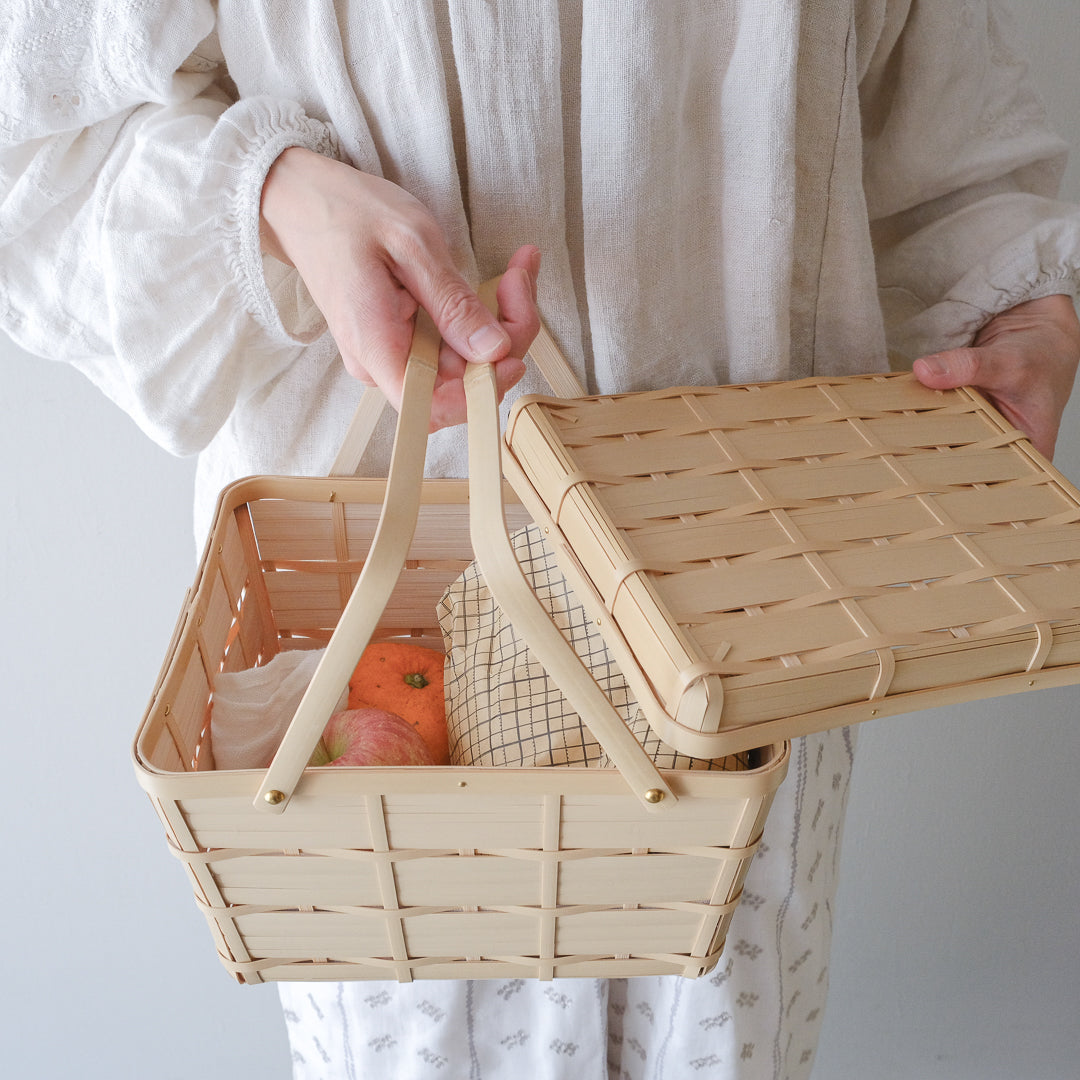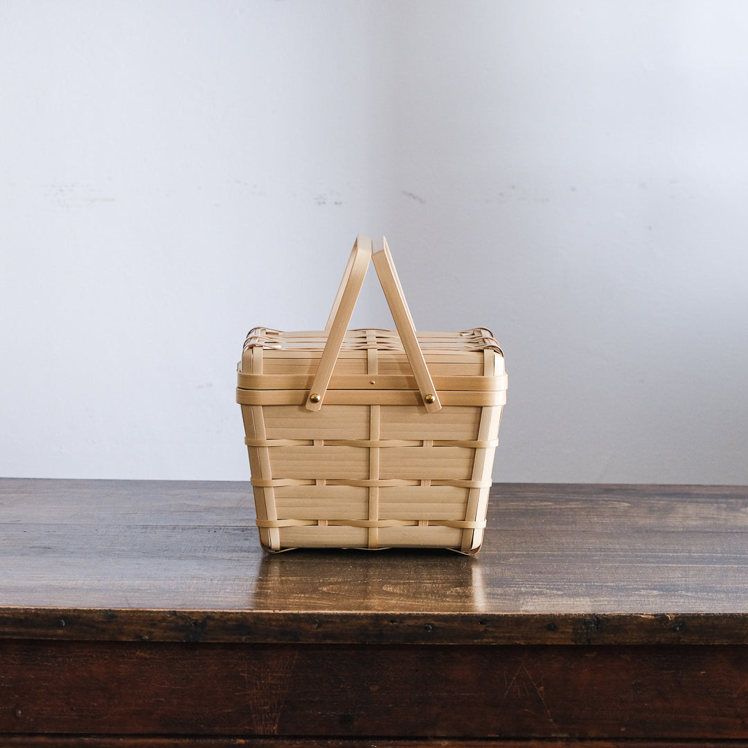 素材は真竹。その真竹に熱処理を施し、油や色を抜いた「白竹」を使い編まれています。ふたつきのバスケットは懐かしさも感じさせますが、白竹のみずみずしい透明感、逆台形の抜け感のある形はどこかモダンな印象も与えます。▲S