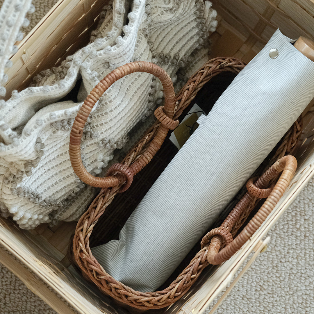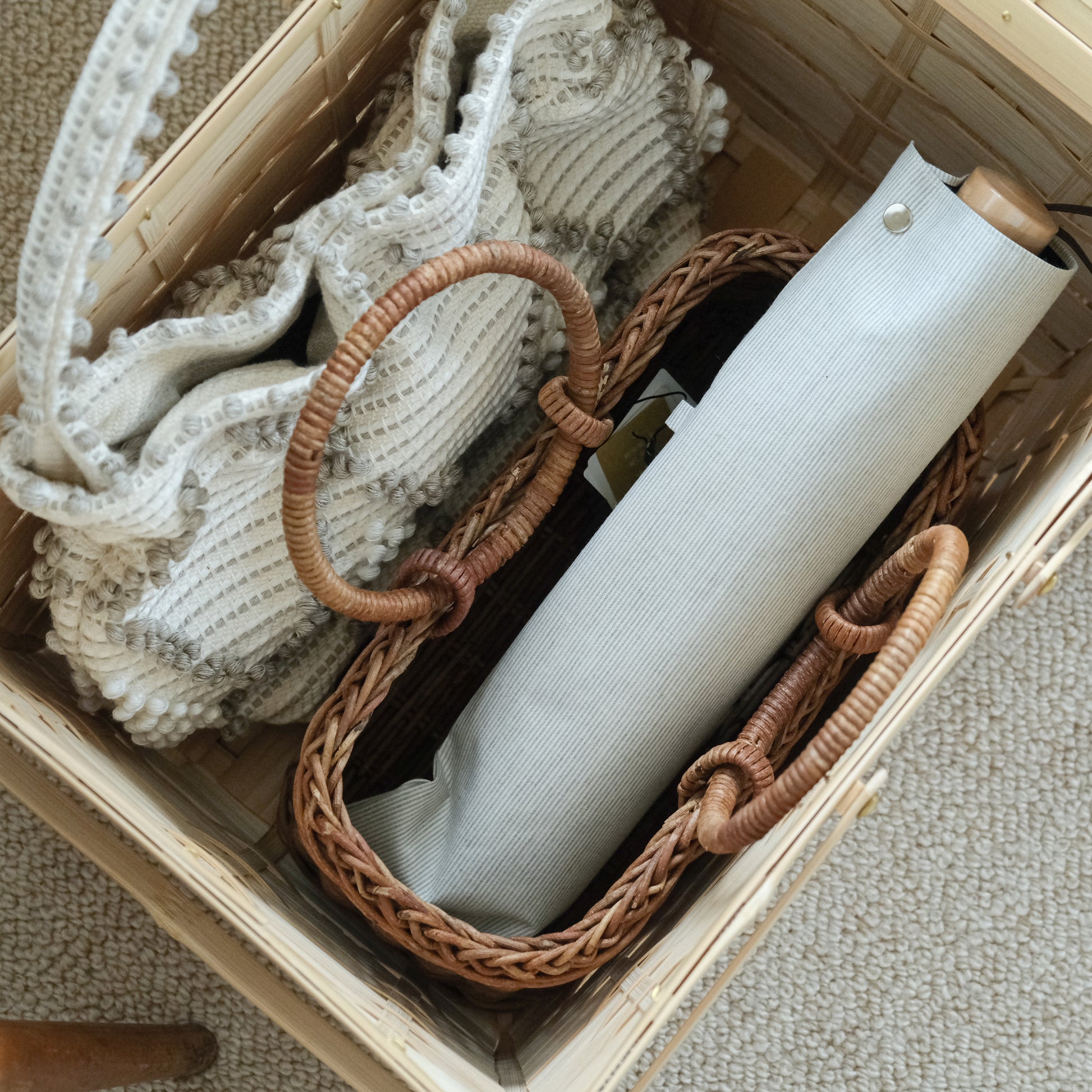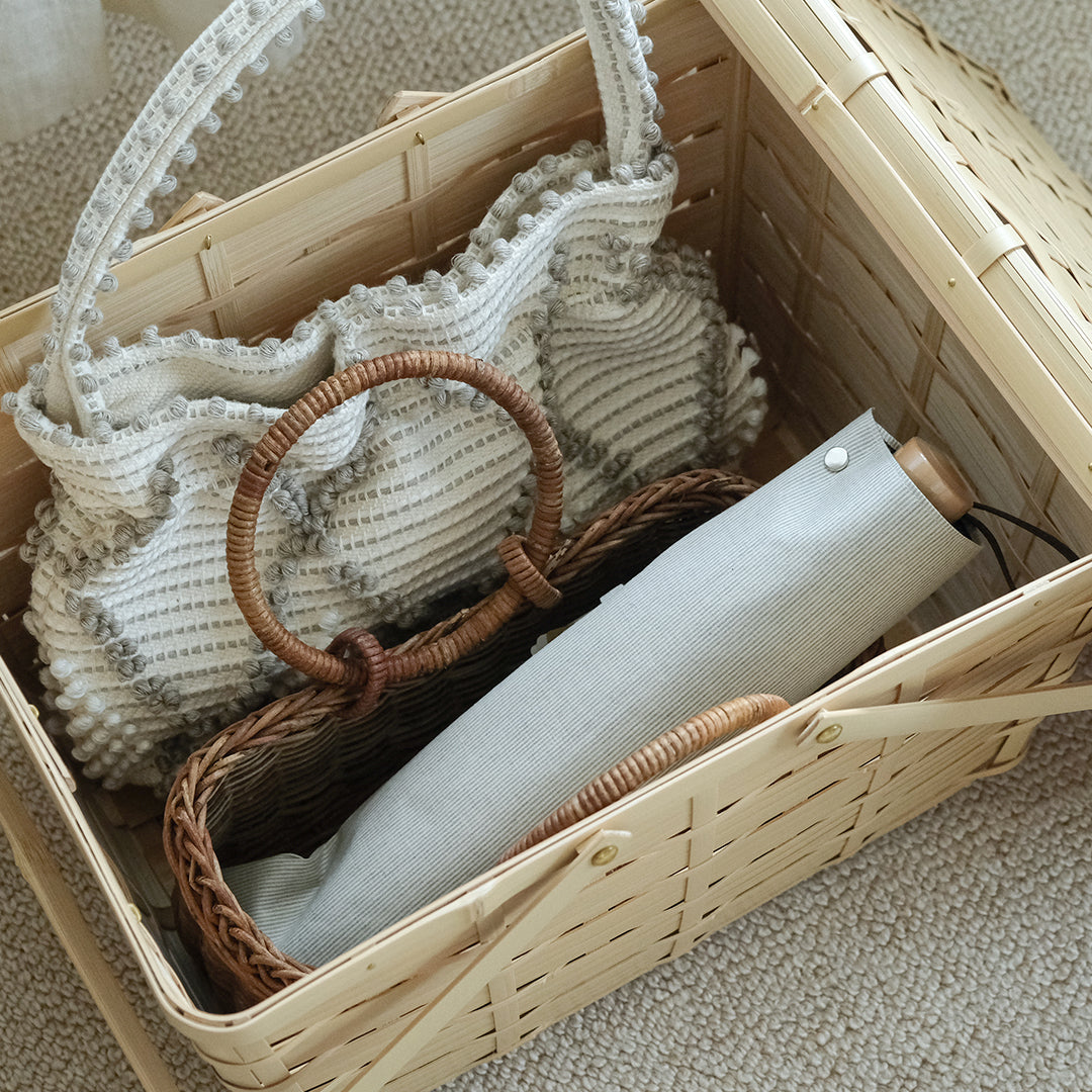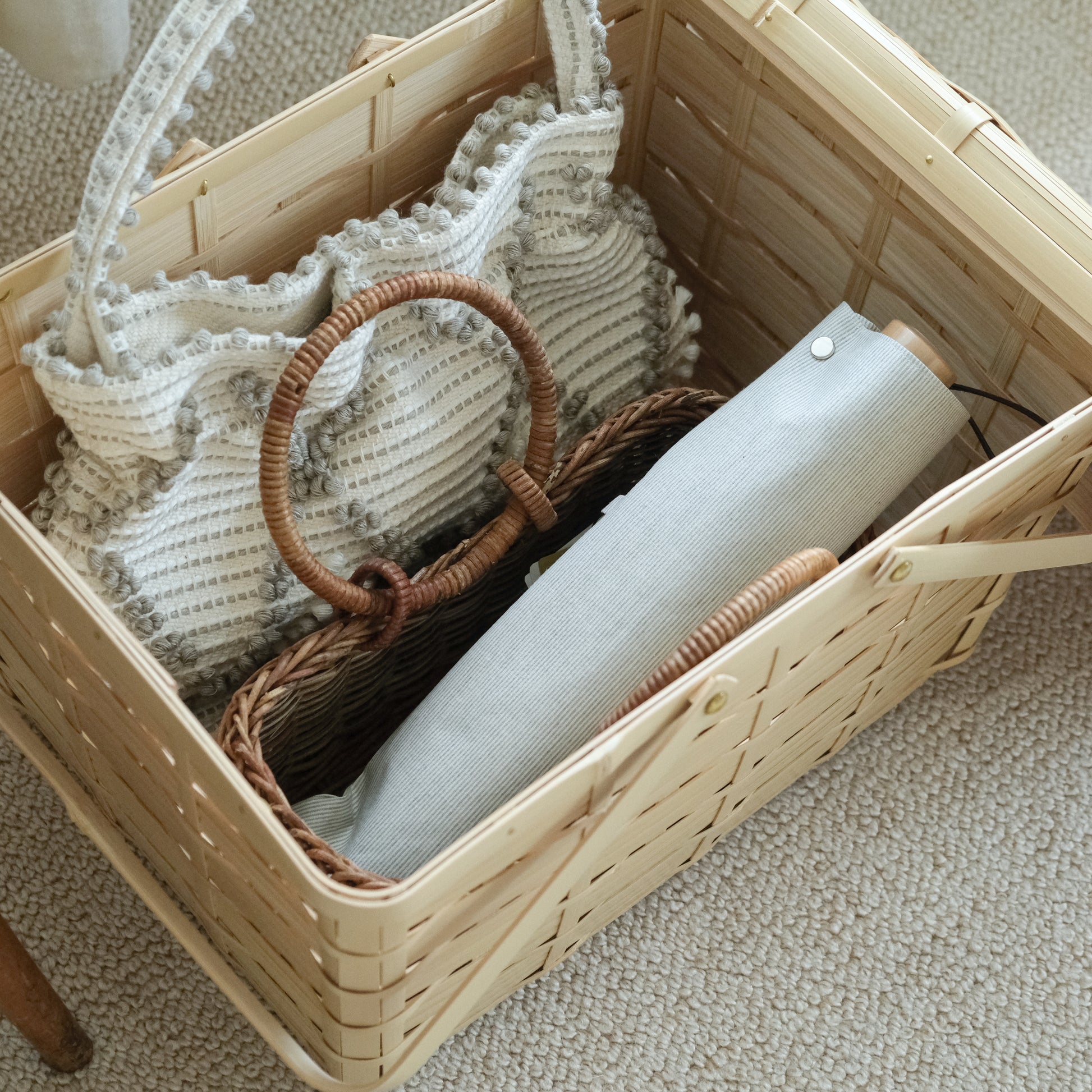 ▲置きっぱなしになりがちな、いつも使うバッグや日傘などを入れて。(バッグ:BUCKET BAG、オーガニックシェード折りたたみ傘55cm、かご:並み編み 台形リング手)