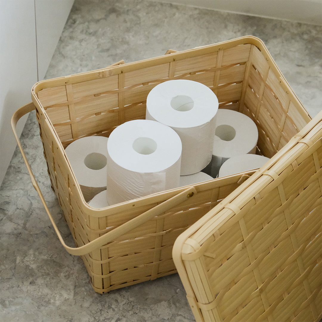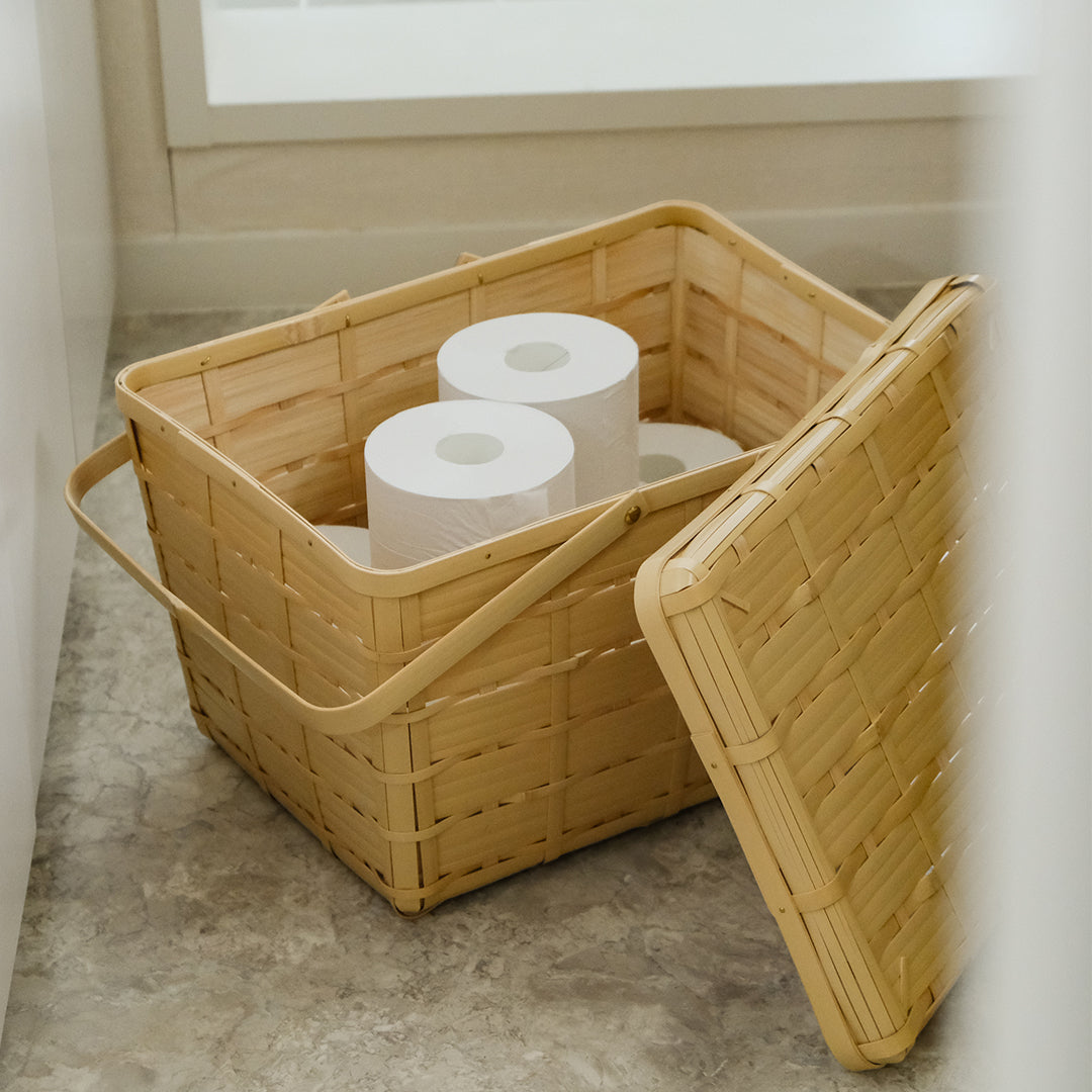 Lは、テーブルクロスやブランケット入れ、3〜4人のピクニックをひとつにまとめて運ぶのによさそうな大きさです。Lサイズはストックしている物をまとめていれるのにもおすすめです。生活感あるものもさっと蓋を閉めてしまえば、すっきりとした空間に。