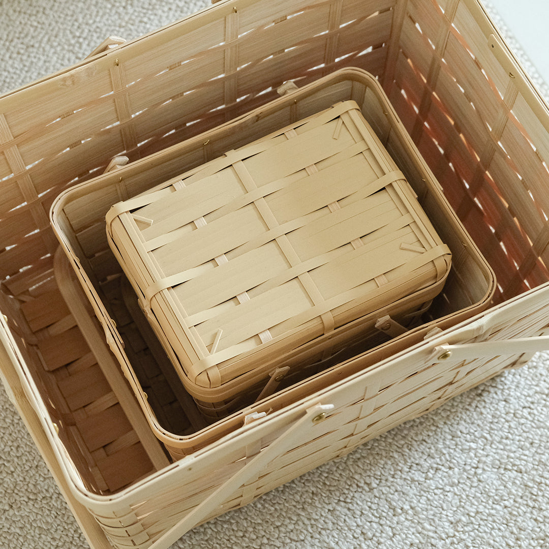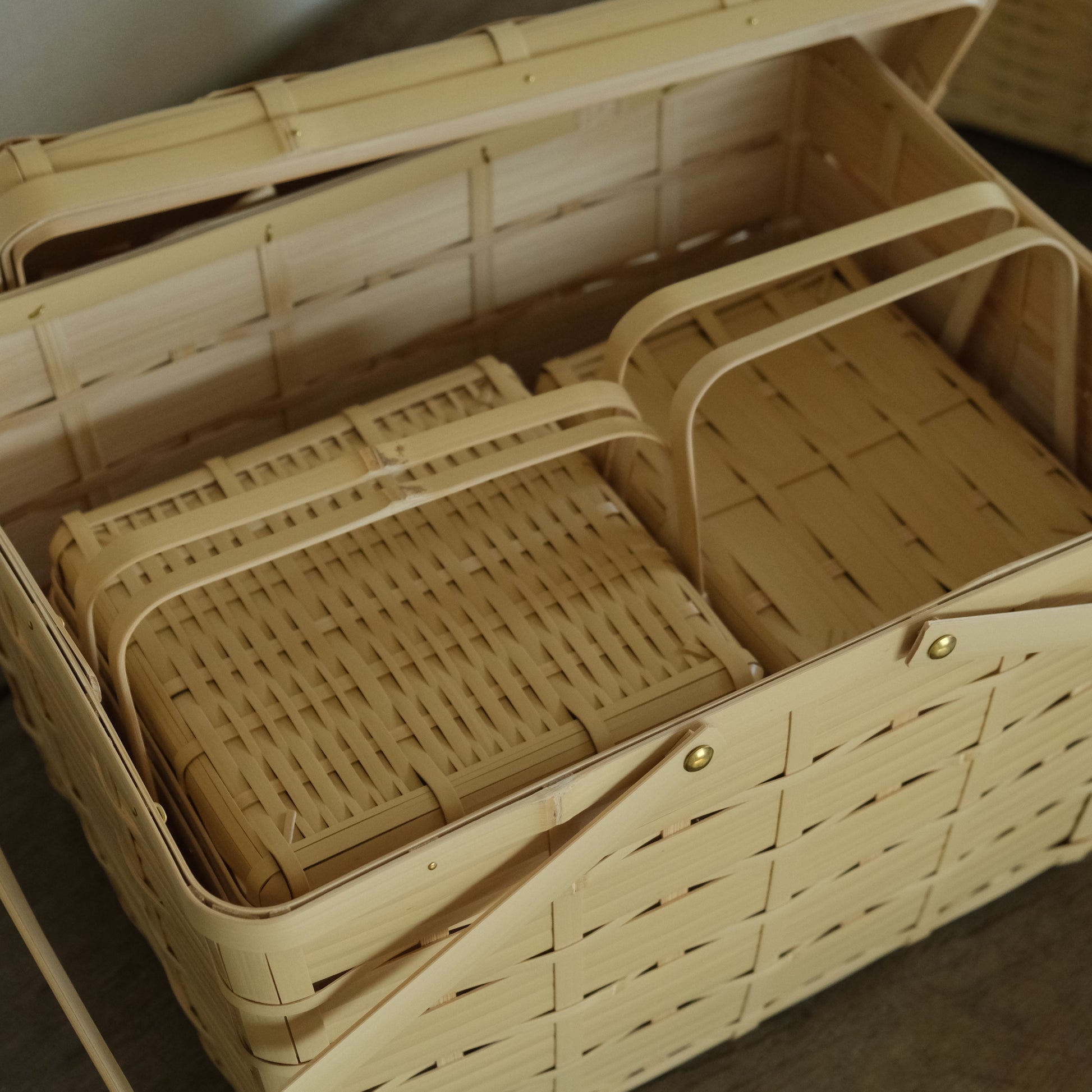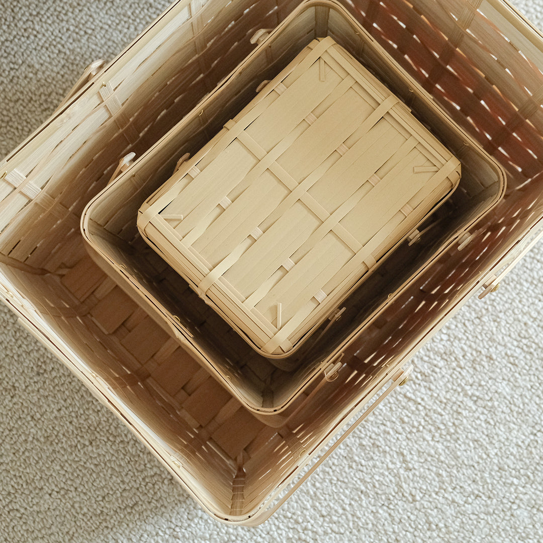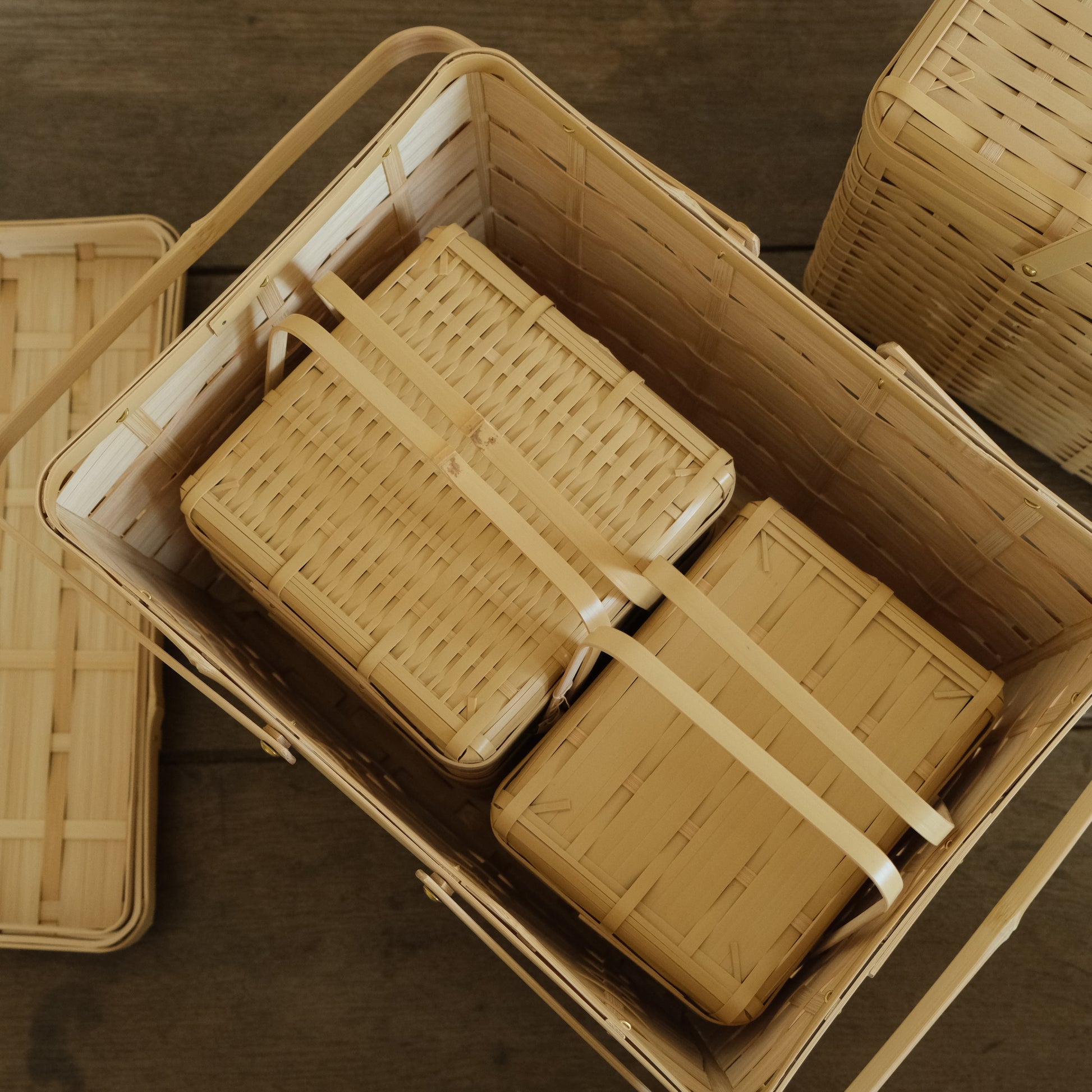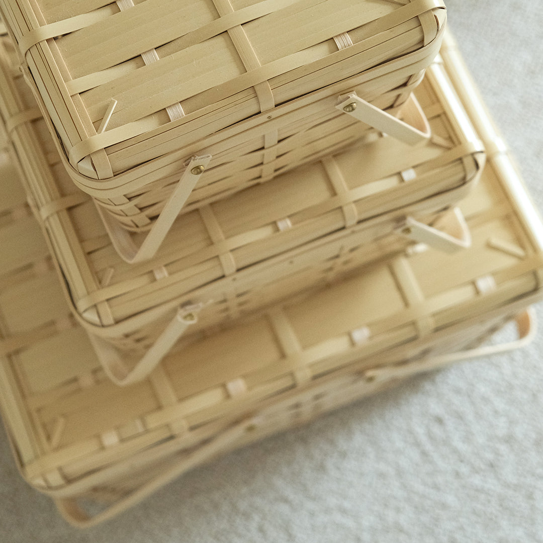 使わない時も重ねて収納しやすい竹かご。Lサイズにはお弁当箱(二段L)とSサイズがぴったりと収納できました。