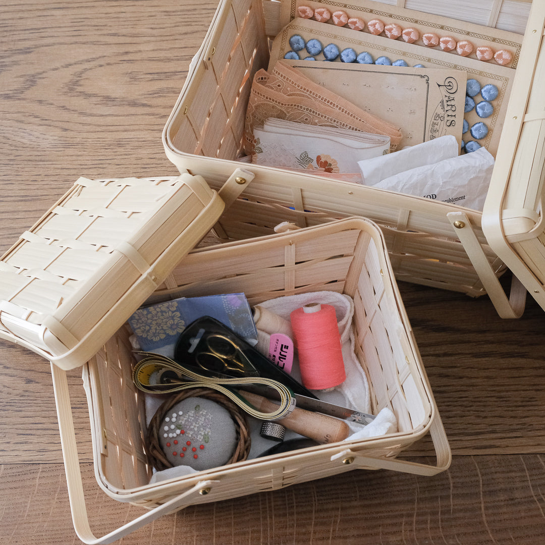すっと角の立ったふたつきのかご。四角をつくる技術を特技とするつくり手福田真理子さんは、しっかりとかごが立ち上がっているかどうかを大切にひとつひとつ箱をつくります。▲サイズ違いで重ねるとこんなかんじです
