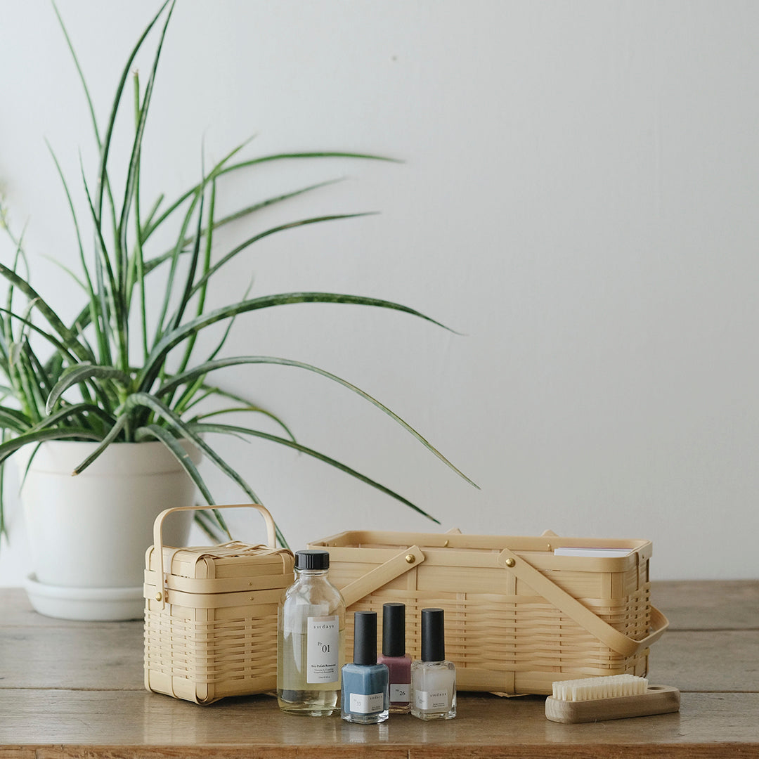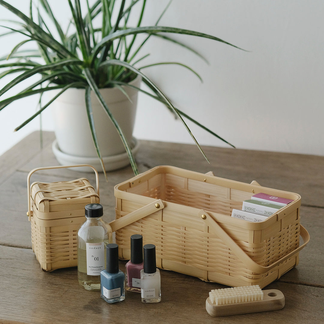 別府竹細工の手法でかごを編む、福田真理子さんによる竹かご。使いやすい大きさの中に職人技が詰まった道具箱をご紹介します。こまごまとしたものの整理ができる、見せて置きたくなる美しいかごに、今回ふたのない取手つきが仲間入りしました。