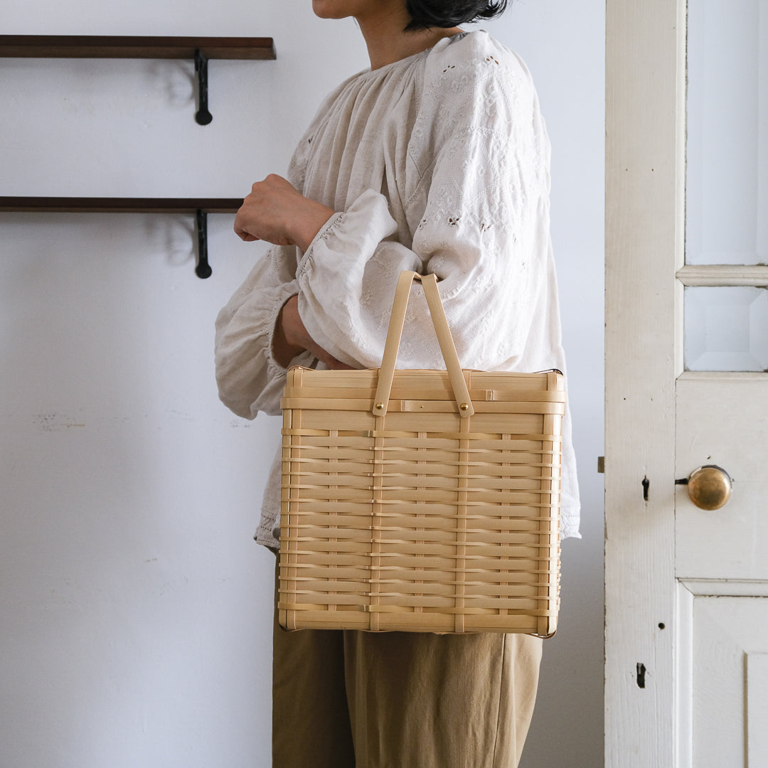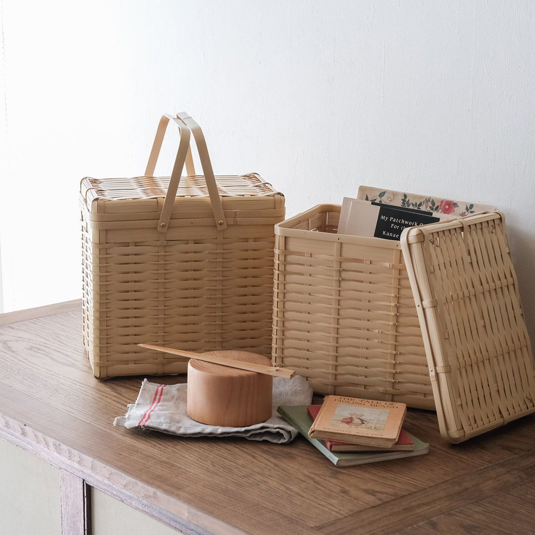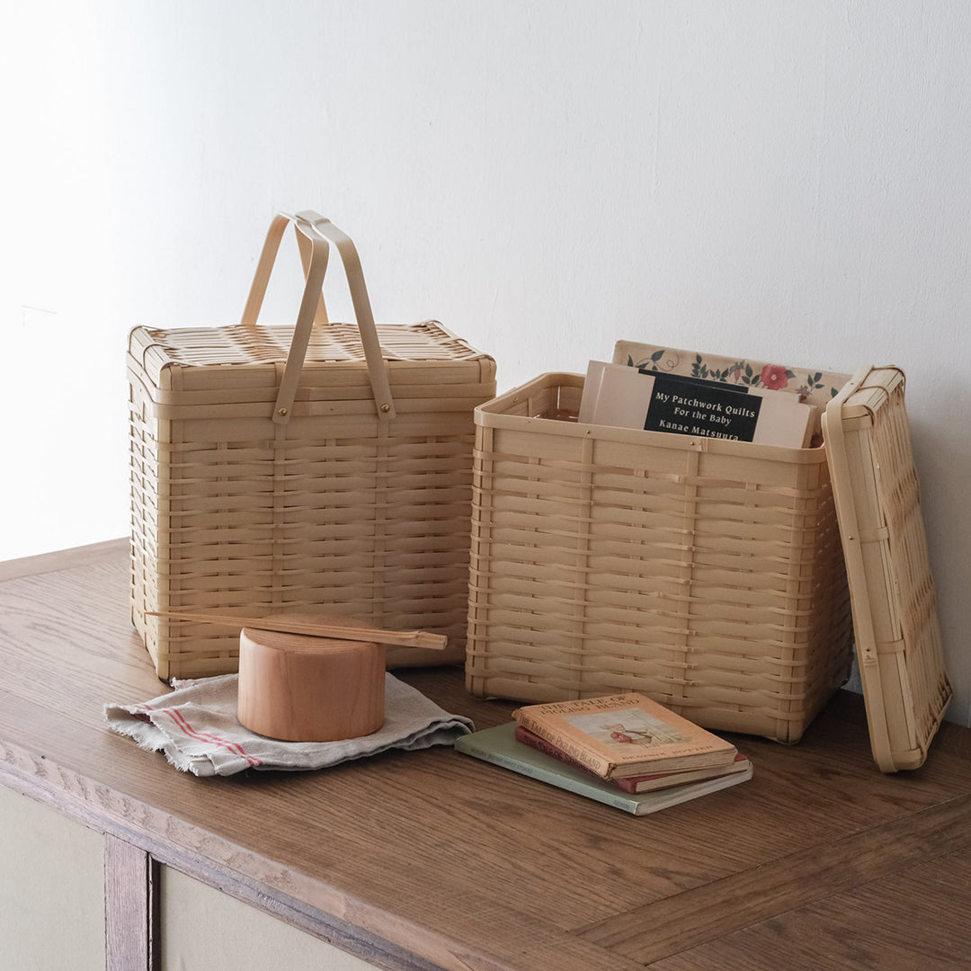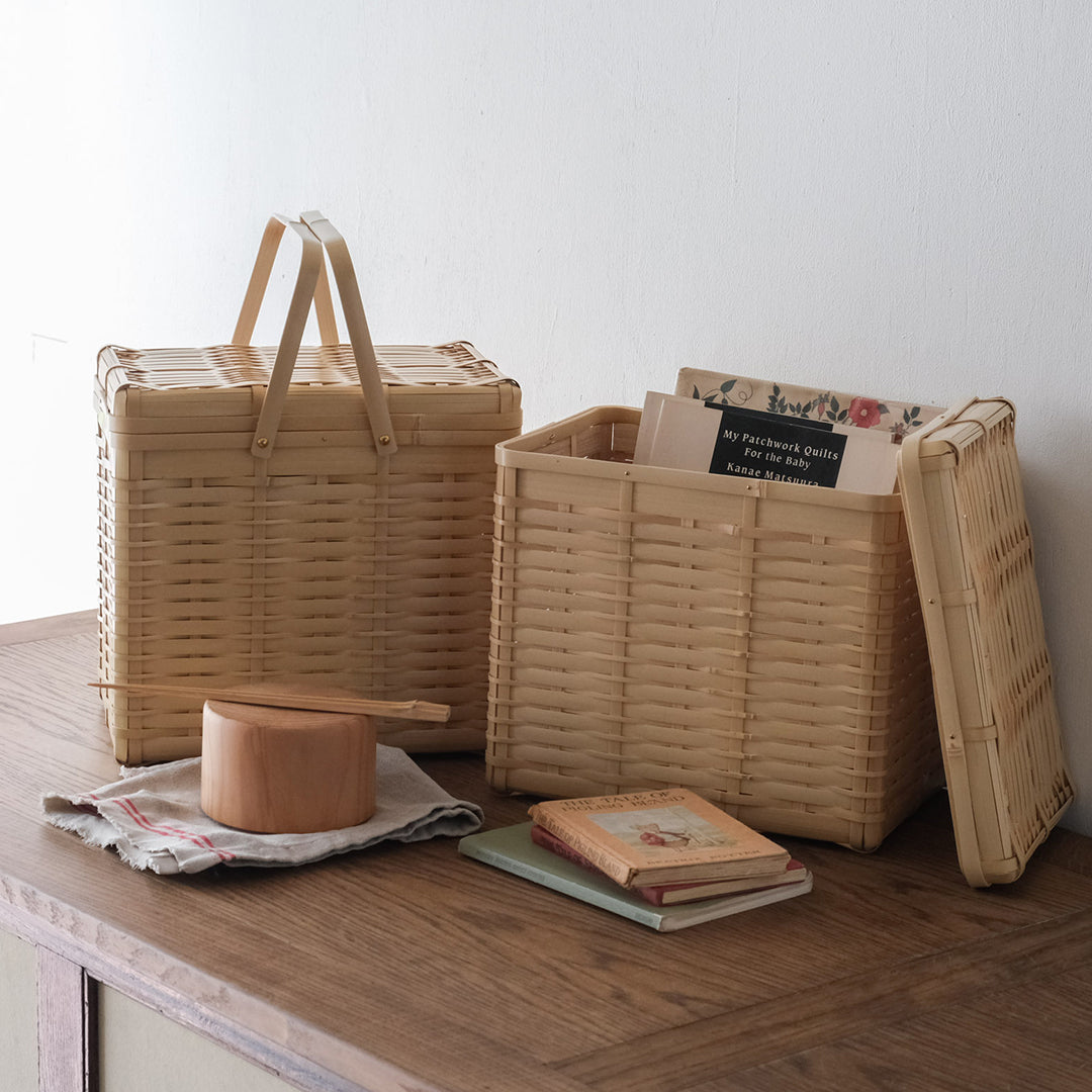 別府竹細工の手法でかごを編む、福田真理子さんによる竹かご。本を収納したり、高さのあるものを持ってピクニックへ。縦長のボックスは色々なシーンで活躍しそうです。きゅっとした編み目、角の立った美しい形は置いてあるだけでさまになります。