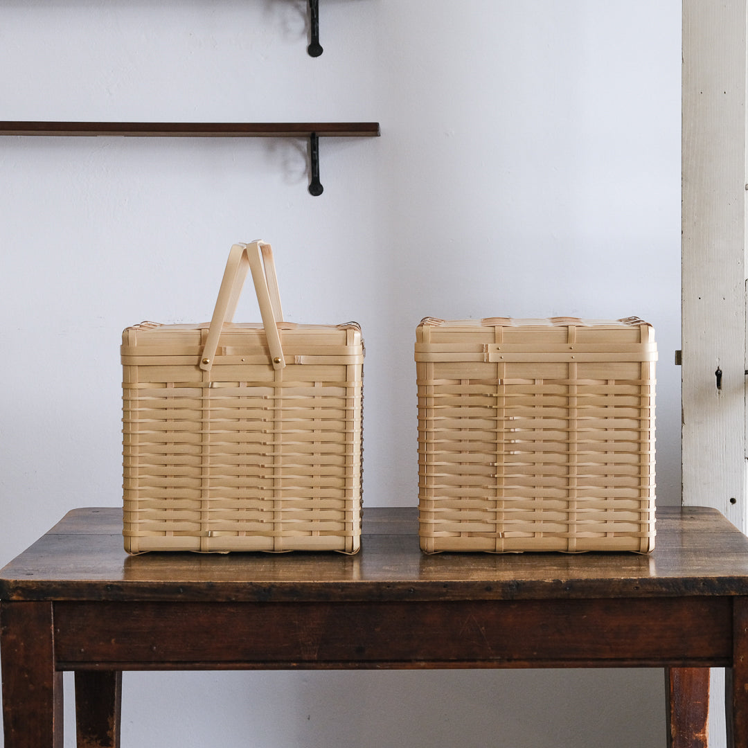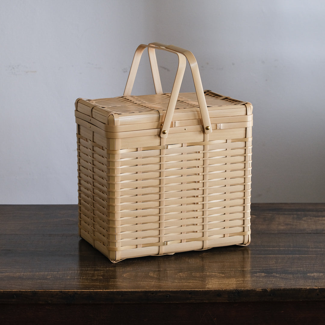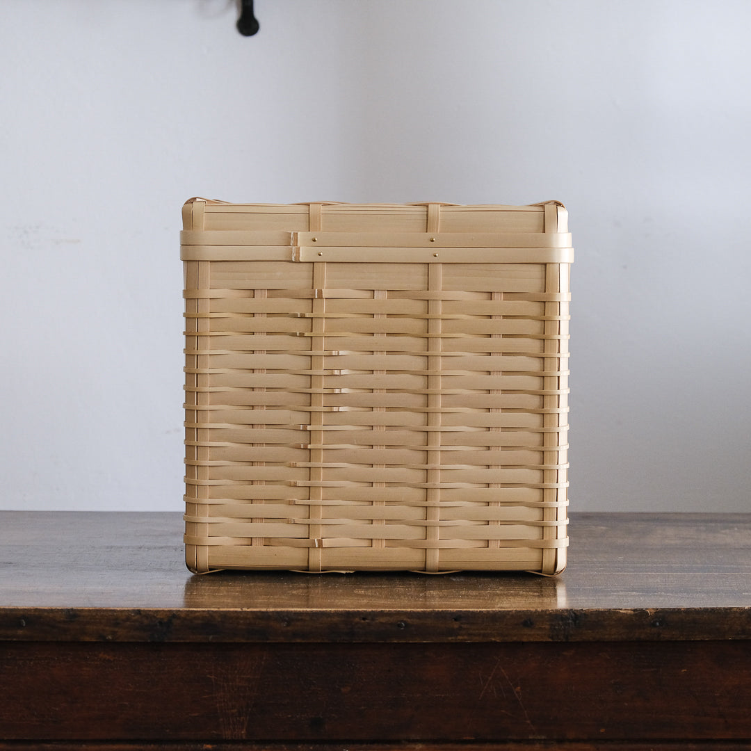 別府竹細工の手法でかごを編む、福田真理子さんによる竹かご。本を収納したり、高さのあるものを持ってピクニックへ。縦長のボックスは色々なシーンで活躍しそうです。きゅっとした編み目、角の立った美しい形は置いてあるだけでさまになります。